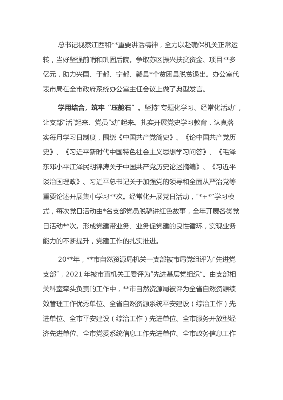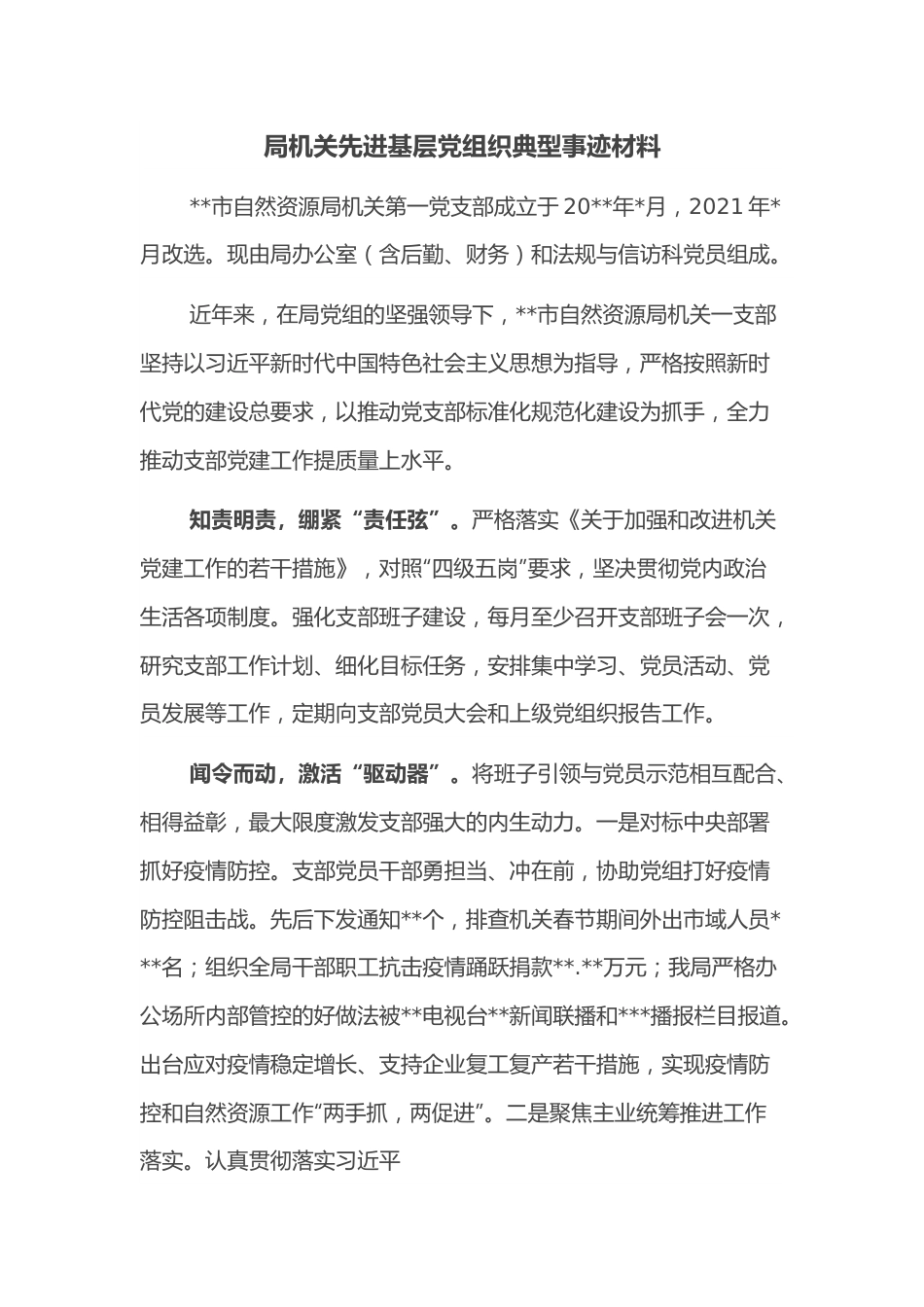 局机关先进基层党组织典型事迹材料**市自然资源局机关第一党支部成立于20**年*月,2021年*月改选。现由局办公室(含后勤、财务)和法规与信访科党员组成。近年来,在局党组的坚强领导下,**市自然资源局机关一支部坚持以习近平新时代中国特色社会主义思想为指导,严格按照新时代党的建设总要求,以推动党支部标准化规范化建设为抓手,全力推动支部党建工作提质量上水平。知责明责,绷紧“责任弦”。严格落实《关于加强和改进机关党建工作的若干措施》,对照“四级五岗”要求,坚决贯彻党内政治生活各项制度。强化支部班子建设,每月至少召开支部班子会一次,研究支部工作计划、细化目标任务,安排集中学习、党员活动、党员发展等工作,定期向支部党员大会和上级党组织报告工作。闻令而动,激活“驱动器”。将班子引领与党员示范相互配合、相得益彰,最大限度激发支部强大的内生动力。一是对标中央部署抓好疫情防控。支部党员干部勇担当、冲在前,协助党组打好疫情防控阻击战。先后下发通知**个,排查机关春节期间外出市域人员***名;组织全局干部职工抗击疫情踊跃捐款**.**万元;我局严格办公场所内部管控的好做法被**电视台**新闻联播和***播报栏目报道。出台应对疫情稳定增长、支持企业复工复产若干措施,实现疫情防控和自然资源工作“两手抓,两促进”。二是聚焦主业统筹推进工作落实。认真贯彻落实习近平总书记视察江西和**重要讲话精神,全力以赴确保机关正常运转,当好坚强前哨和巩固后院。争取苏区振兴扶贫资金、项目**多亿元,助力兴国、于都、宁都、赣县*个贫困县脱贫退出。办公室代表市局在全市政府系统办公室主任会议上做了典型发言。学用结合,筑牢“压舱石”。坚持“专题化学习、经常化活动”,让支部“活”起来、党员“动”起来。扎实开展党史学习教育,认真落实每月学习日制度,围绕《中国共产党简史》、《论中国共产党历史》、《习近平新时代中国特色社会主义思想学习问答》、《毛泽东邓小平江泽民胡锦涛关于中国共产党历史论述摘编》、《习近平谈治国理政》、习近平总书记关于加强党的领导和全面从严治党等重要论述开展集中学习**次。经常化开展党日活动,“*+*”学习模式,每次党日活动由*名支部党员脱稿讲红色故事,全年开展各类党日活动**次。形成党建带业务、业务促党建的良性循环,实现业务能力的不断提升,党建工作的扎实推进。20**年,**市自然资源局机关一支部被市局党组评为“先进党支部”,2021年被市直机关工委评为“先进基层党组织”。由支部相关科室牵头负责的工作中,**市自然资源局被评为全省自然资源绩效管理工作优秀单位、全省自然资源系统平安建设(综治工作)先进单位、全市平安建设(综治工作)先进单位、全市服务开放型经济先进单位、全市党委系统信息工作先进单位、全市政务信息工作优秀单位、全市节能减排考核优秀单位等荣誉。**市自然资源局微信被评为**市政府系统“十佳政务微信”。