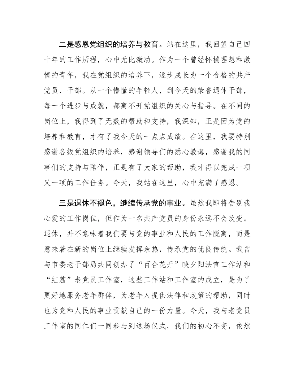 市直机关干部集体荣誉退休仪式发言尊敬的各位领导,同志们:在这辞旧迎新的时刻,市委老干部局和市委离退休干部工委为我们新退休干部精心筹办了这么隆重的集体荣誉退休仪式,我深感荣幸和感动。此时,我有许多话想说,我想用六个字来总结我今天的心情:感谢、感恩、传承。一是感谢组织的关怀与厚爱。回顾我的职业生涯,每一段成长的历程,都离不开党组织的培养和领导的支持。今天的仪式,既是对我们过去辛勤工作的肯定,更是对我们职业生涯的圆满总结。市委老干部局的精心策划,市老年大学和市老体协精彩的表演,使这场仪式不仅形式庄重、内容丰富,更充满了浓浓的人情味。特别是在安排上,组织考虑到我们的实际情况,细致入微,使我们每一位新退休的同志都能就近参加,让我们真切感受到组织对我们的关心和爱护。在这里,我要由衷感谢组织为我们所做的一切,感谢党和人民赋予我们的荣誉和责任。今天,这场温暖人心的荣退仪式,定将永远铭刻在我们的心中。二是感恩党组织的培养与教育。站在这里,我回望自己四十年的工作历程,心中无比激动。作为一个曾经怀揣理想和激情的青年,我在党组织的培养下,逐步成长为一个合格的共产党员、干部。从一个懵懂的年轻人,到今天的荣誉退休干部,每一个进步与成就,都离不开党组织的关心与指导。在不同的岗位上,我得到了无数的帮助和支持,我深知,正是因为党的培养和教育,才有了我今天的一点点成绩。在这里,我要特别感谢各级党组织的培养,感谢领导们的悉心教诲,感谢我的同事们的支持与陪伴,正是有了大家的帮助,我才得以完成一项又一项的工作任务。今天,我站在这里,心中充满了感恩。三是退休不褪色,继续传承党的事业。虽然我即将告别我心爱的工作岗位,但作为一名共产党员的身份永远不会改变。退休,并不意味着我们要与党的事业和人民的工作脱离,而是意味着在新的岗位上继续发挥余热,传承党的优良传统。我曾与市委老干部局共同创办了“百合花开”映夕阳法官工作站和“红荔”老党员工作室,这些工作站和工作室的成立,是为了更好地服务老年群体,为老年人提供法律和政策的帮助,同时也为党和人民的事业贡献自己的一份力量。今天,我与老党员工作室的同仁们一同参与到这场仪式,我们的初心不变,依然肩负着服务社会、关爱他人的责任。退休不代表结束,而是新的开始,我将继续在服务社会、促进和谐的道路上前行。退休是人生旅途中的一个重要里程碑,它标志着我们一段辉煌的事业画上圆满的句号,也开启了人生下半场的新篇章。在未来的日子里,我将继续关注家庭教育,学习成长,不断充实自己,为家人、为社会贡献力量。我们不能延长生命的长度,但可以拓宽生命的宽度,赋予它更多的意义与精彩。就像泰戈尔在《用生命影响生命》一诗中所写:“把自己活成一道光,因为你不知道,谁会借着你的光走出黑暗。”我们每一个人都应该活成一束光,照亮自己,照亮他人,创造更多的温暖与希望。在此,我谨向所有曾经与我并肩作战的同仁们致以崇高的敬意。无论我们身处何地,心中那份对党忠诚、对人民负责的情怀永远不会改变。我坚信,尽管我已离开了我的工作岗位,但作为共产党员的责任和使命将永远陪伴着我。退休,不是停顿,而是向更高的方向迈进,是我继续为党和人民奉献自己力量的新起点。最后,感谢大家,感谢党组织,感谢所有的领导和同志们,是你们让我在这段工作旅程中充满信心和力量。无论我身在何处,心中的那份责任和使命感将始终引导着我前行。我将继续怀揣感恩之心,保持对党和人民的忠诚,始终不忘自己的初心与使命。