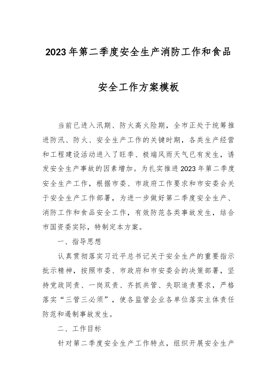 2023年第二季度安全生产消防工作和食品安全工作方案模板当前已进入汛期、防火高火险期,全市正处于统筹推进防汛、防火、安全生产工作的关键时期,各类生产经营和工程建设活动进入了旺季、极端风雨天气已有发生,诱发安全生产事故的因素增加。为扎实推进2023年第二季度安全生产工作,根据市委、市政府工作要求和市安委会关于安全生产工作部署,为进一步做好第二季度安全生产、消防工作和食品安全工作,有效防范各类事故发生,结合市国资委实际,特制定本方案。一、指导思想认真贯彻落实习近平总书记关于安全生产的重要指示批示精神,按照市委、市政府和市安委会的决策部署,坚持党政同责、一岗双责、齐抓共管、失职追责要求,严格落实“三管三必须”,使各监管企业各单位落实主体责任防范和遏制事故发生。二、工作目标针对第二季度安全生产工作特点,组织开展安全生产大检查,深化重点行业领域的安全生产工作,严厉打击违法行为,坚决防范事故发生,确保第二季度安全生产形势稳定向好。三、组织领导为做好市国资委2023年第二季度安全生产、消防和食品安全工作,市国资委决定成立安全生产、消防安全和食品安全工作领导小组。领导小组下设办公室,办公室设在市国资委企业改革科,领导小组主要负责指导、监督各监管企业单位落实安全生产措施;加强安全生产检查工作,并做好应急预案,防止发生重特大生产安全事故。四、工作措施(一)严格督促企业和单位履行主体责任。指导督促企业和单位依法履行安全生产职责,强化安全投入、安全培训、基础管理、应急救援等考核管理,倒逼企业和单位把安全落实到每一个生产环节、每一个工作岗位、每一个操作人员,切实履行企业主体责任。(二)认真履行监督管理责任。由企业和单位负责人带头落实安全生产工作管理职责,组织安全生产大检查,突出开展道路交通、建筑施工、消防安全、地质灾害防治食品安全等重点行业领域安全隐患排查治理,扎实抓好农贸市场、旅游景区(景点)、宾馆饭店等“三合一场所和人员密集场所安全防控。(三)强化部门行业监管责任。各监管企业各单位要严格落实行业监管责任,按照隐患排查、督促检查、整改落实“三个常态化”要求,建立健全安全管理各项工作制度,强化本行业领域安全生产大检查、专项整治和“打非治违”工作,依法查处非法违法生产经营建设行为。(四)扎实推进专家排查隐患。企业和单位要完成安全风险评估,把聘请专家查隐患作为一项重要举措,有效依托专家的专业特长和技术优势,提高隐患排查的针对性专业性、有效性及隐患排查治理的深度和广度,分片区、分项目,重点突出对各行业领域的安全指导,帮助企业和单位查找隐患,加大隐患治理力度。五、重点工作内容(一)进一步统筹发展和安全1.深入学习贯彻党的二十大精神和习近平总书记关于安全生产重要论述。深入贯彻落实党的二十大报告中关于安全生产的重要部署,组织开展专题学习,研究出台落实举措;更好统筹经济发展、疫情防控和安全生产,将学习习近平总书记关于安全生产重要论述作为各企业各单位宣传工作重点,纳入党委(党组)理论学习中心组学习重要内容,至少组织1次集体学习;作为企业和单位应急管理培训的重要内容,着力提高各企业各单位领导干部统筹发展和安全能力。2.加强安全生产培训教育。各监管企业各单位要积极开展各行业领域安全生产全员持证上岗培训工作,分片区组织企业和单位主要负责人、安全管理人员召开工作推进会聘请第三方有资质机构的安全生产专家向参会人员详解全员持证上岗工作要求、注意事项,指导企业结合岗前三级教育培训要求,组织本企业本单位主要负责人、安全管理人员和各行业领域的相关工作人员统一培训、统一考核、统一发证。此外,市国资委将进一步加强主要负责人、安全管理人员、特种作业人员安全资格培训核查力度,全力确保全员持证上岗落实到位。3.持续推进企业安全生产标准化建设。各监管企业要加强对企业安全生产标准化建设的督促检查,严格组织开展达标考评。对安全生产标准化企业的评审、公告、授牌等有关事项,由授权单位组织实施。2021年9月颁布实施的新《安全生产法》将推进企业安全生产标准化建设写入法律条文...