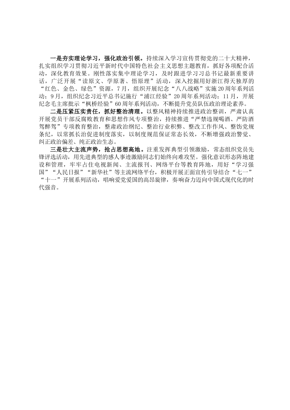 党的二十大报告指出,意识形态工作是为国家立心、为民族立魂的工作。强调,要牢牢掌握党对意识形态工作领导权,全面落实意识形态工作责任制,巩固壮大奋进新时代的主流思想舆论。今年是全面贯彻党的二十大精神的开局之年,是推进改革攻坚、聚力实现中国式现代化的提速之年。当前,我国意识形态领域态势总体是好的,但也要看到,国际上美西方国家对我国西化分化的图谋不会改变,百年变局下外部持续打压遏制渗透不会改变,意识形态领域“黑天鹅”“灰犀牛”的风险现实存在。我们必须紧盯意识形态领域斗争新动向,持续加强网络舆情监控,跟进抓好重大现实问题正面引导,积极用主旋律牢牢占领主阵地,为经济建设发展提供安全稳定环境。一、完成的主要工作年初以来,局党委始终从政治和全局的高度深入领会习近平总书记关于加强意识形态工作的重要指示,深刻领悟政治之年的特殊政治要求,自觉站在践行“两个确立”的高度,积极稳妥推进意识形态领域工作。一是抓紧举旗铸魂捍卫“主阵地”。坚持凡事从政治上看、政治上抓、政治上建,推动意识形态领域工作走深走实、落地见效。持续深入学习宣传贯彻党的二十大精神,扎实开展“读原文、学原著、悟原理”活动,跟进开展年度主题教育,刚性落实每周集中理论学习,及时跟进学习习近平总书记最新重要讲话,用好习近平新时代中国特色社会主义思想教育园区,深挖用好浙江地区特别是习总书记主政浙江期间留下的“红色”“金色”“绿色”宝贵资源,组织优秀党员代表赴“两山理论”发源地浙江安吉余村参观见学,持续教育和引导广大党员始终听党话、跟党走。二是抓严舆论引导唱响“主旋律”。坚持正确政治方向、正确价值导向,做大做强主流思想舆论,进一步唱响主旋律、弘扬正能量、振奋精气神。组织收听收看全国“两会”盛况,紧跟党情国情变化等开展专题教育,牢牢占住电视新闻、主流报刊等教育阵地,观看《思·享2023》《闪耀东方》《这就是中国》等理论时政片,广泛学习宣扬先进典型事迹,持续激发和调动广大党员建功新时代的内在活力动力。三是抓实清理整治打好“主动仗”。坚持严肃教育纯净思想、严格整顿纯洁队伍、严明法纪纯正作风。持续推进政治整训常态化制度化,制定落实《深化党员干部反腐败教育实施计划》,持续加强干部反腐败教育。扎实组织“严禁违规喝酒、严防酒驾醉驾”专项教育整治和重点行业领域整肃治理,观看《警钟长鸣》《安全365》等警示性教育片,深化开展风气整肃治理和纪检监察队伍教育整顿活动,组织参观清廉教育基地,持续打造铁心跟党走的政治环境、愿意献青春的奋斗环境、团结向前进的发展环境。二、当前面临的风险挑战当前,我们正处在由大向强、将强未强的关键时期,稳思想、稳队伍、稳人心形势严峻,加之工作繁重、压力增加,意识形态领域各种“黑天鹅”“灰犀牛”事件随时可能发生,稍有不慎,就有可能陷入被动。结合工作实际,分析当前意识形态领域面临的风险挑战主要有以下3个方面:一是炒作滋扰常态化导致认知偏差。今年是毛泽东同志诞辰130周年、抗美援朝战争胜利70周年,境内外敌对势力一定会借机滋扰炒作、抹黑攻击。从传统常见的戏谑革命传统、抹黑革命领袖、恶搞红色经典,到恶意攻击社会上拆迁、就业、房价等民生问题,试图通过攻击抹黑、散布谣言等方式歪曲事实真相。敌对势力向来擅长无中生有、凭空捏造,试图利用敏感事件、热点问题发酵负面评论、调动负面情绪,面对这些风险,如果我们不及时教育引导,极容易被敌人的错误信息先入为主,对广大人民群众和党员队伍形成认知偏差。二是人员成分年轻化导致思想多元。青年党员和一线工作人员是单位建设发展的中坚力量,是朝气蓬勃、大有作为的一代,但其中大多没有经历过艰苦环境和大风大浪的考验,自认为观念更前卫、思想更多元,实际对党的根本原则和制度认知尚浅,对党的奋斗历史和优良传统知之不多,极易成为敌对势力的错误政治论调的重点欺骗和蛊惑对象。今年5月,笑果文化演员侮辱人民军队在网络上持续发酵,被《人民日报》点名批评,但仍有许多大学生群体在网络上公开为其站台洗白,历史虚无主义对青年群体毒害之深可见一斑。可能存在极个别年轻同志...