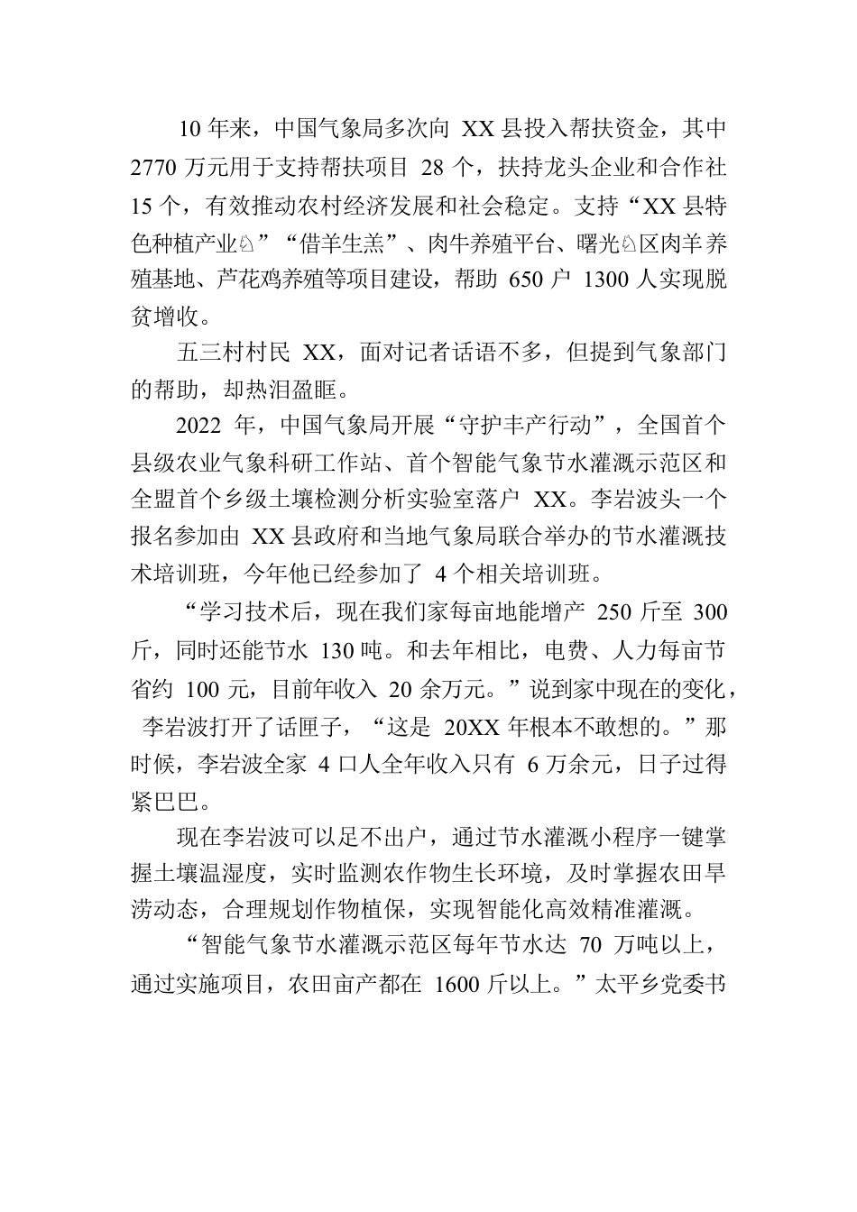 XX2023年,对于XX自治区XX县来说,是个特别的年份。这一年,距离中国气象局开始定点帮扶XX县,已有整整十年。20XX年,这座北方小县与气象结缘;2023年,XX气象一新:农牧业愈加振兴,县域品牌愈加显著,防灾减灾能力愈加提升,民生愈加兴旺。风雨同舟,山海之情。在定点帮扶这十年,XX发生的变化,可以从几个关键词一探究竟。温饱和小康“气象部门的帮助,让我家发生巨大变化。”10年间,太平乡五三村村民XXX见证了在气象部门帮扶下自家的变化。20XX年前,XXX家只承包了少量玉米地,生活勉强温饱。20XX年,她积极响应县里“牧业再造XX”号召带头养牛,可由于缺乏资金,养牛规模一直不大,牛存栏数基本保持在10头左右。20XX年,在中国气象局定点帮扶资金15万元的帮助下,XXX又买了6头母牛和2头小牛,加上刚刚产下的3头牛犊,如今XXX家的牛存栏量较上年同期增加了一倍以上。XXX只是中国气象局定点帮扶的受益户之一。10年来,中国气象局多次向XX县投入帮扶资金,其中2770万元用于支持帮扶项目28个,扶持龙头企业和合作社15个,有效推动农村经济发展和社会稳定。支持“XX县特色种植产业”“借羊生羔”、肉牛养殖平台、曙光区肉羊♘♘养殖基地、芦花鸡养殖等项目建设,帮助650户1300人实现脱贫增收。五三村村民XX,面对记者话语不多,但提到气象部门的帮助,却热泪盈眶。2022年,中国气象局开展“守护丰产行动”,全国首个县级农业气象科研工作站、首个智能气象节水灌溉示范区和全盟首个乡级土壤检测分析实验室落户XX。李岩波头一个报名参加由XX县政府和当地气象局联合举办的节水灌溉技术培训班,今年他已经参加了4个相关培训班。“学习技术后,现在我们家每亩地能增产250斤至300斤,同时还能节水130吨。和去年相比,电费、人力每亩节省约100元,目前年收入20余万元。”说到家中现在的变化,李岩波打开了话匣子,“这是20XX年根本不敢想的。”那时候,李岩波全家4口人全年收入只有6万余元,日子过得紧巴巴。现在李岩波可以足不出户,通过节水灌溉小程序一键掌握土壤温湿度,实时监测农作物生长环境,及时掌握农田旱涝动态,合理规划作物植保,实现智能化高效精准灌溉。“智能气象节水灌溉示范区每年节水达70万吨以上,通过实施项目,农田亩产都在1600斤以上。”太平乡党委书记陆兴伟说。目前,节水灌溉工程通过气象卫星和地面观测数据,实时监测土壤墒情,为3620亩土地精准明确灌溉量,太平乡五三村、赛银花村、曙光村等148户农户直接受益。贫乏和红火20XX年,五三村XXX还是一名回家乡创业的普通大学生,在政府部门和气象部门的双重扶持下,他创办了XX聚美恒果生态农业科技有限公司。“气象部门为我提供资金、温湿度仪器、气象数据等,让我明白了什么叫‘稳稳的幸福’。”10年来,XXX从小小的两座大棚干起,到现在拥有60座大棚,毛桃、樱桃、葡萄、火龙果等水果四季不断。如今,XXX已成为盟级创业带头人、区级劳动模范,聚美恒果四季采摘♘也在2023年初被评为AA级景区。“我们会根据气象信息,针对性地对棚内作物采取防范措施。”XXX说。设施农业平稳运行,不仅得益于及时推送的气象信息,还有气象部门量身定做的“直通式、针对性、智慧型”气象服务——气象部门捐赠的小气候仪可以监测棚内温湿度、光照强度和二氧化碳浓度;棚顶的自动补光灯和手智一体通风器,可智能设定开启时间,在省时省力的同时也保证了产量的提升和效益的最大化。不仅是XXX,XX每个人的日子也是越过越红火。10年来,中国气象局始终将定点帮扶作为一项重要政治任务来抓,把XX人民福祉放在重要地位,从“实”字着手,根据实际情况相继打造“XX气象扶贫模式”,以及“卫星慧眼行动”“风云平安行动”“守护丰产行动”“气候赋能行动”等XX“四大行动”,为XX获得全国脱贫攻坚组织创新奖、全国脱贫攻坚先进集体等荣誉称号贡献力量——帮助贫困人口改建房屋,有效解决住房安全隐患;建设村级农贸市场,有效解决群众农特产品售卖难题,助力实现户均年增收4000元以上;在五三村过水路面建设“连心桥”及配套道路,解决近千名群众出行安全隐患;全国首个“风云地球”县级卫星遥感应用平台“风云地球-XX版”上线,不断提升X...