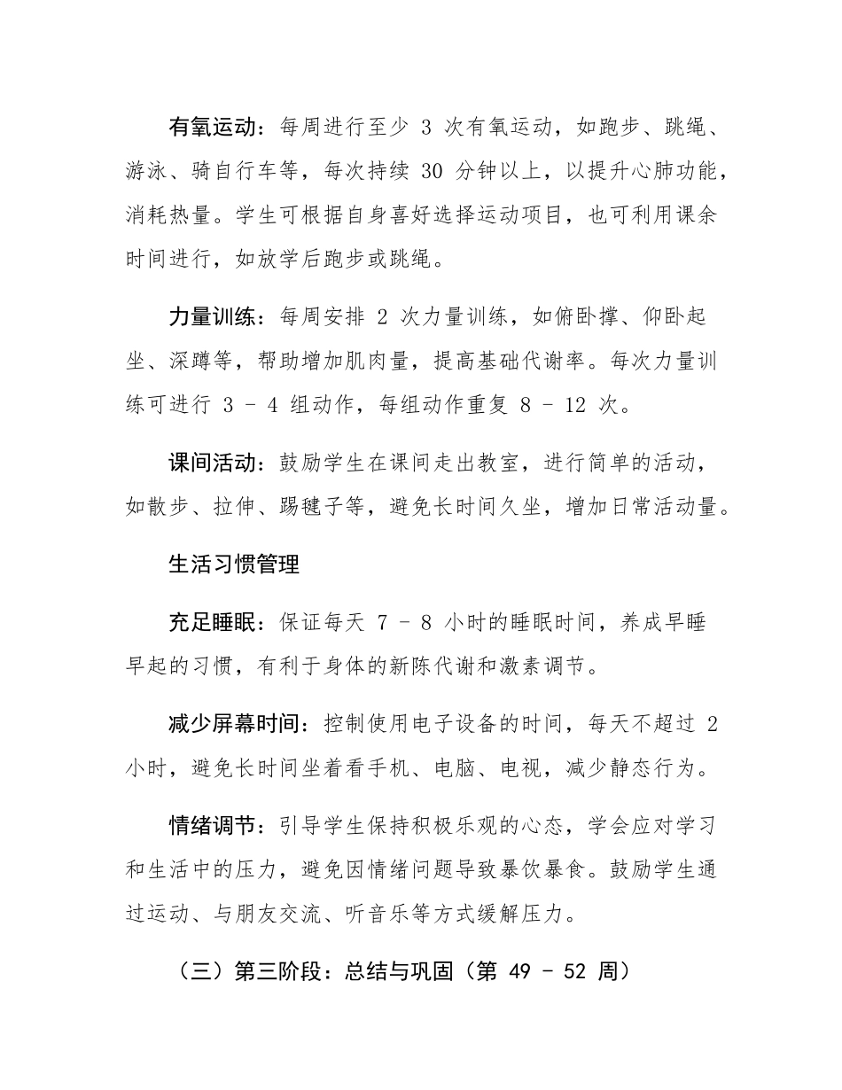 “体重管理年”学生计划一、计划目标在一年内,通过科学合理的饮食、规律的运动以及健康的生活习惯,帮助学生将体重控制在标准范围内,体脂率逐步下降x%-xx%,提升身体素质和健康水平,同时培养良好的生活习惯和自律意识。二、适用人群本计划适用于体重超标、体脂率偏高,希望改善身体状况、提升健康水平的学生群体。三、实施步骤(一)第一阶段:准备与评估(第1-2周)身体数据测量:每位学生记录初始体重、身高、腰围、臀围、体脂率等数据,了解自身身体状况,作为后续对比的基础。健康知识学习:组织学生参加健康知识讲座,内容涵盖营养学基础知识、运动健身原理、体重管理的重要性等,让学生树立正确的健康观念。制定个人计划:学生根据自身情况,在老师或家长的指导下,制定个性化的体重管理计划,明确每周的小目标和具体的饮食、运动安排。(二)第二阶段:全面实施(第3周-第48周)饮食管理均衡膳食:每日饮食遵循“主食+蛋白质+蔬菜+水果”的结构。主食选择粗粮(如燕麦、糙米、全麦面包),减少精细米面的摄入;蛋白质来源包括瘦肉(鸡肉、鱼肉、牛肉)、豆类、蛋类、奶制品;每天保证摄入500克以上的蔬菜和200-300克水果。控制热量:根据学生的年龄、性别、身高、体重和日常活动量,计算每日所需热量,确保摄入热量低于消耗热量,达到减脂目的。建议学生使用饮食记录APP,记录每日食物摄入,以便及时调整。规律进餐:一日三餐定时定量,早餐要吃好,午餐要吃饱,晚餐要吃少,避免暴饮暴食和吃夜宵。运动管理有氧运动:每周进行至少3次有氧运动,如跑步、跳绳、游泳、骑自行车等,每次持续30分钟以上,以提升心肺功能,消耗热量。学生可根据自身喜好选择运动项目,也可利用课余时间进行,如放学后跑步或跳绳。力量训练:每周安排2次力量训练,如俯卧撑、仰卧起坐、深蹲等,帮助增加肌肉量,提高基础代谢率。每次力量训练可进行3-4组动作,每组动作重复8-12次。课间活动:鼓励学生在课间走出教室,进行简单的活动,如散步、拉伸、踢毽子等,避免长时间久坐,增加日常活动量。生活习惯管理充足睡眠:保证每天7-8小时的睡眠时间,养成早睡早起的习惯,有利于身体的新陈代谢和激素调节。减少屏幕时间:控制使用电子设备的时间,每天不超过2小时,避免长时间坐着看手机、电脑、电视,减少静态行为。情绪调节:引导学生保持积极乐观的心态,学会应对学习和生活中的压力,避免因情绪问题导致暴饮暴食。鼓励学生通过运动、与朋友交流、听音乐等方式缓解压力。(三)第三阶段:总结与巩固(第49-52周)数据对比与总结:学生再次测量体重、身高、腰围、臀围、体脂率等数据,与初始数据进行对比,分析体重管理计划的实施效果。组织学生分享自己的经验和收获,共同探讨在计划实施过程中遇到的问题及解决方法。巩固成果:根据总结结果,帮助学生制定长期的健康生活计划,将体重管理过程中养成的良好饮食、运动和生活习惯持续保持下去,防止体重反弹。同时,鼓励学生继续关注自身健康,定期进行身体检查和数据测量。四、监督与激励机制小组监督:将学生分成若干小组,每组推选一名组长,负责监督小组成员的计划执行情况。定期组织小组会议,交流进展,互相鼓励和监督。家长配合:与家长保持密切沟通,让家长了解学生的体重管理计划,监督学生在家中的饮食和运动情况,给予学生支持和鼓励。奖励机制:设立“健康之星”“进步之星”等荣誉称号,对体重管理成效显著、能够坚持执行计划的学生进行表彰和奖励,奖励可以是学习用品、书籍、运动器材等,激发学生的积极性和主动性。免责声明:文稿来源网络整理,版权归原作者所有。若侵犯了您的合法权益,请作者持权属证明与本站联系,我们将及时更正、删除!谢谢!文稿首发平台:www.gongwentang.com(公文堂)