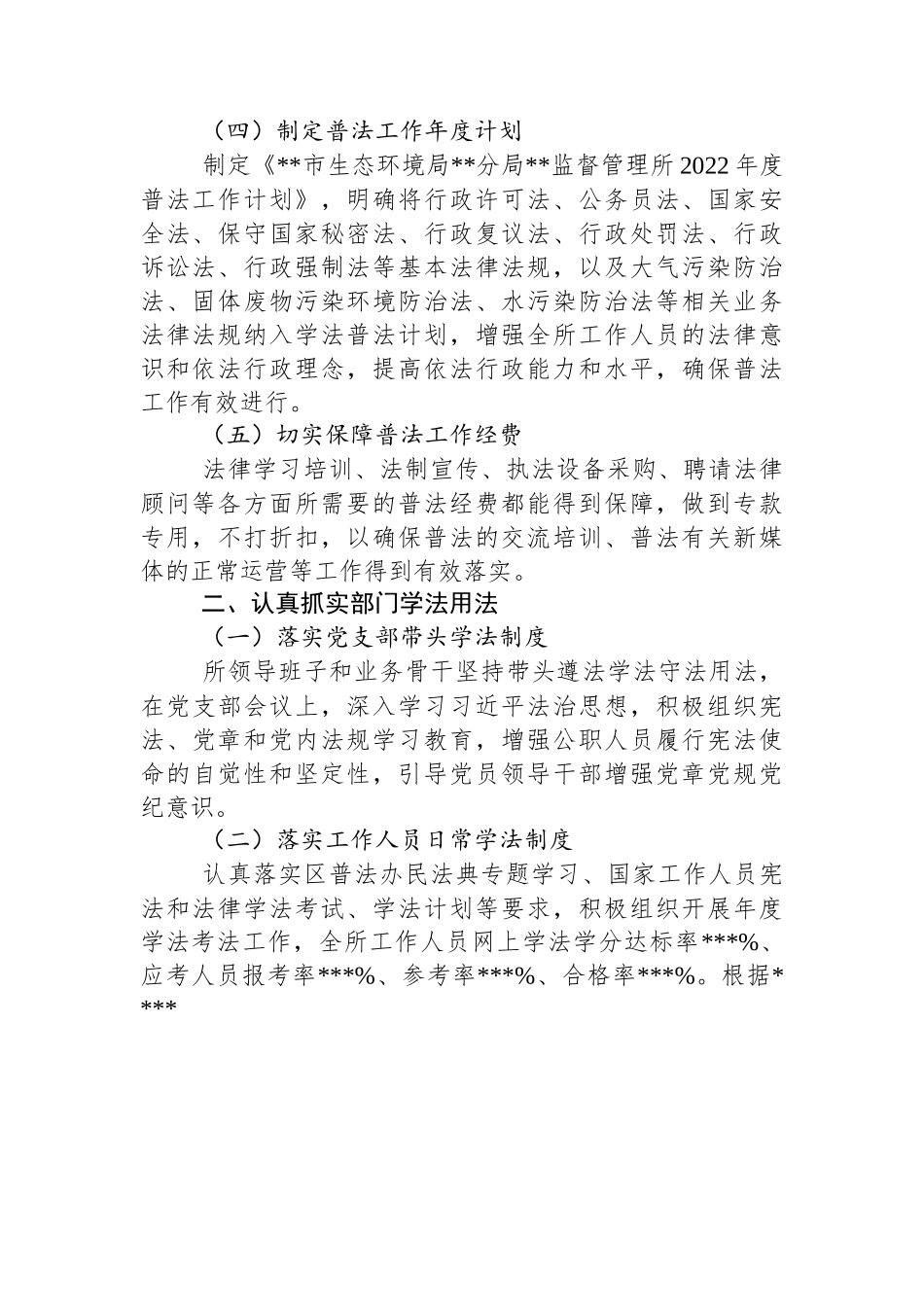 2022年“谁执法谁普法”履职述职报告根据《**市**区人民政府办公室印发的通知》文件要求,结合实际情况,我所对照考核内容认真开展普法工作自查自评,现将有关情况报告如下。一、全面有力抓好组织保障(一)高度重视普法工作所领导班子高度重视普法工作,将普法工作纳入部门工作总体布局,与业务工作同部署、同检查、同落实。建立“谁执法谁普法”“谁主管谁负责”工作责任制通报制度,在所务会上组室负责人及其分管领导汇报与其业务有关的法律法规。所领导定期听取汇报并研究解决存在的困难和问题,同时将普法工作纳入年度工作目标管理,要求各组室及时反馈工作进展情况,确保普法工作务实推进,进一步形成分工明确、各司其职、齐抓共管的有力新格局。(二)健全组织领导机构成立普法工作领导小组,由所长任组长,副所长任副组长,其他领导为成员。领导小组下设办公室,负责日常工作,办公室设在综合组,由综合组负责人任办公室主任兼联络员和宣传员。(三)认真落实普法责任制结合我所实际情况,持续抓好《关于实行国家机关“谁执法谁普法”普法责任制实施意见》落实,全面压实普法责任,确保普法工作责任到人、落实到位,严格按照要求完成普法办等部门单位安排的法治宣传教育工作任务。(四)制定普法工作年度计划制定《**市生态环境局**分局**监督管理所2022年度普法工作计划》,明确将行政许可法、公务员法、国家安全法、保守国家秘密法、行政复议法、行政处罚法、行政诉讼法、行政强制法等基本法律法规,以及大气污染防治法、固体废物污染环境防治法、水污染防治法等相关业务法律法规纳入学法普法计划,增强全所工作人员的法律意识和依法行政理念,提高依法行政能力和水平,确保普法工作有效进行。(五)切实保障普法工作经费法律学习培训、法制宣传、执法设备采购、聘请法律顾问等各方面所需要的普法经费都能得到保障,做到专款专用,不打折扣,以确保普法的交流培训、普法有关新媒体的正常运营等工作得到有效落实。二、认真抓实部门学法用法(一)落实党支部带头学法制度所领导班子和业务骨干坚持带头遵法学法守法用法,在党支部会议上,深入学习习近平法治思想,积极组织宪法、党章和党内法规学习教育,增强公职人员履行宪法使命的自觉性和坚定性,引导党员领导干部增强党章党规党纪意识。(二)落实工作人员日常学法制度认真落实区普法办民法典专题学习、国家工作人员宪法和法律学法考试、学法计划等要求,积极组织开展年度学法考法工作,全所工作人员网上学法学分达标率***%、应考人员报考率***%、参考率***%、合格率***%。根据****年镇党委会议学法计划,我所在镇党委会议上解读今年*月*日实施的《中华人民共和国噪声污染防治法》。(三)落实领导干部述法等制度按照规定严格落实领导干部年度述法制度和出庭应诉等制度,所领导班子按要求在年终大会上进行年度述法述职报告,进一步提升领导干部依法决策、依法行政能力,近三年没有出现行政复议不被支持或行政诉讼案件败诉的情况。(四)落实法治教育培训制度积极组织我所工作人员进行法治教育培训,积极参加市、区组织的法治教育培训班。2022年*月参加市生态环境局组织的生态环境执法视频培训,2022年*月积极组织全所工作人员参加生态环境损害制度改革培训。(五)落实法治文化建设利用基础阵地加强法治宣传,在各村(社区)法制宣传专栏、单位大堂张贴各类宣传画、宣传海报;在门户网站刊登有关法治文化、典型案例内容;在单位党支部活动室设立社会主义核心价值观和法治文化元素设施等法治文化宣传阵地。今年更以新媒体漫画的宣传方式,向社会群众宣传《中华人民共和国噪声污染防治法》的立法背景、噪音分类、政府职能部门的职责等内容。三、切实做好管理和服务对象普法(一)注重做好边执法边普法建立完善执法事前、事中、事后普法制度,把普法工作贯穿执法全过程。注重在执法、管理、服务各环节全过程开展面对面普法宣传,及时解疑释惑,把履行职能、文明管理、严格执法的过程变成生动有效的普法实践活动2022年*月至*月期间,邀请专家通过线上线下两种方式,对辖区内重点VOCs企业进行环保管理和法制培训,重点讲解企...