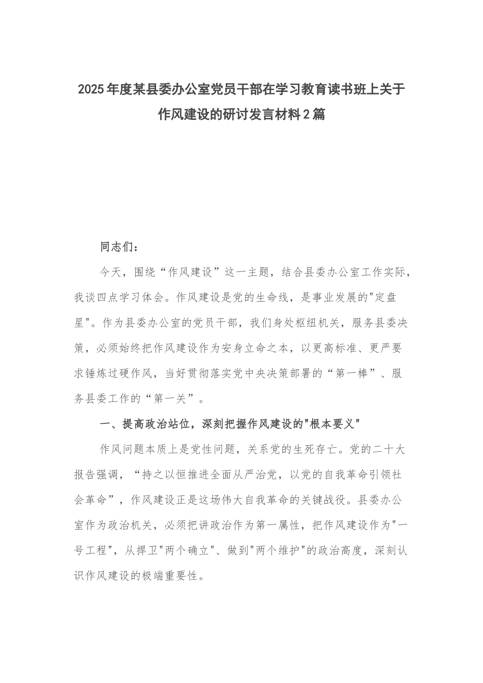 2025年度某县委办公室党员干部在学习教育读书班上关于作风建设的研讨发言材料2篇同志们:今天,围绕“作风建设”这一主题,结合县委办公室工作实际,我谈四点学习体会。作风建设是党的生命线,是事业发展的"定盘星"。作为县委办公室的党员干部,我们身处枢纽机关,服务县委决策,必须始终把作风建设作为安身立命之本,以更高标准、更严要求锤炼过硬作风,当好贯彻落实党中央决策部署的“第一棒”、服务县委工作的“第一关”。一、提高政治站位,深刻把握作风建设的"根本要义"作风问题本质上是党性问题,关系党的生死存亡。党的二十大报告强调,“持之以恒推进全面从严治党,以党的自我革命引领社会革命”,作风建设正是这场伟大自我革命的关键战役。县委办公室作为政治机关,必须把讲政治作为第一属性,把作风建设作为"一号工程",从捍卫"两个确立"、做到"两个维护"的政治高度,深刻认识作风建设的极端重要性。(一)作风建设是践行初心使命的"试金石"。县委办公室直接服务县委总揽全局、协调各方,承担着"三服务"核心职能。我们的作风如何,直接影响县委决策部署的贯彻落实质量。近年来,县委办公室以"零差错、零延误、零失误"为目标,建立"首问负责制""限时办结制"等工作机制,在疫情防控、防汛抗旱等急难险重任务中,连夜起草紧急通知、协调调度各方资源,展现了过硬的作风。但对照新时代新要求,仍存在"文来文往"机械执行、"案头文件"空转空悬等现象,必须持续纠治。(二)作风建设是净化政治生态的"净化器"。县委办公室作为县委的"前沿阵地",作风好坏直接影响全县党员干部的价值取向。我们坚持把政治建设放在首位,开展"重温入党誓词""政治生日"等活动,强化党性淬炼。但也要清醒看到,个别干部仍存在"本位主义""小圈子"等倾向,必须坚决纠治"七个有之",践行"五个必须",以优良作风涵养风清气正的政治生态。(三)作风建设是推动高质量发展的"动力源"。当前,我县正处于"产业升级攻坚期""乡村振兴突破期""民生改善关键期",县委办公室必须把作风建设与中心工作深度融合。在招商引资中,我们建立"项目专员"制度,全程跟踪服务;在乡村振兴中,组建"一线调研组",深挖群众"急难愁盼"。但面对新形势新任务,仍存在"政策传达慢半拍""基层诉求回应不及时"等问题,必须强化"今天再晚也是早,明天再早也是晚"的效率意识。二、直面问题挑战,切实增强作风建设的"现实针对性"近年来,县委办公室以"作风建设深化年"为契机,开展"四不两直"督查、建立"红黄蓝"效能台账,推动作风持续好转。但对照"五个坚持"要求,仍存在一些突出问题,必须刀刃向内、自我革命。(一)思想根子上的"病灶"仍未根除。个别干部存在"三种心态":一是"躺平心态",认为"办公室就是养老单位",缺乏进取心;二是"看客心态",对县委决策"只传不达""只督不办";三是"功利心态",重"显绩"轻"潜绩",搞"材料出政绩"。比如,在起草领导讲话时,有的同志热衷于堆砌新名词,对群众关心的就业、教育等民生问题避重就轻。(二)能力素质上的"短板"依然突出。面对数字化转型要求,部分干部存在"本领恐慌"。有的同志对"大数据平台""智慧城市"等新事物一知半解,在起草数字经济相关文件时"依葫芦画瓢";有的同志对新媒体舆论引导能力不足,在应对网络舆情时"失语""迟语"。(三)工作作风上的"顽疾"时有反弹。形式主义、官僚主义出现新变种。比如,在督查检查中,存在"层层加码""重复调研"现象;在办文办会中,有的部门把"层层把关"变成"层层推诿",导致文件"空转"、会议"拖堂"。(四)纪律规矩上的"红线"仍有触碰。个别干部存在"小节无害"的麻痹思想。有的同志对"三公"经费使用打"擦边球",超标准接待;有的同志在档案管理中"粗枝大叶",导致涉密文件泄露风险。这些问题,究其根源,在于"四个不够":理论武装不够深入,导致政治站位不高;宗旨意识不够牢固,导致群众观念淡薄;斗争精神不够强劲,导致担当作为不足;纪律约束不够严格,导致自我要求放松。三、创新实践路径,全面提升作风建设的"治理效能"作风建设必须常抓不懈、久久为功。县委办公室将重点实施"四大行动",推动作风建设走深走实。(一)实施"铸魂赋能"行动,...