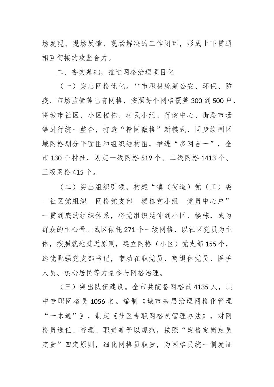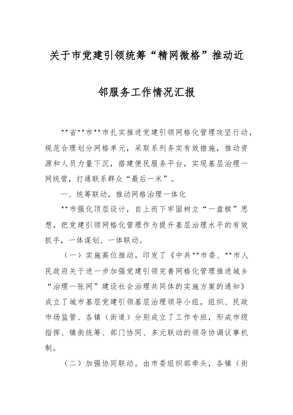 关于市党建引领统筹“精网微格”推动近邻服务工作情况汇报**省**市**市扎实推进党建引领网格化管理攻坚行动,规范合理划分网格单元,采取系列务实有效措施,推动资源和人员力量下沉,搭建便民服务平台,实现基层治理一网统管,打通联系群众“最后一米”。一、统筹联动,推动网格治理一体化**市强化顶层设计,自上而下牢固树立“一盘棋”思想,把党建引领网格化管理作为提升基层治理水平的有效抓手,一体谋划、一体联动。(一)实施高位推动。印发了《中共**市委、**市人民政府关于进一步加强党建引领完善网格化管理推进城乡“治理一张网”建设社会治理共同体的实施方案的通知》成立了城市基层党建引领基层治理领导小组,组织、民政市场监管、各镇(街道)分别成立了工作专班,形成市级指挥、镇街统筹、部门协同、多元联动的领导协调议事机制。(二)加强协同联动。由市委组织部牵头,各镇(街道)组织实施,相关职能部门共同参与,定期召开工作调度会,健全深化市、镇(街道)、社区三级联动机制,召开党建引领网格化管理业务培训会,建立“一包一单一会”制度,走访调研、掌握进度,分解任务、阶段推进,形成具体问题现场发现、现场反馈、现场解决的工作闭环,形成上下贯通相互衔接的攻坚合力。二、夯实基础,推进网格治理项目化(一)突出网格优化。**市积极统筹公安、环保、防疫、市场监管等已有网格,按照每个网格覆盖300到500户,将城市社区、小区楼栋、村民小组、行政中心、街路市场等进行统一整合,打造“精网微格”新模式,同步绘制区域网格划分平面图和组织结构图,推进“多网合一”,全市130个村社,划定一级网格519个、二级网格1413个、三级网格415个。(二)突出组织引领。构建“镇(街道)党(工)委—社区党组织—网格党支部—楼栋党小组—党员中心户”一贯到底的组织体系,将党组织延伸到小区、楼栋,成为群众的主心骨。城区依托271个一级网格,以社区党员为主体,按照就地就近原则,建立网格(小区)党支部155个,选优配强党支部书记,带动在职党员、离退休党员、医护人员、热心居民等力量参与网格治理。(三)突出队伍建设。全市共配备网格员4135人,其中专职网格员1056名。编制《城市基层治理网格化管理“一本通”》,制定《社区专职网格员管理办法》,对网格员选任、管理、职责等予以规范,按照“定格定岗定员定责”四定原则,细化网格员职责,为网格员统一制发证件和胸牌,实行周例会、月走访、季遍访、年慰问制度。组织召开专职网格员见面会、颁发聘书,实施挂牌上岗。(四)突出平急共建。注重“平时服务”,发挥网格员经常巡、随时访、及时记、实时报作用,发现和收集网格内民情,部门、街道、社区之间建立快速响应处理机制形成群众想呼、能呼,部门快应、必应的闭环处理。确保“急时应急”,在职党员干部、热心居民、新就业新业态群体、社会组织等“兼职网格员”下沉一线,到所居住社区、小区认领任务、开展服务,确保平时有效服务,急时应急处突,“平急”转换有序。(五)突出制度激励。坚持平时考核与年度考核相结合的方式,街道(镇)组织安排,村(社区)具体组织实施,对网格员进行综合考核,推动网格工作高效运转。开展“最美网格员”评选,通过户外大屏幕、电视台、网站微信公众号等广泛宣传网格员优秀事迹,对年度考核优秀的网格员给予一定物质奖励,对符合条件的社区网格员竞选社区“两委”成员、推选“两代表一委员”给予一定的政策扶持,调动网格员工作积极性。三、提升服务,推动更多资源要素下沉(一)服务阵地多点覆盖。**市实施社区、网格党群服务中心(站)提升改造攻坚行动,构建“镇(街道)党群服务中心+社区党群服务中心+网格党群服务站”的工作矩阵,形成覆盖全域的党群服务网络。延伸社区服务手臂,按照“15分钟服务圈”的选址要求,依托小区党支部活动阵地、物业服务用房、驻区单位共享空间等资源,在全市创建10个“家邻里”网格党群服务示范站,实行“驻点式”办公制,打造集网格党建、服务、管理于一体的社区“近邻服务”平台。(二)服务主体多元参与。坚持重心下移、力量下沉服务触角下延,以群众需求为导向,持续做实街道...