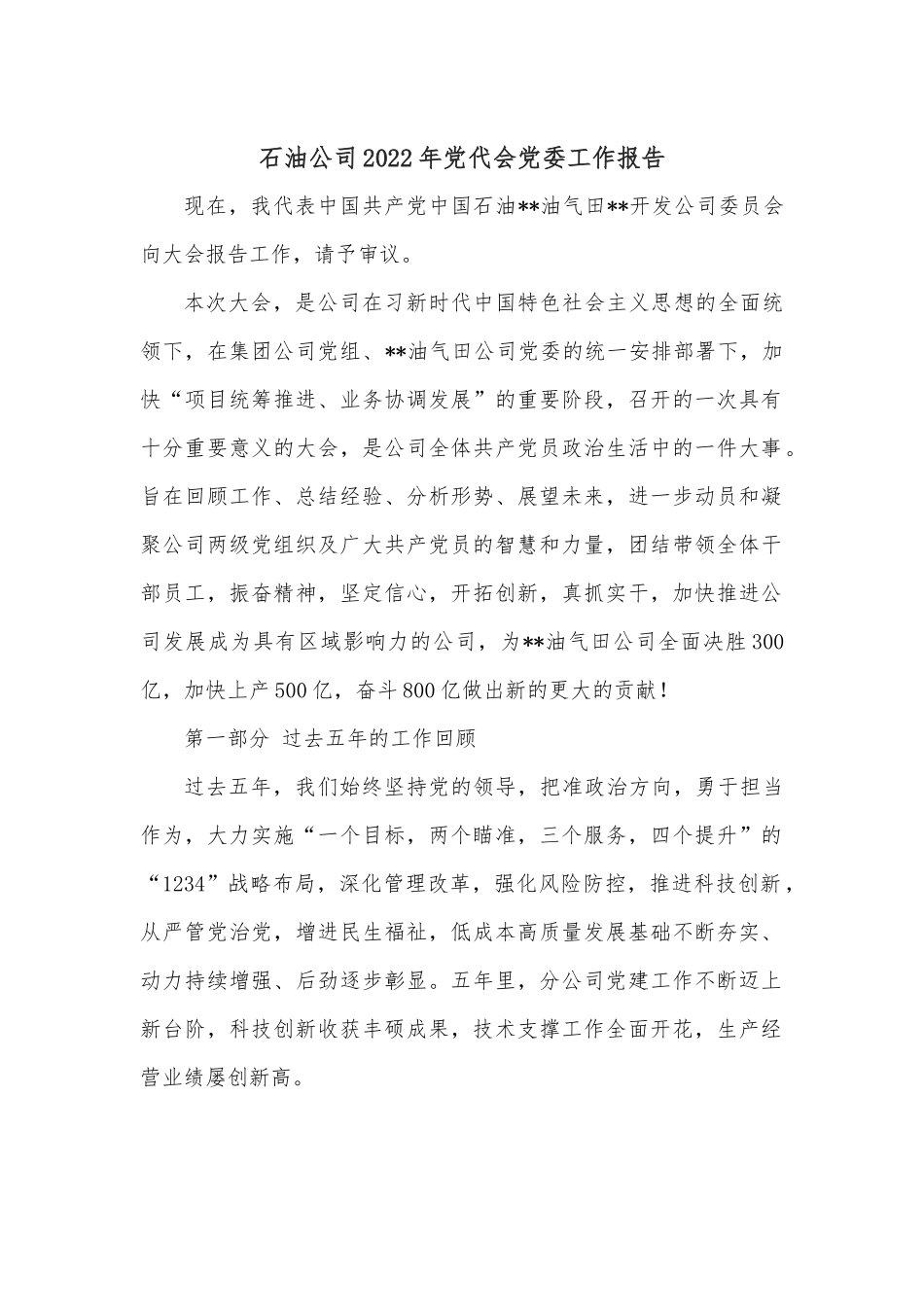 石油公司2022年党代会党委工作报告现在,我代表中国共产党中国石油**油气田**开发公司委员会向大会报告工作,请予审议。本次大会,是公司在习新时代中国特色社会主义思想的全面统领下,在集团公司党组、**油气田公司党委的统一安排部署下,加快“项目统筹推进、业务协调发展”的重要阶段,召开的一次具有十分重要意义的大会,是公司全体共产党员政治生活中的一件大事。旨在回顾工作、总结经验、分析形势、展望未来,进一步动员和凝聚公司两级党组织及广大共产党员的智慧和力量,团结带领全体干部员工,振奋精神,坚定信心,开拓创新,真抓实干,加快推进公司发展成为具有区域影响力的公司,为**油气田公司全面决胜300亿,加快上产500亿,奋斗800亿做出新的更大的贡献!第一部分过去五年的工作回顾过去五年,我们始终坚持党的领导,把准政治方向,勇于担当作为,大力实施“一个目标,两个瞄准,三个服务,四个提升”的“1234”战略布局,深化管理改革,强化风险防控,推进科技创新,从严管党治党,增进民生福祉,低成本高质量发展基础不断夯实、动力持续增强、后劲逐步彰显。五年里,分公司党建工作不断迈上新台阶,科技创新收获丰硕成果,技术支撑工作全面开花,生产经营业绩屡创新高。分公司党委按照党的建设总要求,充分发挥了把方向、管大局、保落实的作用,全面推进基层党支部标准化建设,持续巩固“大党建”工作格局;坚持压紧压实“两个责任”和“一岗双责”,广大党员干部和员工群众始终牢记使命初心,坚守意识形态阵地,弘扬石油精神新时代内涵,推动党建与中心工作深度融合,坚持提质增效与主题教育常态化,圆满完成既定工作目标,超额完成分公司考核指标,党建引领作用得到充分发挥,各项工作取得跨越式进步。科技创新屡获殊荣。依托六大主体技术优势,形成特色技术71项,累计开展国家级、股份公司级、分公司级课题510项,获集团公司、四川省省部级奖励16项,其中首次获得集团公司技术发明一等奖和集团公司首届专利奖金奖;专利授权49件,软件著作权8项,主持编撰著作6部,集团公司自主创新重要产品9项,内部优势产品3项。始终把握科技项目研发、中试生产放大、油气生产需求有效结合的原则,准确定位研究方向,形成了26项符合油气田开发需求、科技含量高、能解决实际问题的科技成果,成果现场应用□井次;作为分公司唯一单位,连续3年获得集团科技转化创效奖励,共计□万元。技术支撑彰显实力。紧跟开发热点,逐步建立起常态化支撑工作体系,以及专家引领、多专业协作的高效工作模式;重点围绕分公司天然气开发生产以及重点上产区块勘探开发支撑保障,构建了涵盖常规气-页岩气多领域,井筒-集输-净化全流程,设计-建设-运行多阶段的天然气开发生产全方位立体支撑体系。五年来,在气田地面动态跟踪评价、腐蚀防护与站场完整性管理、净化厂运行保障、规划及制度编制、油田开发增产稳产等方面提供全方位支撑。地面支撑工作任务响应率达100%,年平均技术支撑保障考核指标完成率达120%以上。深化改革成效显著。立足新时代“油公司”发展模式,扎实推动“小机关、大部门、大共享、专业化支撑”改革,以分公司—研究所(中心)—班组三级管理为架构,重点开展职能职责和内部业务的优化整合,积极推行“大岗位”管理,不断提高岗位工作效率,解决结构性人员缺失问题,实现劳动生产率稳步提升和科研生产高质量发展同步有效联动。调整中试实验所职能职责,实现科研实验中心服务专业化研究所的共享运行模式,发挥整体集中优势。持续优化绩效考核,切实推进分公司属机构分级分类管理,建立完善精准激励机制,形成“考核重实绩、收入凭贡献”的薪酬分配制度,激发员工干事激情与活力。持续推进合规管理,进一步优化修订规章制度体系,强化规章制度全生命周期监控,形成持续改进的良性循环机制,弥补管理缺位,夯实管理基础,逐步建立起组织架构合理、开放包容、运行高效、充满生机活力的管理体系。标准工作成绩斐然。依托国际与国内的九个标准化技术机构优势,完成ISO20729:2017等3项国际标准的制定,在ISO/TC193的贡献率位居首位;完成国家标准制修订28项,完善以天然气产品标准GB178...
