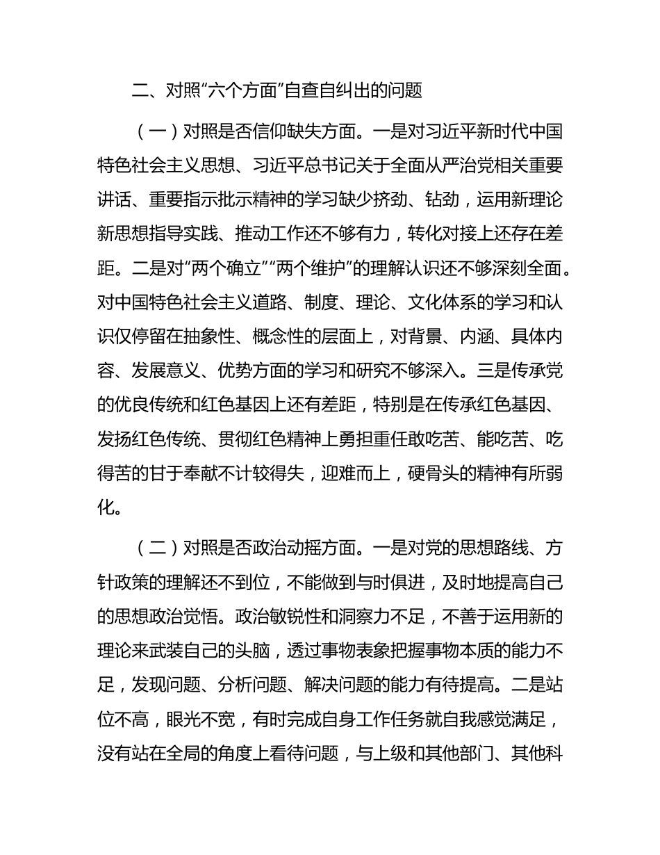 2023年纪检监察干部教育整顿“六个方面”个人检视剖析报告根据xx区纪检监察干部队伍教育整顿部署安排,现对照六个方面进行检视剖析如下。一、自查自纠的开展情况党的十八大以来,以习近平同志为核心的党中央高度重视纪检监察干部队伍建设,从“提高履行职责能力和水平”,到“经常打扫庭院,清除害群之马”,再到“接受最严格的约束和监督”,习近平总书记多次就此提出明确而具体的要求,言之谆谆、嘱之殷殷。这次开展全国纪检监察干部队伍教育整顿活动,是以习近平同志为核心的党中央着眼锻造堪当新时代新征程重任的高素质纪检监察干部队伍作出的重大决策部署,充分体现了党中央对纪检监察干部队伍的高度重视、严格要求和关心厚爱。近期通过参加相关会议、学习有关讲话、文件及会议精神,我对开展纪检监察干部队伍教育整顿的重要意义、目的要求、时间安排等有了新的认识,我将珍惜这次自我提升、自我锻造机会,从严要求自己,做到“铸忠诚,不断提高政治站位;深检视,严格要求一言一行;强本领,努力提升工作质效”,努力把教育整顿成果转化为推动党风政风监督工作的强大动力,以实实在在的工作实效实绩迎接教育整顿的检验。二、对照“六个方面”自查自纠出的问题(一)对照是否信仰缺失方面。一是对习近平新时代中国特色社会主义思想、习近平总书记关于全面从严治党相关重要讲话、重要指示批示精神的学习缺少挤劲、钻劲,运用新理论新思想指导实践、推动工作还不够有力,转化对接上还存在差距。二是对“两个确立”“两个维护”的理解认识还不够深刻全面。对中国特色社会主义道路、制度、理论、文化体系的学习和认识仅停留在抽象性、概念性的层面上,对背景、内涵、具体内容、发展意义、优势方面的学习和研究不够深入。三是传承党的优良传统和红色基因上还有差距,特别是在传承红色基因、发扬红色传统、贯彻红色精神上勇担重任敢吃苦、能吃苦、吃得苦的甘于奉献不计较得失,迎难而上,硬骨头的精神有所弱化。(二)对照是否政治动摇方面。一是对党的思想路线、方针政策的理解还不到位,不能做到与时俱进,及时地提高自己的思想政治觉悟。政治敏锐性和洞察力不足,不善于运用新的理论来武装自己的头脑,透过事物表象把握事物本质的能力不足,发现问题、分析问题、解决问题的能力有待提高。二是站位不高,眼光不宽,有时完成自身工作任务就自我感觉满足,没有站在全局的角度上看待问题,与上级和其他部门、其他科室业务沟通少、联系少、配合少,与整体联动、团结协作的要求相比还有较大差距。三是政治敏锐性不强,对一些敏感问题特别是涉及意识形态领域的复杂性、长期性认识不足,警惕性有所弱化,不善于发现问题,不善于从政治上分析情况,没有从讲政治的高度对待新时代党的治疆方略。(三)对照是否放弃原则方面。一是没有把思想政治历练放在一个重要的位置,对学习的重要性认识不足、感受不深、要求不严,以致宗旨观念有所淡化,还没有真正在思想上、行动上树立起全心全意为群众服务的公仆意识,党员模范的带头作用不够,自己的思想行动与党的要求还有一定的距离。二是缺乏斗争精神,在个别工作中害怕担风险,畏惧挑战,缺乏坚韧不拔的意志,缺少攻坚克难的锐气,不愿碰硬,怕担责任,怕担风险。工作繁重、压力大的时候,首先想到的是怎样尽快完成任务,只讲速度和效率,一定程度忽略了质量和标准,降低了工作标准和要求。三是面对社会和网络上的一些负面行为或者言论,把自己当作“吃瓜群众”,认为只要是自己不转发、不附和,不随波逐流就可以了,没有站在讲政治、讲纪律、讲规矩角度,及时批判、揭露和驳斥,没能完全做到“在党护党”。(四)对照是否作风不正方面。一是对业务知识的学习不够深入,学习内容单一,综合学习不够,特别是在时间上难以长期保证。满足现状,对业务知识的掌握求精求深不够。二是担当精神不够,工作作风不够扎实,开拓创新意识不够。对待工作有时不够主动、积极,只满足于完成领导交付的任务,在工作中遇到难题,有时会等待领导的指示,未把工作做实、做深、做细,特别是有很多的工作都是想做又不敢做,畏畏缩缩,缺乏果断和胆量。三是自我要求不严...