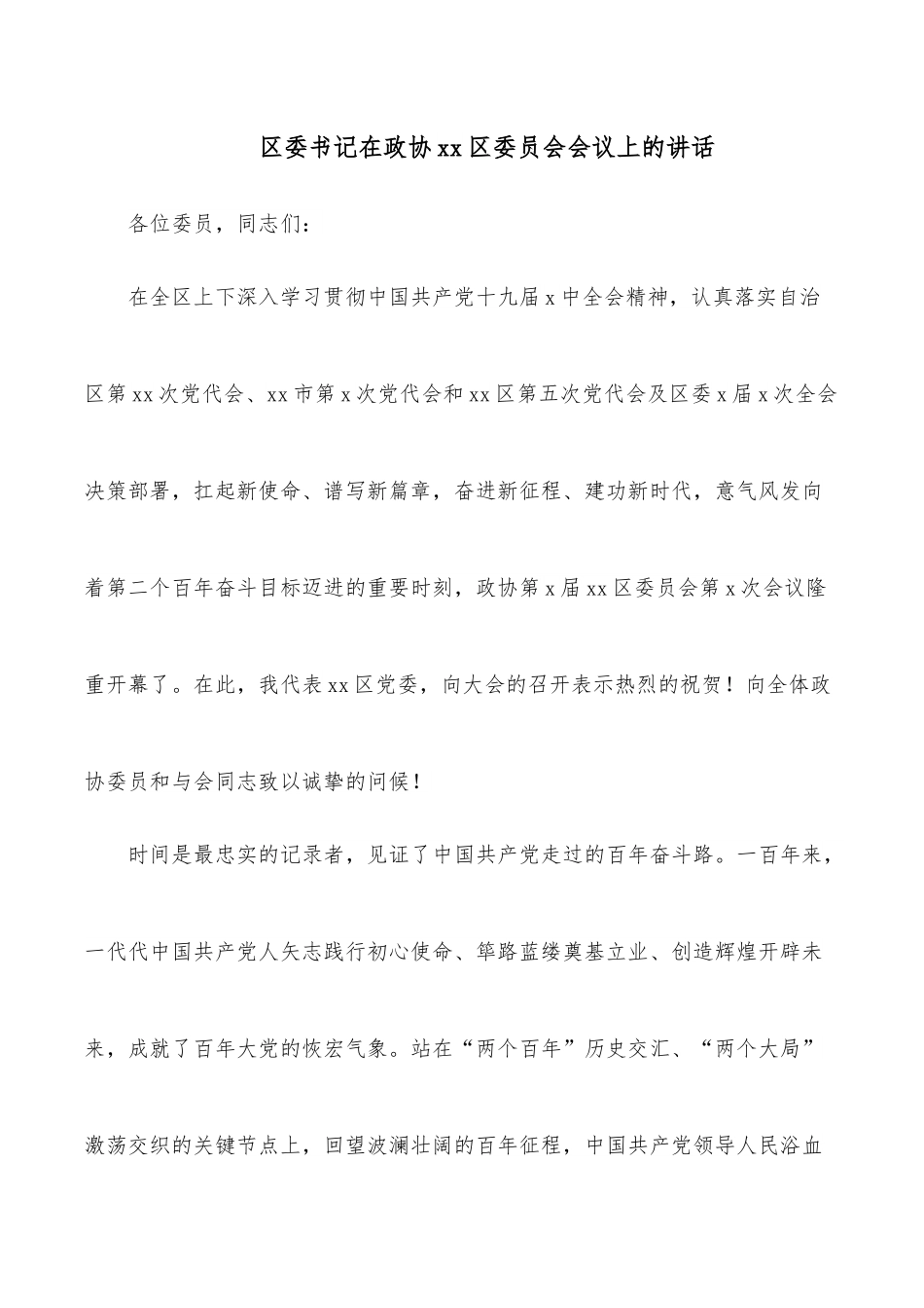 区委书记在政协xx区委员会会议上的讲话各位委员,同志们:在全区上下深入学习贯彻中国共产党十九届x中全会精神,认真落实自治区第xx次党代会、xx市第x次党代会和xx区第五次党代会及区委x届x次全会决策部署,扛起新使命、谱写新篇章,奋进新征程、建功新时代,意气风发向着第二个百年奋斗目标迈进的重要时刻,政协第x届xx区委员会第x次会议隆重开幕了。在此,我代表xx区党委,向大会的召开表示热烈的祝贺!向全体政协委员和与会同志致以诚挚的问候!时间是最忠实的记录者,见证了中国共产党走过的百年奋斗路。一百年来,一代代中国共产党人矢志践行初心使命、筚路蓝缕奠基立业、创造辉煌开辟未来,成就了百年大党的恢宏气象。站在“两个百年”历史交汇、“两个大局”激荡交织的关键节点上,回望波澜壮阔的百年征程,中国共产党领导人民浴血奋战、百折不挠,创造了新民主主义革命的伟大成就;自力更生、发愤图强,创造了社会主义革命和建设的伟大成就;解放思想、锐意进取,创造了改革开放和社会主义现代化建设的伟大成就;自信自强、守正创新,创造了新时代中国特色社会主义的伟大成就。实践充分证明,没有中国共产党就没有新中国,就没有中华民族伟大复兴,中国共产党没有辜负历史和人民的选择!站在“两个百年”历史交汇、“两个大局”激荡交织的关键节点上,回看党的十八大以来的奋斗历程,以习近平同志为核心的中共中央,以伟大的历史主动精神、巨大的政治勇气、强烈的责任担当,推动党和国家事业取得历史性成就、发生历史性变革,引领中华民族伟大复兴进入了不可逆转的历史进程;习近平总书记坚持把握时代大势、聆听人民心声、回应现实需要,提出了一系列原创性的治国理政新理念新思想新战略,科学回答了中国之问、世界之问、人民之问、时代之问,创立了习近平新时代中国特色社会主义思想,实现了马克思主义中国化新的飞跃。我们更加深切体悟到,确立习近平同志党中央的核心、全党的核心地位,确立习近平新时代中国特色社会主义思想的指导地位,对新时代党和国家事业发展、对推进中华民族伟大复兴历史进程,具有决定性意义。“两个确立”,确立的是全党的“顶梁柱”、人民的“主心骨”,确立的是思想的“定盘星”、行动的“指南针”,确立的是进行伟大斗争、赢得最终胜利的政治保证;“两个维护”,是维护党和国家最高利益的根本所在,是巩固红色江山的制胜法宝,是对中华民族前途命运的最大负责。迈上实现第二个百年奋斗目标和中华民族伟大复兴的历史新征程,我们要坚决捍卫“两个确立”,自觉践行“两个维护”,紧跟习近平总书记步伐,走好新的赶考之路,赢得更大胜利和荣光!各位委员,同志们!习近平总书记对xx发展高度重视、亲切关怀,亲自为我们擘画了建设新时代中国特色社会主义壮美xx和共圆复兴梦想的蓝图,亲自赋予我们“在推动边疆民族地区高质量发展上闯出新路子,在服务和融入新发展格局上展现新作为,在推动绿色发展上迈出新步伐,在巩固发展民族团结、社会稳定、边疆安宁上彰显新担当”的“四个新”的光荣使命,饱含着对xx的殷切期望,也是我们一切工作的战略指引、行动指南、奋斗目标。自治区第xx次党代会围绕“牢记领袖嘱托、勇担历史使命”这一主题主线,明确了当前及今后一个时期的主要目标任务。我们要坚决扛起光荣使命,完整准确全面贯彻新发展理念,更加坚决彻底地转方式、调结构、增动能,在改革创新、推动民族地区高质量发展上争当表率;准确把握实现高水平自立自强这一本质特征,进一步畅通国内国际经济循环,在服务和融入粤港澳大湾区建设新发展格局上争做示范;准确把握社会主义现代化的深刻内涵,更高水平展现“荷美xx湖美四季、布山那乡”现代化的现实模样,我们要在率先建设新时代壮美xx先行先试示范县(区)、区第五次党代会提出的“六个新突破”和xx区社会主义现代化上干在实处、走在前列。我们要努力实现“六个显著提升”,即综合发展实力显著提升、人民生活品质显著提升、生态环境质量显著提升、社会文明程度显著提升、共同富裕水平显著提升、社会治理效能和平安xx、法治xx建设水平显著提升。这“六个显著提升”,是我们履行市委赋予我们“建...