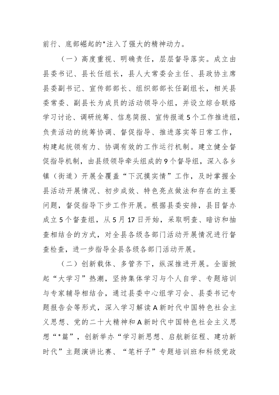 关于“大学习、大讨论、大调研”活动情况总结报告自全省“大学习、大讨论、大调研”活动启动以来,我县始终把活动开展作为当前全县一项管总的、紧迫的政治任务,精心组织、迅速行动,开展了全方位、深层次、多维度的学习、讨论、调研,助推“大学习、大讨论、大调研”活动开展取得了阶段性成效。现将具体情况总结如下:一、活动开展情况及成效按照省委、市委对“大学习、大讨论、大调研”活动的部署要求,县委立即行动,于8月20日组织召开常委会会议,专题传达学习省委*在读书班上的讲话精神。5月2日,县委召开“大学习、大讨论、大调研”活动推进会,及时对活动开展的相关要求、任务进行再安排再部署,会后制定并下发了活动实施方案、重点课题调研方案、宣传报道方案等系列文件,有效指导活动开展。5月17日、9月1日,县委再次召开常委会会议,专题听取“大学习、大讨论、大调研”活动开展情况汇报,研究部署下阶段工作。9月13日,召开全县“大学习大讨论大调研”活动工作推进座谈会,深入贯彻全省、全市“大学习大讨论大调研”活动工作推进座谈会精神,总结交流活动经验,对下一阶段活动开展进行安排部署。“大学习、大讨论、大调研”活动的有序开展,为砥砺前行、底部崛起的*注入了强大的精神动力。(一)高度重视、明确责任,层层督导落实。成立由县委书记、县长任组长,县人大常委会主任、县政协主席县委副书记、宣传部部长、组织部部长任副组长,相关县委常委、副县长为成员的活动领导小组,并设立综合联络学习讨论、调研统筹、信息简报、宣传报道5个工作推进组,负责活动的统筹协调、督促指导、推进落实等日常工作,构建起统领有力、协调有效的工作运行机制。建立健全督促指导机制,由县级领导牵头组成的9个督导组,深入各乡镇(街道)开展全覆盖“下沉摸实情”工作,及时掌握全县活动开展情况、初步成效、特色亮点做法和存在的主要问题,督促指导下步工作开展。根据县委安排,县目督办成立5个督查组,从5月17日开始,采取明查、暗访和抽查相结合的方式,对全县各级各部门活动开展情况进行督查检查,进一步指导全县各级各部门活动开展。(二)创新载体、多管齐下,纵深推进开展。全面掀起“大学习”热潮,坚持集体学习与个人自学、专题培训与专家辅导相结合,通过县委中心组学习会、县委书记专题报告会等形式,深入学习解读A新时代中国特色社会主义思想、党的二十大精神和A新时代中国特色社会主义思想“*篇”,创新举办“学习新思想、启航新征程、建功新时代”主题演讲比赛、“笔杆子”专题培训班和科级党政主要领导干部学习贯彻A新时代中国特色社会主义思想、党的二十大精神和A总书记重要指示精神暨深入开展“大学习、大讨论、大调研”活动读书班等活动,引导全县干部积极学习党的理论知识,不断提升个人素养能力。全面掀起“大讨论”热潮,县委书记带头召开农业农村改革专题研讨会、牵头课题专题研讨会、科级党政主要领导干部读书班暨“大学习、大讨论、大调研”活动专题讨论会,其他县级领导也分别组织召开调研座谈会和工作推进会,各乡镇(街道)部门通过党委(党组)专题学习会、理论学习中心组会、党支部大会、党小组会等多种形式,就如何把握新时代*发展目标和发展方略、推进县域经济高质量发展为绵阳建设全省经济副中心贡献*力量等重点问题开展研讨。全面掀起“大调研”热潮,由县委书记总牵头,组织23名县级领导分别承担了28个贯彻落实A总书记重要指示精神的调研课题,其中9个课题被市委政研室确定为重点关注课题,全部课题已形成调研提纲。连日来,县委书记带头深入鲁班镇石马村、芦溪工业区等地就项目建设等工作开展专题调研。目前,各县级领导正广泛深入镇村开展实地调研,力争早日形成核心观点和务实举措。(三)广泛宣传、大造声势,营造浓厚氛围。制定“大学习、大讨论、大调研”活动宣传报道方案和氛围营造方案,在*新闻网、*政务网等网络媒体和《今日*报》、*广播电视台等传统媒体开设专题专栏,并在《*信息》编发“大学习、大讨论、大调研”活动专刊,对各级各部门活动开展动态典型经验做法进行通报交流,目前已编发专刊11期,被市活动办专刊采用3期、省委...