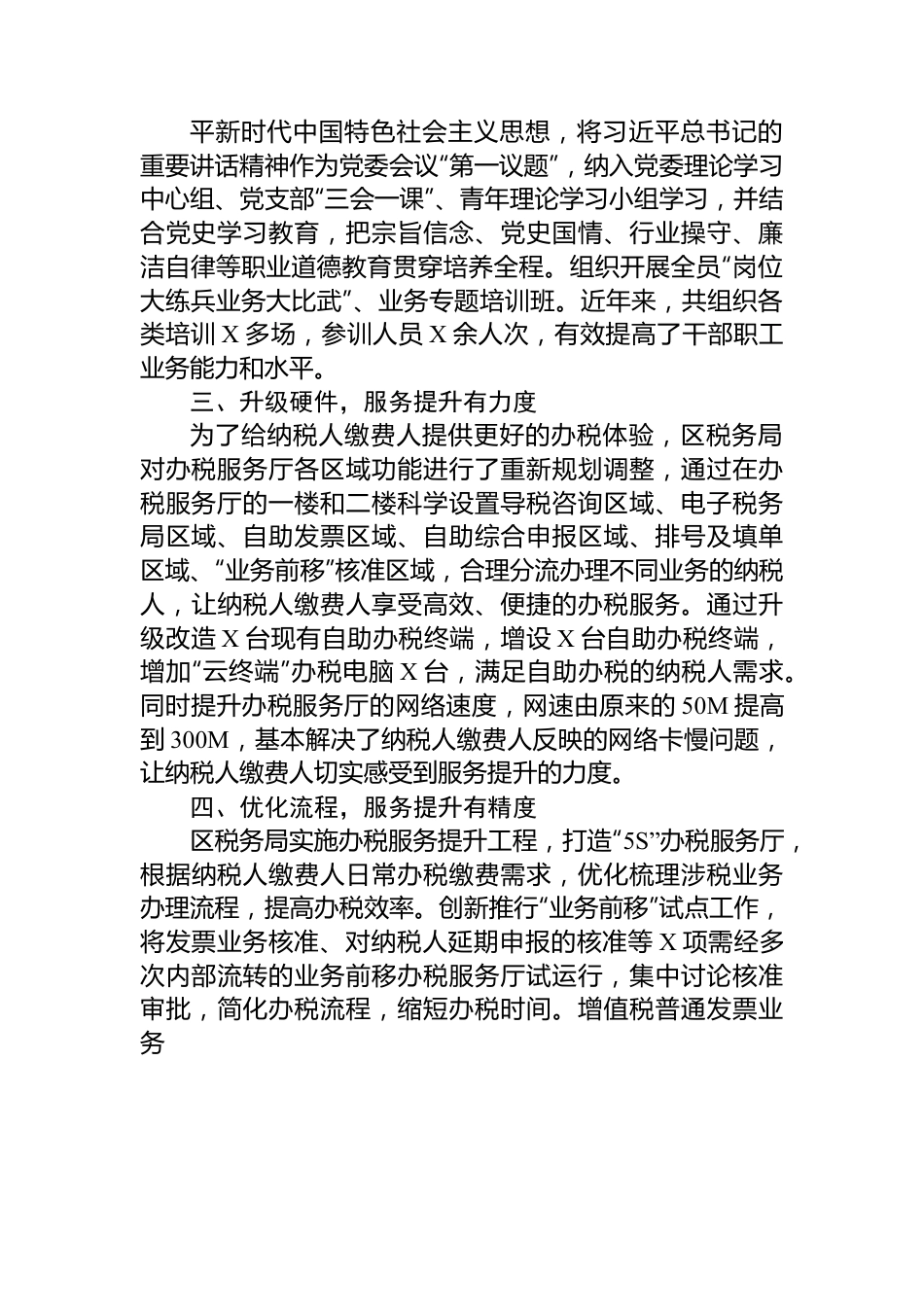 精神文明建设先进集体事迹(税务)区税务局紧紧围绕税收主责主业,以党建为引领,紧扣中办、国办印发的《关于进一步深化税收征管改革的意见》要求,进一步深化“放管服”改革,注重优化税收营商环境,积极对标各级“服务满意提升工程”,以纳税人缴费人为中心,通过征纳互动平台开展“问、办、查、评、送”一体化服务,问计问需于纳税人缴费人,着力解决纳税人缴费人的堵点、难点、痛点问题,切实提升纳税人缴费人满意度和获得感,以文明服务为核心,开展创建“文明示范窗口”活动,结合区税务局实际情况,内强素质,外树形象,苦练“内功”,通过不断提高干部职工的职业素养和强化窗口服务形象,推动区税务局两个文明建设。一、强化组织领导,建立长效机制区税务局成立了精神文明创建工作领导小组,实行“一把手”负总责,分管领导具体负责,各股室和分局分工负责、相互配合,形成了齐抓共管的工作机制。制发《创建方案》等制度方案,召开文明创建工作部署会、专题会、推进会X场次。二、抓好思想教育,筑牢创建基础深入学习习近平新时代中国特色社会主义思想,将习近平总书记的重要讲话精神作为党委会议“第一议题”,纳入党委理论学习中心组、党支部“三会一课”、青年理论学习小组学习,并结合党史学习教育,把宗旨信念、党史国情、行业操守、廉洁自律等职业道德教育贯穿培养全程。组织开展全员“岗位大练兵业务大比武”、业务专题培训班。近年来,共组织各类培训X多场,参训人员X余人次,有效提高了干部职工业务能力和水平。三、升级硬件,服务提升有力度为了给纳税人缴费人提供更好的办税体验,区税务局对办税服务厅各区域功能进行了重新规划调整,通过在办税服务厅的一楼和二楼科学设置导税咨询区域、电子税务局区域、自助发票区域、自助综合申报区域、排号及填单区域、“业务前移”核准区域,合理分流办理不同业务的纳税人,让纳税人缴费人享受高效、便捷的办税服务。通过升级改造X台现有自助办税终端,增设X台自助办税终端,增加“云终端”办税电脑X台,满足自助办税的纳税人需求。同时提升办税服务厅的网络速度,网速由原来的50M提高到300M,基本解决了纳税人缴费人反映的网络卡慢问题,让纳税人缴费人切实感受到服务提升的力度。四、优化流程,服务提升有精度区税务局实施办税服务提升工程,打造“5S”办税服务厅,根据纳税人缴费人日常办税缴费需求,优化梳理涉税业务办理流程,提高办税效率。创新推行“业务前移”试点工作,将发票业务核准、对纳税人延期申报的核准等X项需经多次内部流转的业务前移办税服务厅试运行,集中讨论核准审批,简化办税流程,缩短办税时间。增值税普通发票业务从半天提速到5分钟内办结,增值税专用发票(10万元以下)业务从半天提速到15分钟内办结。增设简事易办窗,除个别专窗外,大部分人工窗口改造为“一窗通办”。大力推进“非接触”式办税,实现日常涉税事项X%以上可以“全程网上办”,通过业务流程的不断优化,提高工作效率,减少纳税人缴费人办税缴费的时间成本,推动服务提升有精度。区税务局以服务粤桂合作特别试验区发展为抓手,持续深化“党旗红税心融——党建共建连X”党建品牌建设。