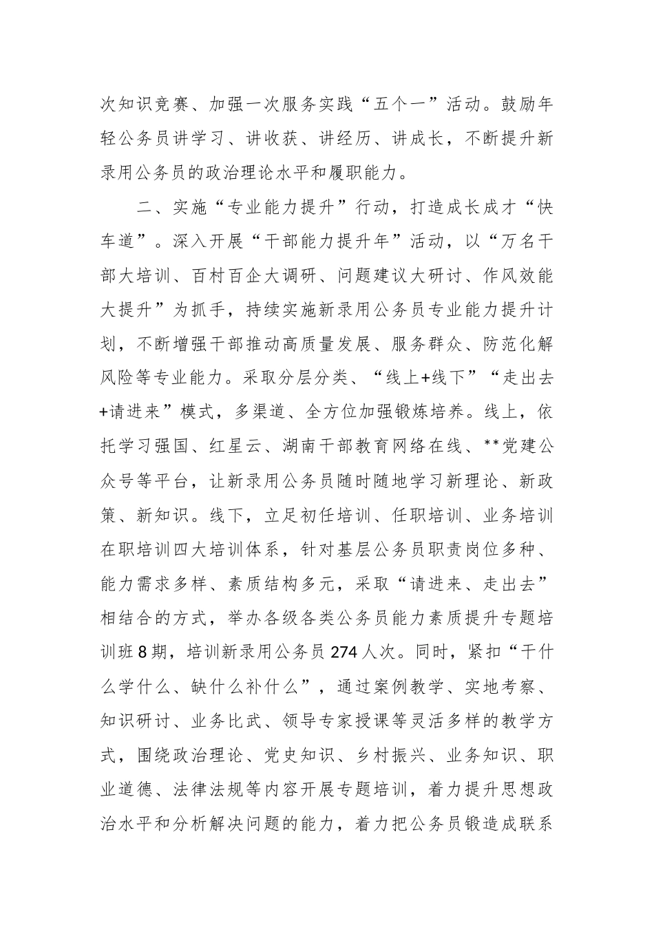 公务员队伍建设交流材料(3篇)篇1:近年来,我县坚持把新录用公务员培养和管理作为干部队伍建设的基础性、战略性工作来抓,大力实施政治理论铸魂、发展专业提能、实践锻炼塑形、严管厚爱护苗“四大行动”,推动新录用公务员健康成长成才,着力培养打造堪当民族复兴重任的高素质干部队伍。一、实施“政治理论铸魂”行动,筑牢理想信念“压舱石”。深入实施党的创新理论教育培训计划,将A新时代中国特色社会主义思想和党的二十大精神作为新录用公务员教育培训的必修课,通过开展公务员岗前培训和任前谈话等方式,重点提高新录用公务员思想政治素质,教育引导新录用公务员深刻领悟“两个确立”的决定性意义,增强“四个意识”、坚定“四个自信”、做到“两个维护”。依托湘鄂川黔革命根据地、花垣十八洞、矮寨大桥等州内红色资源,积极组织新录用公务员开展重温入党誓词、主题党日活动,助力年轻公务员传承红色基因、接受党性锻炼、汲取奋进动能。组织开展“党的二十大精神”青年干部读书会活动,通过研读一本书、举行一次专题辅导、开展一次学习讨论、举办一次知识竞赛、加强一次服务实践“五个一”活动。鼓励年轻公务员讲学习、讲收获、讲经历、讲成长,不断提升新录用公务员的政治理论水平和履职能力。二、实施“专业能力提升”行动,打造成长成才“快车道”。深入开展“干部能力提升年”活动,以“万名干部大培训、百村百企大调研、问题建议大研讨、作风效能大提升”为抓手,持续实施新录用公务员专业能力提升计划,不断增强干部推动高质量发展、服务群众、防范化解风险等专业能力。采取分层分类、“线上+线下”“走出去+请进来”模式,多渠道、全方位加强锻炼培养。线上,依托学习强国、红星云、湖南干部教育网络在线、**党建公众号等平台,让新录用公务员随时随地学习新理论、新政策、新知识。线下,立足初任培训、任职培训、业务培训在职培训四大培训体系,针对基层公务员职责岗位多种、能力需求多样、素质结构多元,采取“请进来、走出去”相结合的方式,举办各级各类公务员能力素质提升专题培训班8期,培训新录用公务员274人次。同时,紧扣“干什么学什么、缺什么补什么”,通过案例教学、实地考察、知识研讨、业务比武、领导专家授课等灵活多样的教学方式,围绕政治理论、党史知识、乡村振兴、业务知识、职业道德、法律法规等内容开展专题培训,着力提升思想政治水平和分析解决问题的能力,着力把公务员锻造成联系服务群众、促进经济社会发展的先锋队和生力军。三、实施“实践锻炼塑形”行动,激发担当作为“动力源”。全面落实省委组织部《关于进一步加强年轻干部培养教育和管理监督工作的意见》,持续实施年轻干部成长“薪火工程”,健全培养选拔优秀年轻干部常态化长效化机制。建立健全“传帮带”制度机制,组织“以师带徒”活动,根据新录用公务员所学专业、个人特点和工作经历,采取双向选择、组织指定等方法,建立“导师帮带”制,即确定1名领导班子成员和1名政治素质好、业务能力强、实践经验丰富的老同志与新录用公务员结成帮扶对子,2022年,全县共结成帮扶对子37对。聚焦新录用公务员能力短板问题,通过跟班学习、基层挂职、轮岗锻炼等措施,让公务员在“吃劲岗位”上、“关键岗位”上、“复杂环境”中提升处理复杂问题的能力,先后选派28名新录用公务员驻村、9名到项目建设、招商引资、信访维稳等一线锻炼。突出实绩导向,注重在一线发现优秀新录用公务员,将政治立场坚定、工作表现突出、能力素质过硬的优秀公务员及时补充到年轻后备干部库中,激励新录用公务员实干担当作为,全县建立优秀新录用公务员库124人。四、实施“严管厚爱护苗”行动,密织监督管理“防护网”。制定《公务员平时考核工作实施方案》、《**县县直机关事业单位公开选调一般工作人员暂行办法》等,加强新录用公务员全周期管理。紧盯新录用公务员入职前三年“成才黄金期”等关键节点,开展廉政宣讲,帮助扣好廉洁从政的“第一颗扣子”。坚持八小时内与八小时外管理相统一,对新录用公务员出现的苗头性、倾向性问题及时提醒纠正,让新录用公务员在严管的环境中健康成长。对勇于担当、锐意进...