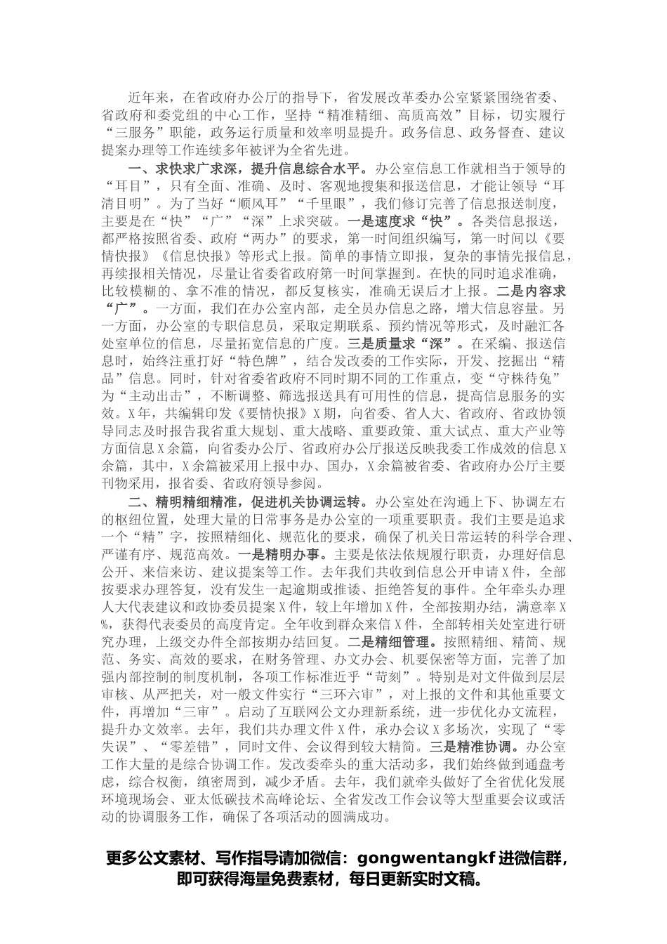 近年来,在省政府办公厅的指导下,省发展改革委办公室紧紧围绕省委、省政府和委党组的中心工作,坚持“精准精细、高质高效”目标,切实履行“三服务”职能,政务运行质量和效率明显提升。政务信息、政务督查、建议提案办理等工作连续多年被评为全省先进。一、求快求广求深,提升信息综合水平。办公室信息工作就相当于领导的“耳目”,只有全面、准确、及时、客观地搜集和报送信息,才能让领导“耳清目明”。为了当好“顺风耳”“千里眼”,我们修订完善了信息报送制度,主要是在“快”“广”“深”上求突破。一是速度求“快”。各类信息报送,都严格按照省委、政府“两办”的要求,第一时间组织编写,第一时间以《要情快报》《信息快报》等形式上报。简单的事情立即报,复杂的事情先报信息,再续报相关情况,尽量让省委省政府第一时间掌握到。在快的同时追求准确,比较模糊的、拿不准的情况,都反复核实,准确无误后才上报。二是内容求“广”。一方面,我们在办公室内部,走全员办信息之路,增大信息容量。另一方面,办公室的专职信息员,采取定期联系、预约情况等形式,及时融汇各处室单位的信息,尽量拓宽信息的广度。三是质量求“深”。在采编、报送信息时,始终注重打好“特色牌”,结合发改委的工作实际,开发、挖掘出“精品”信息。同时,针对省委省政府不同时期不同的工作重点,变“守株待兔”为“主动出击”,不断调整、筛选报送具有可用性的信息,提高信息服务的实效。X年,共编辑印发《要情快报》X期,向省委、省人大、省政府、省政协领导同志及时报告我省重大规划、重大战略、重要政策、重大试点、重大产业等方面信息X余篇,向省委办公厅、省政府办公厅报送反映我委工作成效的信息X余篇,其中,X余篇被采用上报中办、国办,X余篇被省委、省政府办公厅主要刊物采用,报省委、省政府领导参阅。二、精明精细精准,促进机关协调运转。办公室处在沟通上下、协调左右的枢纽位置,处理大量的日常事务是办公室的一项重要职责。我们主要是追求一个“精”字,按照精细化、规范化的要求,确保了机关日常运转的科学合理、严谨有序、规范高效。一是精明办事。主要是依法依规履行职责,办理好信息公开、来信来访、建议提案等工作。去年我们共收到信息公开申请X件,全部按要求办理答复,没有发生一起逾期或推诿、拒绝答复的事件。全年牵头办理人大代表建议和政协委员提案X件,较上年增加X件,全部按期办结,满意率X%,获得代表委员的高度肯定。全年收到群众来信X件,全部转相关处室进行研究办理,上级交办件全部按期办结回复。二是精细管理。按照精细、精简、规范、务实、高效的要求,在财务管理、办文办会、机要保密等方面,完善了加强内部控制的制度机制,各项工作标准近乎“苛刻”。特别是对文件做到层层审核、从严把关,对一般文件实行“三环六审”,对上报的文件和其他重要文件,再增加“三审”。启动了互联网公文办理新系统,进一步优化办文流程,提升办文效率。去年,我们共办理文件X件,承办会议X多场次,实现了“零失误”、“零差错”,同时文件、会议得到较大精简。三是精准协调。办公室工作大量的是综合协调工作。发改委牵头的重大活动多,我们始终做到通盘考虑,综合权衡,缜密周到,减少矛盾。去年,我们就牵头做好了全省优化发展环境现场会、亚太低碳技术高峰论坛、全省发改工作会议等大型重要会议或活动的协调服务工作,确保了各项活动的圆满成功。更多公文素材、写作指导请加微信:gongwentangkf进微信群,即可获得海量免费素材,每日更新实时文稿。三、狠招狠劲狠手,严格督办强化落实。发改委工作涉及面广,每年承办的重点工作、领导批示和交办事项多。如省政府重点工作分工,由发改委牵头的事项占到X%以上。在工作中,我们注重抓好任务的分工、交办、督办、催办、总结、汇报等各个环节,在抓落实、抓执行上下了狠功夫。一是出狠招。主要围绕省第十一次党代会重点任务、省政府工作报告重点工作分工和省领导批示、指示等重点任务,抓好任务分解,做到责任清、任务明,让各处室单位责任上肩。比如,根据省政府工作报告明确的重点任务,对涉及发改委的事项,第一时间制...