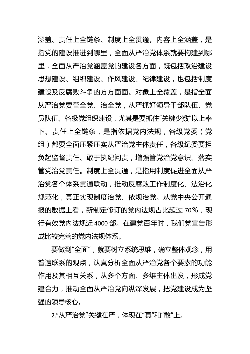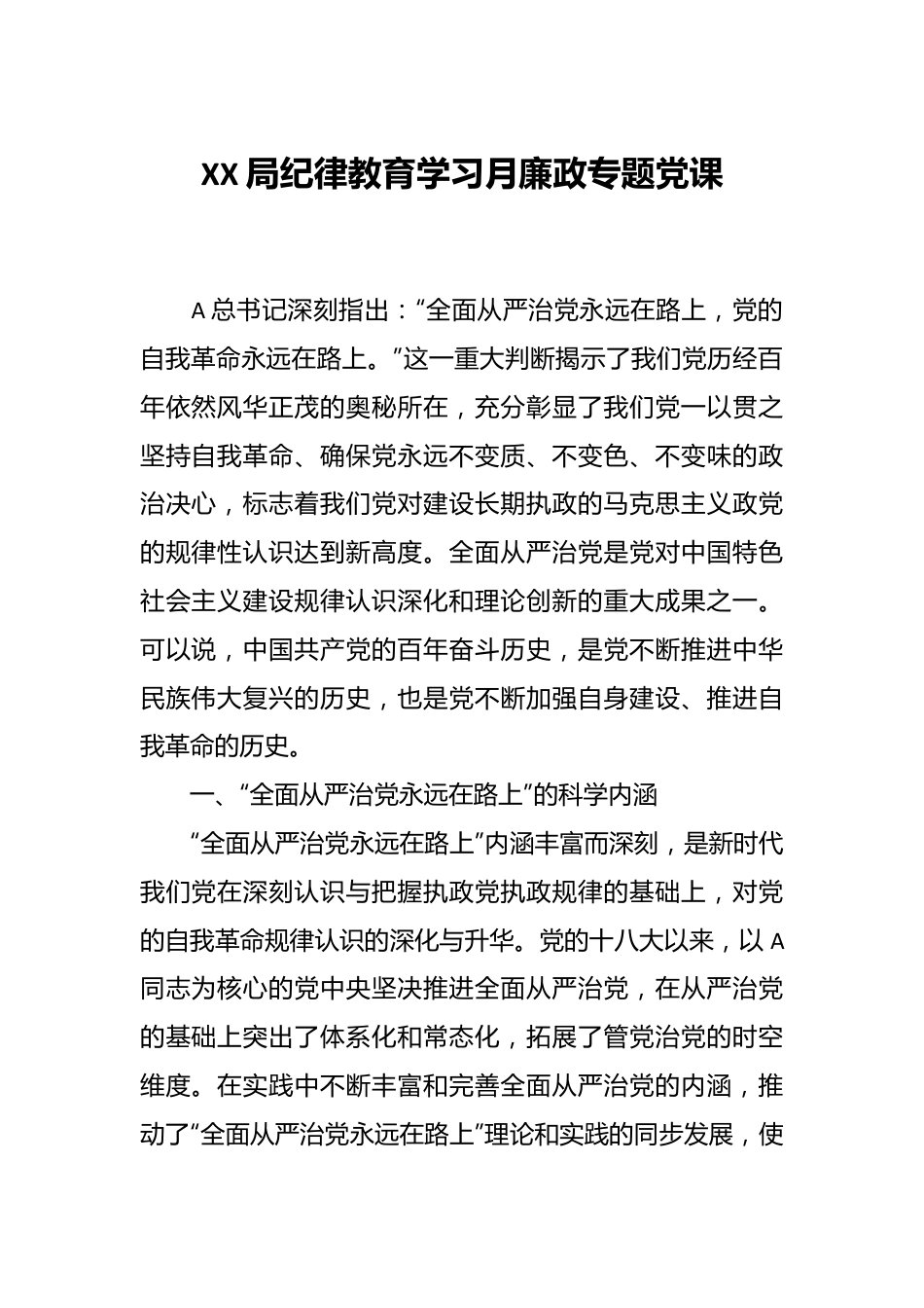 XX局纪律教育学习月廉政专题党课A总书记深刻指出:“全面从严治党永远在路上,党的自我革命永远在路上。”这一重大判断揭示了我们党历经百年依然风华正茂的奥秘所在,充分彰显了我们党一以贯之坚持自我革命、确保党永远不变质、不变色、不变味的政治决心,标志着我们党对建设长期执政的马克思主义政党的规律性认识达到新高度。全面从严治党是党对中国特色社会主义建设规律认识深化和理论创新的重大成果之一。可以说,中国共产党的百年奋斗历史,是党不断推进中华民族伟大复兴的历史,也是党不断加强自身建设、推进自我革命的历史。一、“全面从严治党永远在路上”的科学内涵“全面从严治党永远在路上”内涵丰富而深刻,是新时代我们党在深刻认识与把握执政党执政规律的基础上,对党的自我革命规律认识的深化与升华。党的十八大以来,以A同志为核心的党中央坚决推进全面从严治党,在从严治党的基础上突出了体系化和常态化,拓展了管党治党的时空维度。在实践中不断丰富和完善全面从严治党的内涵,推动了“全面从严治党永远在路上”理论和实践的同步发展,使“全面从严治党永远在路上”成为党中央深入推进新时代党的建设新的伟大工程的鲜明主题。1.所谓“全面”,是指从严治党内容上全涵盖、对象上全涵盖、责任上全链条、制度上全贯通。内容上全涵盖,是指党的建设推进到哪里,全面从严治党体系就要构建到哪里,全面从严治党涵盖党的建设各方面,既包括政治建设思想建设、组织建设、作风建设、纪律建设,也包括制度建设及反腐败斗争的方方面面。对象上全覆盖,是指全面从严治党要管全党、治全党,从严抓好领导干部队伍、党员队伍、各级党组织建设,尤其是要抓住“关键少数”以上率下。责任上全链条,是指依据党内法规,各级党委(党组)都要全面压紧压实从严治党主体责任,各级纪委要担负起监督责任、敢于执纪问责,增强管党治党意识、落实管党治党责任。制度上全贯通,是指用制度促进全面从严治党各个体系贯通联动,推动反腐败工作制度化、法治化规范化,真正实现制度治党、依规治党。从党中央公开通报的数据上看,新制定修订的党内法规占比超过70%,现行有效党内法规近4000部。在建党百年时,我们党宣告形成比较完善的党内法规体系。要做到“全面”,就要树立系统思维,确立整体观念,用普遍联系的观点,认真分析全面从严治党各个要素的功能作用及其相互关系,从多个方面、多维主体出发,形成党建合力,推动全面从严治党向纵深发展,把党建设成为坚强的领导核心。2.“从严治党”关键在严,体现在“真”和“敢”上。做到真管真严、敢管敢严、长管长严,是对党的建设长期性、复杂性、艰巨性的科学回应。治国必先治党,治党务必从严。从严治党,就是要做到无禁区,保证“从严”落实于各领域、各环节、各主体,做到规矩面前人人平等;设立严标准,严打腐败苗头,严惩腐败行为,在强化震慑力的同时树立规矩的权威。首先,从严是一种态度,真正做到从严要有真管、敢管的责任感,明确职责并将自身职责落实到位。要严在态度、严在细节、严在行动、严在落实,要敢于突破利益固化的藩篱,要“以猛药去疴、重典治乱的决心,以刮骨疗毒、壮士断腕的勇气”,坚持惩治不放松,保持高压态势,推进全面从严治党向纵深发展。在党的二十大召开期间,中央纪委副书记、国家监委副主任肖培对外公布了的一组数据党的十八大以来,全国纪检监察机关共立案464.8万余件。其中,立案审查调查中管干部553人,处分厅局级干部2.5万多人、县处级干部18.2万多人。这些数据充分彰显出党中央从严管理、一视同仁,无禁区、不设限的态度。其次,从严治党是指制定严格纪律、规矩。强化纪律建设、制度建设至关重要,各级党组织要认真贯彻执行《中国共产党廉洁自律准则》《中国共产党纪律处分条例》等规章制度,使其真正成为“带电的高压线”,营造守纪律、讲规矩的良好氛围。3.“永远在路上”是指全面从严治党是一个长期的过程,这个实践过程没有终点,只有进行时。“永远在路上”,既是我们党百年来建党治党的经验总结,也是党应对长期存在的诸多考验和危险的客观需要。历史证明,我们党历经千锤百炼依然风华正茂,一个...