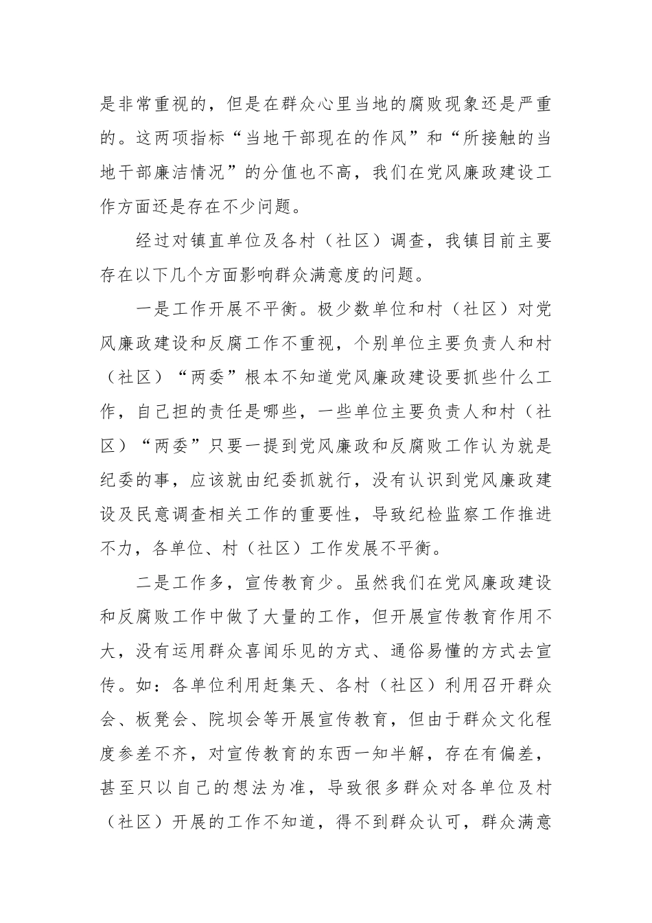 关于乡镇党风廉政建设社会民意调查报告近几年市、区纪委委托民调中心开展党风廉政建设社会民意调查工作。为认真贯彻落实市委、市纪委和区委、区纪委关于提升群众对党风廉政建设满意度的各项安排部署,促进我镇认真落实党风廉政建设责任制,进一步提升人民群众对党风廉政建设和反腐败工作的满意度,xx镇纪委就全镇影响党风廉政建设工作群众满意度的相关问题进行了调查,并就提升党风廉政建设工作群众满意度提点建议。一、存在的问题及原因分析现对xx镇最近两年党风廉政建设群众满意度进行分析,20xx年xx镇党风廉政建设群众满意度在x个乡镇(街道)中排名x名,综合成绩x分。20xx年xx镇党风廉政建设群众满意度在x个乡镇(街道)中排名x名,综合成绩x分。根据数据看,20xx年比20xx年上升了x名,总的来说在全区排在中偏上。20xx年xx镇在x个评价性指标分别得分:当地领导对反腐败工作的重视程度x分、当地的腐败现象严重程度x分、当地发腐败工作的成效x分、当地干部现在的作风x分、所接触的当地干部廉洁情况x分、当地干部关心和维护群众利益程度x分、开展反腐败斗争信心程度x分。从这组数据来看,我镇开展反腐败斗争信心十足,当地领导对反腐败工作是非常重视的,但是在群众心里当地的腐败现象还是严重的。这两项指标“当地干部现在的作风”和“所接触的当地干部廉洁情况”的分值也不高,我们在党风廉政建设工作方面还是存在不少问题。经过对镇直单位及各村(社区)调查,我镇目前主要存在以下几个方面影响群众满意度的问题。一是工作开展不平衡。极少数单位和村(社区)对党风廉政建设和反腐工作不重视,个别单位主要负责人和村(社区)“两委”根本不知道党风廉政建设要抓些什么工作,自己担的责任是哪些,一些单位主要负责人和村(社区)“两委”只要一提到党风廉政和反腐败工作认为就是纪委的事,应该就由纪委抓就行,没有认识到党风廉政建设及民意调查相关工作的重要性,导致纪检监察工作推进不力,各单位、村(社区)工作发展不平衡。二是工作多,宣传教育少。虽然我们在党风廉政建设和反腐败工作中做了大量的工作,但开展宣传教育作用不大,没有运用群众喜闻乐见的方式、通俗易懂的方式去宣传。如:各单位利用赶集天、各村(社区)利用召开群众会、板凳会、院坝会等开展宣传教育,但由于群众文化程度参差不齐,对宣传教育的东西一知半解,存在有偏差,甚至只以自己的想法为准,导致很多群众对各单位及村(社区)开展的工作不知道,得不到群众认可,群众满意度不高。三是部分镇、村(社区)干部仍然还存在违规违纪现象。从近两年收到的信访举报和查处的案件来看,反映我们基层干部,特别是村(社区)干部的举报信件约占x%以上,20xx年我镇x名基层干部(其中村干部x人、一般干部x人)受到党纪政纪处分,占受处分人数的x%;20xx年x名基层干部(其中村干部x人、一般干部x人)受到党纪政纪处分,占受处分人数的x%,部分党员干部存在将不符合条件的农户纳入享受民生政策、不按照要求安排帮扶项目、收受群众好处费等现象,严重侵害了群众的切身利益,影响了党员干部的良好形象,而这些党员干部都是平时与群众联系最多、联系最密切、最基层的群体,这些现象或多或少地影响了我们党风廉政建设的正面效果。四是干部作风不够扎实。一些服务窗口及个别村(社区)干部还存在“门难进、脸难看、话难听、事难办”的现象,对群众态度粗暴,工作方法简单、漠视群众。一些干部对待工作庸懒散慢,作风漂浮,工作不实,甚至在工作期间饮酒,在干部和群众中造成不良影响,如:我镇发启村干部王某某于20xx年工作日午间饮酒,镇纪委给予党内警告处分。虽然有些人有所收敛,情况有所好转,但并没有就彻底消失,这些现象也会影响群众对我们党员干部的满意度,影响群众对党风廉政建设的满意度。五是部分与群众关系密切的公开工作还有待加强。部分村(社区)支部的重大决策、村的大额开支,村里的发展招商项目、征地拆迁等经常性公开做得不够,导致群众对我们的工作因不知情而不信,不认可;村务(民生)监督委会虽然建立起来了,民生监督员的文化水平参差不齐,年龄大偏多,不懂监督,开展工作的切入点不多,...
