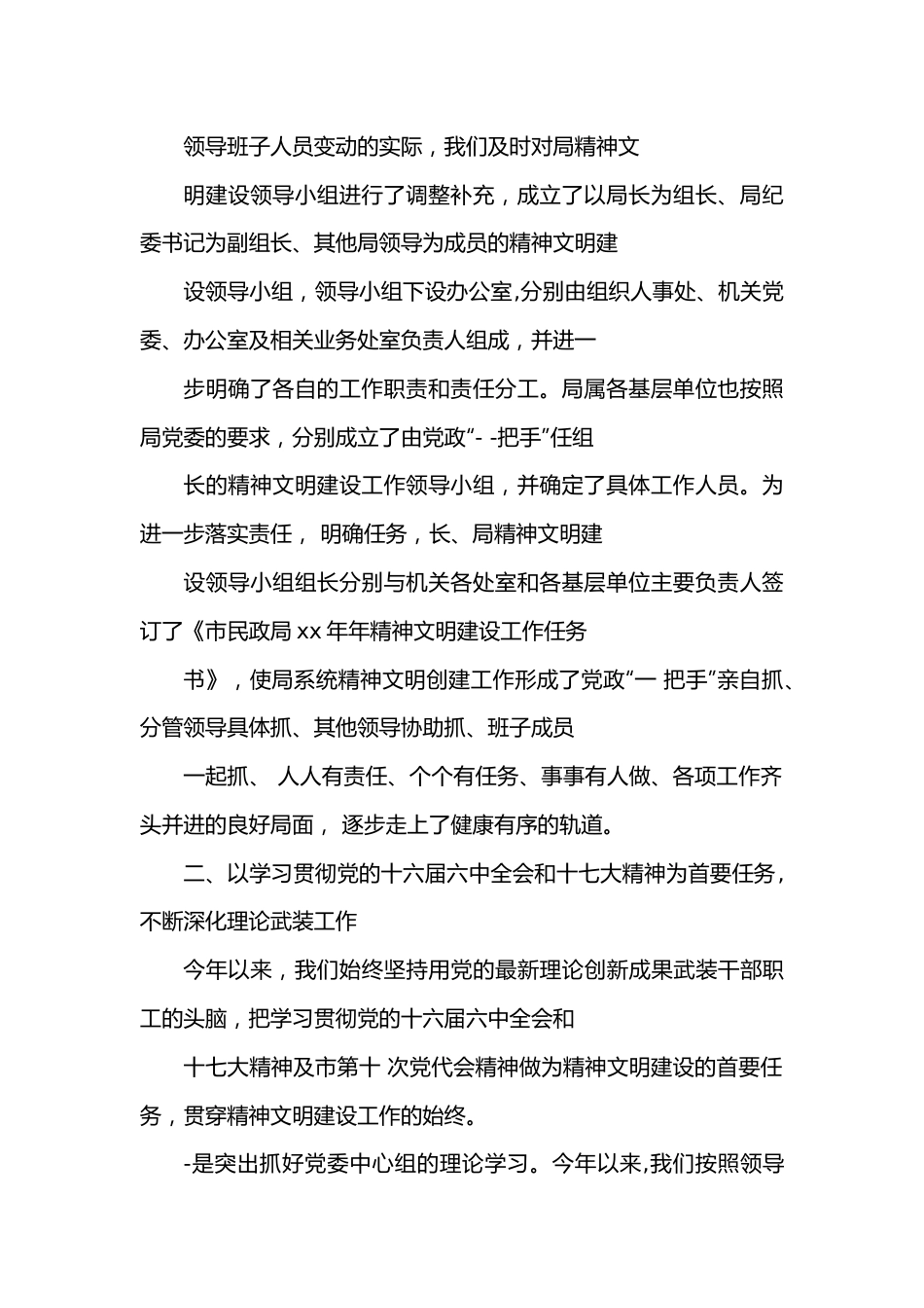 2022年度民政局精神文明建设工作总结(1)xx年年度民政局精神文明建设工作总结年年,我局的精神文明建设工作在市委、市政府的领导和市文明委的指导下,按照市委总体工作大局和市文明委的部署安排,认真贯彻落实党的十六届六中全会和十七大及市第十-次党代会精神,积极践行科学发展观,紧紧围绕创建全国文明城市的总体目标,以建设人文xx、活力xx、和谐xx为主题,以社会主义核心价值体系为根本,以“创文明和谐机关,做人民满意公仆”为重点深入开展群众性精神文明创建活动,努力在创新工作思路、完善长效机制、拓展创建领域、提升创建水平、取得创建实效、巩固创建成果上下功夫,使局系统干部职工的文明素质明显提高,为局系统全年各项民政工作任务的圆满完成奠定了良好的基础。-、以健全机构、落实责任为切入点加强对创建“工作的组织领导为使精神文明建设工作真正落到实处,我们首先从建立健全组织机构、落实精神文明目标责任制入手,把精组会议,研究部署精神文明创建工作,先后制定下发了《市民政局精神文明建设规划》、《市民政局精神文明建设工作要点》、《市民政局精神文明建设工作检查考核实施细则》,把精神文明建设和业务工作同安排、同部署、同落实、同检查、同考核。年初,针对形势任务的要求和局领导班子人员变动的实际,我们及时对局精神文明建设领导小组进行了调整补充,成立了以局长为组长、局纪委书记为副组长、其他局领导为成员的精神文明建设领导小组,领导小组下设办公室,分别由组织人事处、机关党委、办公室及相关业务处室负责人组成,并进一步明确了各自的工作职责和责任分工。局属各基层单位也按照局党委的要求,分别成立了由党政“--把手”任组长的精神文明建设工作领导小组,并确定了具体工作人员。为进一步落实责任,明确任务,长、局精神文明建设领导小组组长分别与机关各处室和各基层单位主要负责人签订了《市民政局xx年年精神文明建设工作任务书》,使局系统精神文明创建工作形成了党政“一把手”亲自抓、分管领导具体抓、其他领导协助抓、班子成员一起抓、人人有责任、个个有任务、事事有人做、各项工作齐头并进的良好局面,逐步走上了健康有序的轨道。二、以学习贯彻党的十六届六中全会和十七大精神为首要任务,不断深化理论武装工作今年以来,我们始终坚持用党的最新理论创新成果武装干部职工的头脑,把学习贯彻党的十六届六中全会和十七大精神及市第十次党代会精神做为精神文明建设的首要任务,贯穿精神文明建设工作的始终。-是突出抓好党委中心组的理论学习。今年以来,我们按照领导干部先学-步、多学一点、学深一些的思路,组织党委中心组成员,先后对十六届六中全会精神、省、市第十一次党代会精神、胡锦涛总书记在中纪委第七次全体会议上的讲话及在中央党校省部级领导干部进修班上的讲话、赵乐际书记在xx考察调研时的讲话及十七大精神进行了深入学习。为切实保证学习效果,我们做到了学习前有准备、有内容,学习中有主题、有笔记,学习后有建议、有心得,全年做到有计划有安排、有检查、有交流、有总结,个人做到有计划有笔记有学习心得,较好地保证了学习时间、人员、内容、效果“四落实”今年以来,局党委中心组成员围绕“怎样做一名合格的人民公仆”、“如何加强领导班子建设”、“我市民政工作如何走在全省前列”、“如何构建大民政格局,打造强势民政、和谐民政“等调研题目,结合分管工作,深入基层开展实践调研,通过发放问卷、和基层部职工及服务对象座谈等形式,掌握了第一手资料,写出了各自的学习调研报告,为局党委进-步理顺工作思路、有针对性地制定切实可行的工作措施提供了理论依据,使理论学习真正做到了进入思想指导实践推动工作,党委--班人的执政意识、执政能力和领导水平得到了显著提高。二是强化局系统F部职工的理论学习。今年以来,我们采取集中学习和分散学习相结合、在职培训与个人自学相结合、学习政治理论与学习民政工作业务相结合的方法,在局系统干部职工中广泛开展了”四个一”活动,即:每人制定一个理论学习计划、读一本政治理论书籍、记-本读书笔记、写理论体会文章,同时,通过外出参观、观看电视电教片、知识竞赛、观看...