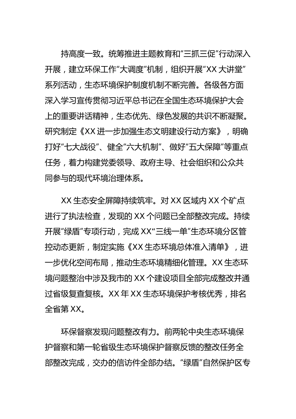 在2024年全市生态环境保护工作会议上的工作报告同志们:这次会议的主要任务是,以习近平新时代中国特色社会主义思想为指导,深入学习习近平生态文明思想,全面贯彻落实党的XX大和二十届二中全会、中央经济工作会议和全国生态环境保护大会精神,认真落实省委十四届三次和四次全会、省市委经济工作会议、省市“两会”精神,总结XX年全市生态环境保护工作,分析当前工作形势,安排部署XX年重点工作。一、XX年生态环境保护工作推进有力在市委市政府的坚强领导下,全市生态环境系统认真贯彻落实习近平生态文明思想和习近平总书记对XX重要讲话重要指示批示精神,深入践行绿水青山就是金山银山理念,协同推进降碳、减污、扩绿、增长,全市环境质量趋稳向好,国家XX生态安全屏障持续筑牢,人民群众对良好生态环境的获得感、幸福感和安全感不断增强。(一)牢记国之大者,忠诚拥护“两个确立”,坚决做到“两个维护”习近平生态文明思想入脑入心。坚持落实“第一议题”制度,及时跟进学习习近平总书记系列重要讲话精神,始终在思想上政治上行动上同以习近平同志为核心的党中央保持高度一致。统筹推进主题教育和“三抓三促”行动深入开展,建立环保工作“大调度”机制,组织开展“XX大讲堂”系列活动,生态环境保护制度机制不断完善。各级各方面深入学习宣传贯彻习近平总书记在全国生态环境保护大会上的重要讲话精神,生态优先、绿色发展的共识不断凝聚。研究制定《XX进一步加强生态文明建设行动方案》,明确打好“七大战役”、健全“六大机制”、做好“五大保障”等重点任务,着力构建党委领导、政府主导、社会组织和公众共同参与的现代环境治理体系。XX生态安全屏障持续筑牢。对XX区域内XX个矿点进行了执法检查,发现的XX个问题已全部整改完成。持续开展“绿盾”专项行动,完成XX“三线一单”生态环境分区管控动态更新,制定实施《XX生态环境总体准入清单》,进一步优化空间布局,推动生态环境精细化管理。XX生态环境问题整治中涉及我市的XX个建设项目全部完成整改并通过省级复查复核。XX年XX生态环境保护考核优秀,排名全省第XX。环保督察发现问题整改有力。前两轮中央生态环境保护督察和第一轮省级生态环境保护督察反馈的整改任务全部整改完成,交办的信访件全部办结。“绿盾”自然保护区专项行动中反馈的XX省级自然保护区问题全部整改完毕。第二轮省级生态环境保护督察期间受理信访件XX件,已全部办结;督察反馈的XX项环境问题已整改完成XX项,剩余X项正在按照整改时限稳步推进。第三轮中央环保督察进驻期间,协调联络组“一办五组”高效协同,及时提供XX批次、XX份材料,共收到群众举报件XX件,较上轮同比下降X%。目前已办结X件,办结率X%。X件生态环保典型做法通讯稿被生态环境部部属媒体采用。全力支撑服务经济运行整体好转。制定实施《XX优化环评服务保障发展的15条措施》,积极试行容缺受理、告知承诺、打捆审批、两证合一等具体举措,切实提升环评质效。强化建设项目环评与规划环评、区域评估的联动,实现区域环境质量数据共享,推进项目环评审批便利化,今年共完成X个项目的符合性审查和X个项目的备案。(二)坚持精准、科学、依法治污,持续深入打好污染防治攻坚战深入推进蓝天保卫战。建立健全大气污染联防联控“1+N”工作体系(1指:《XX保护蓝天三年专项行动方案》,N指:《XX年度冬季大气污染防治工作实施方案》《XX深入打好重污染天气防控、臭氧污染防治和柴油货车污染治理攻坚战行动工作方案》《XX年大气污染防治“冬病夏治”专项行动计划》等),研究出台《XX保护蓝天三年专项行动方案》,配套制定《XX冬季大气污染防治工作实施方案》《XX年大气污染防治“冬病夏治”专项行动计划》《XX深入打好重污染天气防控、臭氧污染防治和柴油货车污染治理攻坚战行动工作方案》《XX噪声污染防治行动工作方案》《XX减污降碳协同增效实施方案》,确保大气污染各项任务落实落细。成立大气污染“冬防”工作X个巡查组和X个技术监测组,分区域开展大气污染防治重点任务落实情况督查检查,持续做好“冬防”攻坚;成立市、区、镇、村(社区)四级巡查检查工作组,在XX公司选冶化厂区、XX...