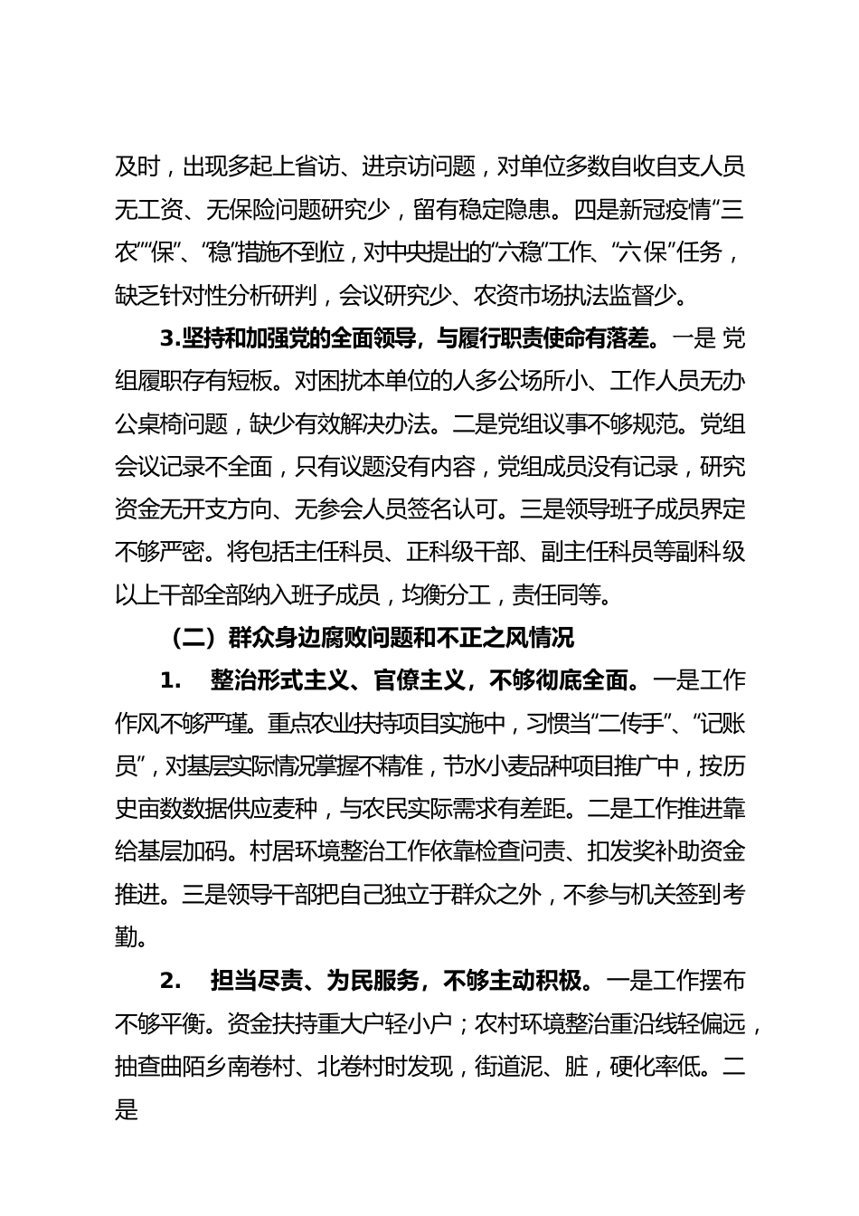 邯郸市第五提级巡察组关于巡察永年区农业农村局党组的情况报告邯郸市委巡察工作领导小组:根据市委巡察工作统一部署,2020年7月25日至8月31日,市第五提级巡察组对永年区农业农村局党组开展了常规巡察。现将情况汇报如下:一、基本情况和总体评价2019年1月,永年区农业农村局由原永年区农工委、农牧局合并组建,机关设10个行政科室,公务员编制25名,其中副科级以上领导干部20人,一般干部8人;下属事业单位26个,编制587人,全局目前在册人员513人。主要负责统筹研究和组织实施全区“三农”领域发展改革、乡村振兴战略实施、农村人居环境整治和农业综合执法等工作。从本次巡察的整体看,区农业农村局基本能够按照中央、省、市、区委的决策部署,学习贯彻习近平新时代中国特色社会主义思想和党的“十九大”精神,履行主体责任,实施乡村振兴战略,推进农业综合改革,在稳定农业生产、提升农村人居环境、发展特色产业等方面做出了较大业绩,有效促进了“三农”领域各项工作的改革和发展。但是,也存在主体责任履行不够有力、落实惠农政策不够严谨、乡村环境整治不够平衡、人事管理不够严格等问题,需要在今后工作中进一步完善管理机制,提振工作效率,确保全区农业农村工作更加健康、有序开展。二、巡察发现的主要问题(一)贯彻落实党的路线方针政策和党中央决策部署情况1.学习政治理论和上级精神,与预期效果有差距。一是理论学习不扎实。集中学习无考勤,对学习情况不检查、不考核;理论学习走形式、搞应付,存在抄写《党章》隔篇漏段、心得体会互相抄袭。检查发现,大部分人员对政治理论应知应会内容不了解,不清楚“四个意识”、“四个自信”、“两个维护”等基本内容。二是学习形式单一。局限于听讲座、学文件,相互交流和集体研讨少,与“三农”领域改革发展实际结合不够紧密,缺乏创新性举措。三是意识形态工作重视不够。党组对意识形态工作研究少,部署少,近三年《实施方案》全文照搬,一成不变;20名副科级以上领导干部的“学习强国”分数6000分以上的7人,抽查的3个科室23人中6000分以上5人,600分以下4人。2.贯彻党中央重大决策部署,与目标要求有差距。一是工作落实不够均衡。对有无上级资金支持的项目,态度不一,原有资金的人居环境整治、作物病虫防治等工作推进积极,力度较大;对无资金的蔬菜产业、畜牧养殖、农业产业化等工作推进慢,措施不具体。二是脱贫攻坚工作推进不够有力。分包贫困户的领导干部不清楚脱贫攻坚总要求,帮扶措施单一;产业扶贫技能培训存在填报人数不实、涉及科室负责人不了解具体情况。三是风险防控不够主动。对涉及本单位的信访稳定工作用力不足,处理不及时,出现多起上省访、进京访问题,对单位多数自收自支人员无工资、无保险问题研究少,留有稳定隐患。四是新冠疫情“三农”“保”、“稳”措施不到位,对中央提出的“六稳”工作、“六保”任务,缺乏针对性分析研判,会议研究少、农资市场执法监督少。3.坚持和加强党的全面领导,与履行职责使命有落差。一是党组履职存有短板。对困扰本单位的人多公场所小、工作人员无办公桌椅问题,缺少有效解决办法。二是党组议事不够规范。党组会议记录不全面,只有议题没有内容,党组成员没有记录,研究资金无开支方向、无参会人员签名认可。三是领导班子成员界定不够严密。将包括主任科员、正科级干部、副主任科员等副科级以上干部全部纳入班子成员,均衡分工,责任同等。(二)群众身边腐败问题和不正之风情况1.整治形式主义、官僚主义,不够彻底全面。一是工作作风不够严瑾。重点农业扶持项目实施中,习惯当“二传手”、“记账员”,对基层实际情况掌握不精准,节水小麦品种项目推广中,按历史亩数数据供应麦种,与农民实际需求有差距。二是工作推进靠给基层加码。村居环境整治工作依靠检查问责、扣发奖补助资金推进。三是领导干部把自己独立于群众之外,不参与机关签到考勤。2.担当尽责、为民服务,不够主动积极。一是工作摆布不够平衡。资金扶持重大户轻小户;农村环境整治重沿线轻偏远,抽查曲陌乡南卷村、北卷村时发现,街道泥、脏,硬化率低。二是监督检查频次低。农村保洁工作每月抽查频...