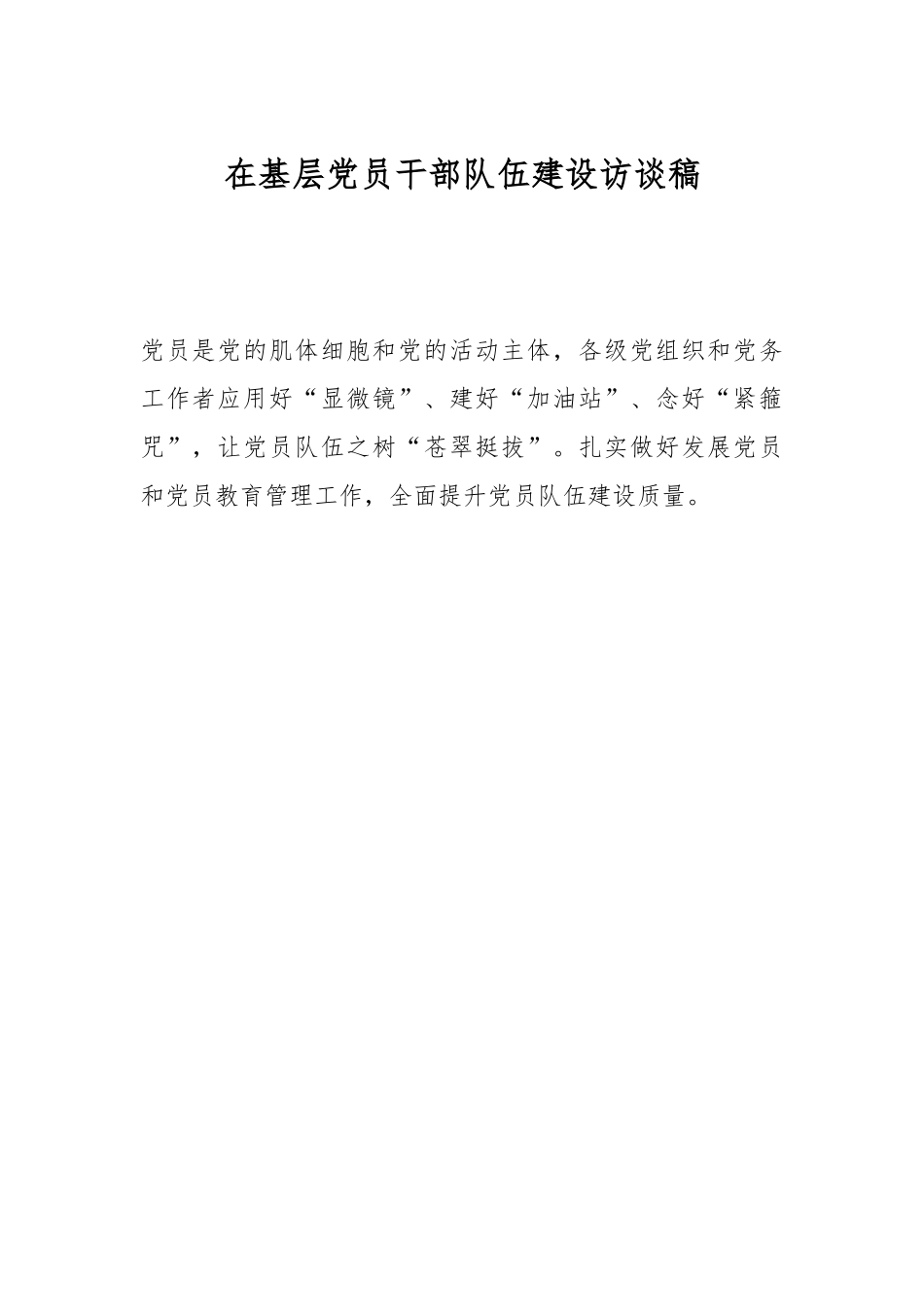 在基层党员干部队伍建设访谈稿党员是党的肌体细胞和党的活动主体,各级党组织和党务工作者应用好“显微镜”、建好“加油站”、念好“紧箍咒”,让党员队伍之树“苍翠挺拔”。扎实做好发展党员和党员教育管理工作,全面提升党员队伍建设质量。一要用好“显微镜”,让党员队伍在源头上“根正苗红”党员是构成政党的基本主体和力量源泉,党员的数量和质量决定政党的规模和水平。各级党组织要落实好“控制总量、优化结构、提高质量、发挥作用”发展党员的总要求吸收“新鲜血液”壮大党员队伍。把好“政治关”。发展党员必须坚持始终把政治标准放在首位,以党章规定的党员标准为遵循,着重审查发展对象政治上是否合格,是否具有坚定的理想信念和良好的道德品行,是否自觉为党的纲领而努力奋斗,是否在生产、工作、学习和社会生活中起先锋模范作用,坚决防止“带病入党”。严把“程序关”。扎实开展发展党员培训工作,切实提高党务工作者的能力素质,严格规范党员发展程序,在培养、考察、政审、审批等每一个环节上严格要求、严格把关,确保党员发展工作规范化、制度化。严把“纪律关”,在发展党员过程中,加强关键环节的审查把关,严格落实发展党员工作责任追究制,对不坚持标准、审查把关不严、不履行程序的党组织及相关人员进行严肃问责,确保发展党员工作的质量。二要建好“加油站”,让党员队伍在培育中“枝繁叶茂”习近平总书记强调,要把思想政治建设摆在首位,坚持用党章党规规范党员、干部言行,用党的创新理论武装全党建立日常培养联系人机制,激活“一对一”或“一对多”导师帮扶制度,采取业务对口、就近帮带、内部消化等原则,对新入职党员、转换岗党员、一线党员重点跟踪培养在理想信念、党员发展、业务指导、职业素养上助力年轻党员少走弯路。党员教育管理要坚持以党的政治建设为统领,把学习贯彻习近平新时代中国特色社会主义思想作为首要政治任务,摆在党员教育培训最突出位置,根据培养对象的专业、岗位、能力,“量身定制”培训“菜单”,兼顾用好“线上+线下”融合发展新模式,推动党员思想政治建设落地生根,切实提升党员队伍的向心力、凝聚力和战斗力。以年轻党员为主力,选派到乡村振兴、扫黑除恶、疫情防控、生态环保等急难险重任务、最前线岗位中发挥作用,扑下身子、深入一线,在实践中培养年轻党员干部改革攻坚能力、服务群众能力、抓实抓细能力。三要念好“紧箍咒”,让党员队伍在管理中“绿荫如盖”从严管理有“精度”。结合党组织性质以及党员特点、岗位、兴趣等个性化需求,不断增强党员教育管理针对性和有效性,通过“责任式”考核,让在职党员有“压”;通过“定岗式”引导,让无职党员有“为”;通过“线上式”管理,让流动党员有“家”;通过“能动式”帮扶,让退休党员有“力”,真正做到党员分类管理的立体化和全覆盖。从严管理有“力度”。针对少数党组织重业务轻党建和党员教育管理“宽松软”等问题,健全和强化党员教育评价管理,建立科学完善的党员考核评价体系。严格规范组织生活,落实“三会一课”、主题党日、民主评议党员、民主生活会等制度,不断增强党内政治生活的政治性、时代性、原则性、战斗性。从严管理有“温度”。党员教育管理既要重视对党员干部思想上解惑、心理上解压能力上提升,又要认真落实激励关怀办法,积极做好表彰关怀和帮扶工作,不断增强党员荣誉感、归属感和责任感。基层干部队伍建设访谈稿(人才队伍)千秋伟业、干部为先、人才为本。人才是党和国家事业发展的基石,人才兴则国兴,人才强则国强,在新的征程上我们深刻认识人才工作的重要意义,坚持系统思维、统筹推进后继有人这个根本大计,努力把第二个百年奋斗目标蓝图一步步变为现实。一要正确把握史与今的关系,着力坚持为党为民选才。以史为鉴,党的百年奋斗历程向世人证明,中国共产党何以行,中国道路何以行,一个重要的原因是我们党历来重视选贤任能,始终把干部队伍作为关系党和人民事业的关键性、根本性问题来抓。从历史中走来,形成了一套行之有效的人才选拔、培养规律,党的十八大以来以习近平同志为核心的党中央,不断丰富和完善新时代好干部标准,这...