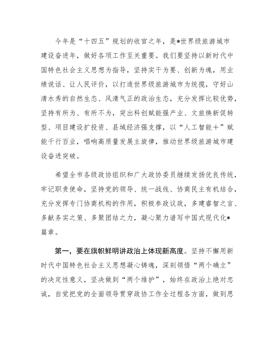 在政协市委员会会议开幕会上的讲话各位委员,同志们、朋友们:今天,中国人民政治协商会议第*届*市委员会第*次会议隆重开幕了。这是全市540万各族人民政治生活中的一件大事。我代表中共*市委员会,向大会召开表示热烈祝贺!向全体政协委员和与会同志们致以诚挚的问候!过去一年,在自治区党委的正确领导下,市委团结带领全市各族人民深入学习贯彻中共二十大和二十届二中、三中全会精神,全面贯彻落实总书记关于政协工作论述的重要指示精神,以打造世界级旅游城市为统揽,扎实推动高质量发展,经济运行稳中向好,各项工作成效显著。铸牢中华民族共同体意识工作得到党中央高度肯定,总书记亲自为我市全国民族团结进步模范集体代表颁奖。生态保护迈上新台阶,*入选联合国生物多样性“自然城市”、被确定为国家首批生态产品价值实现机制试点,*喀斯特入选世界地质遗产地名录。新质生产力培育扎实推进,建成投产全国首条规模化民航大飞机轮胎生产线,打破国外垄断,“*”为国产替代作出重要贡献。国家级专精特新“小巨人”企业、*制造业单项冠军企业数量均居全区第一。重大项目建设实现新突破,长塘水库、灌阳抽水蓄能、龙胜抽水蓄能等一批重大项目开工建设,交通基础设施项目投资超180亿元,“三环十射九联”高速公路网络加快形成。民生保障更加坚实有力,民生领域支出继续保持财政支出的80%以上,就业增收、“一老一小”、教育医疗等问题加力解决,社会大局保持稳定,人民群众的获得感更加充实、幸福感更加充盈。这些成绩的取得,根本在于以同志为核心的中共中央坚强领导,在于新时代中国特色社会主义思想的科学指引,离不开全市上下的团结奋斗、担当实干,也饱含着全市各级政协组织、各民主党派、工商联、无党派人士的智慧和心血。一年来,全市各级政协组织和广大政协委员,深入学习贯彻总书记关于加强和改进人民政协工作的重要思想,牢牢把握团结和民主两大主题,认真履行政治协商、民主监督、参政议政职能,各项委员行动和“双联双创”活动务实有效,三年两次争取到全国政协重要提案,推动一批重要客商到*考察投资,为全市经济社会高质量发展作出了重要贡献。在此,我代表中共*市委员会,向各位委员、各位同志、各位朋友,致以崇高的敬意和衷心的感谢!今年是“十四五”规划的收官之年,是*世界级旅游城市建设奋进年,做好各项工作至关重要。我们要坚持以新时代中国特色社会主义思想为指导,坚持实干为要、创新为魂,用业绩说话、让人民评价,以打造世界级旅游城市为统揽,守好山清水秀的自然生态、风清气正的政治生态,充分发挥比较优势,坚持有所为、有所不为,突出科创赋能强产业、文旅焕新促转型、项目建设扩投资、县域经济强支撑,以“人工智能+”赋能千行百业,唱响高质量发展主旋律,推动世界级旅游城市建设奋进突破。希望全市各级政协组织和广大政协委员继续发扬优良传统,牢记职责使命,坚持党的领导、统一战线、协商民主有机结合,充分发挥专门协商机构的作用,积极参政议政,多建睿智之言、多献务实之策、多聚团结之力,凝心聚力谱写中国式现代化*篇章。第一,要在旗帜鲜明讲政治上体现新高度。坚持不懈用新时代中国特色社会主义思想凝心铸魂,深刻领悟“两个确立”的决定性意义,坚决做到“两个维护”,始终在政治上绝对忠诚,自觉把党的全面领导贯穿政协工作全过程各方面,做到思想上同心、目标上同向、行动上同行,切实把党的主张转化为社会各界的高度共识。第二,要在服务中心大局上彰显新担当。聚焦世界级旅游城市奋进突破、“两个保护”等中心任务,聚焦人工智能、产业发展、文旅焕新等重点工作,深入调查研究,创新协商方式,积极建言献策。发挥政协联系广泛、人才荟萃、智力密集等优势,积极宣传推介*,主动牵线搭桥,为*招商引资多作贡献。坚持人民政协为人民,聚焦就业增收、教育医疗等民生热点难点问题,积极反映社情民意,多做答疑解惑工作,唱响主旋律、传递正能量,为高质量发展汇聚磅礴合力。第三,要在自身建设上展现新形象。坚持以党建引领政协自身建设,深入开展中央八项规定精神学习教育,深刻汲取*涉嫌严重违纪违法的教训,引以为戒,警钟长鸣。...