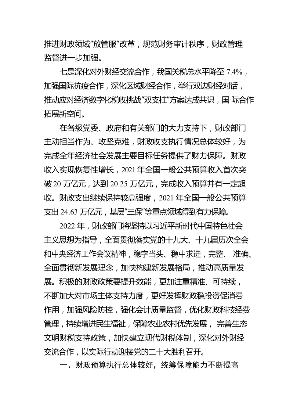 2021年中国财政政策执行情况报告2022年2月27号综述2021年是党和国家历史上具有里程碑意义的一年。面对世纪疫情和百年变局交织的严峻形势,以习近平同志为核心的党中央团结带领全党全国各族人民砥砺奋进,奋力完成改革发展艰巨任务,如期打赢脱贫攻坚战,全面建成小康社会、实现第一个百年奋斗目标,经济发展和疫情防控保持全球领先地位,国家战略科技力量加快壮大,产业链韧性得到提升,改革开放向纵深推进,民生保障有力有效,生态文明建设持续推进,实现了“十四五”良好开局。在党中央的坚强领导下,财政部门坚持以习近平新时代中国特色社会主义思想为指导,统筹疫情防控和经济社会发展,认真贯彻落实“积极的财政政策要提质增效、更可持续”要求。一方面,从支出规模和政策力度着眼,兼顾稳增长和防风险需要,保持财政政策的连续性稳定性可持续性,不急转弯,合理确定赤字率和地方政府专项债券规模,保持适度支出强度,抓实化解地方政府债务风险;另一方面,从优化结构和加强管理着眼,着力在及时、精准、有效上下功夫,建立实施常态化财政资金直达机制,提高财政支出效率,落实“党政机关要坚持过紧日子”要求,调整优化支出结构,着力保障和改善基本民生,提高资金使用绩效,推动构建新发展格局迈出新步伐、高质量发展取得新成效。一是加强财政政策调节,保持必要的财政支出规模,2021年赤字规模为3.57万亿元,新增地方政府专项债券安排3.65万亿元,较好保障国家重大战略任务。上海、广东等地区率先开展全域无隐性债务试点,建立常态化财政资金直达机制并扩大范围,优化和落实减税降费政策,全年新增减税降费约1.1万亿元。二是支持科技自立自强,加大对基础研究的支持,改革完善中央财政科研经费管理,打好关键核心技术攻坚战,启动支持“专精特新”中小企业高质量发展奖补政策,推动优化和稳定产业链供应链。三是持续加大民生投入,支持全民免费接种新冠病毒疫苗,延续实施失业保险稳岗返还等政策,切实做好养老、教育、优抚、防灾救灾等工作,民生保障有力有效。四是推进城乡区域协调发展,支持巩固拓展脱贫攻坚成果同乡村振兴有效衔接,积极支持长江经济带发展、海南自由贸易港建设、浙江探索打造财政推动共同富裕省域范例等,发展格局进一步优化。五是加强生态环境保护,支持碳达峰碳中和工作,加强大气、水、土壤污染防治,出台支持长江全流域建立横向生态保护补偿机制的实施方案,实施新一轮草原生态保护补助奖励政策并扩大范围,全面绿色转型取得新进展。六是深入推进财税体制改革,深化预算管理制度改革,推进财政领域“放管服”改革,规范财务审计秩序,财政管理监督进一步加强。七是深化对外财经交流合作,我国关税总水平降至7.4%,加强国际抗疫合作,深化区域财经合作,举行双边财经对话,推动应对经济数字化税收挑战“双支柱”方案达成共识,国际合作拓展新空间。在各级党委、政府和有关部门的大力支持下,财政部门主动担当作为、攻坚克难,财政收支执行情况总体较好,为完成全年经济社会发展主要目标任务提供了财力保障。财政收入实现恢复性增长,2021年全国一般公共预算收入首次突破20万亿元,达到20.25万亿元,完成收入预算并有一定超收。财政支出继续保持较高强度,2021年全国一般公共预算支出24.63万亿元,基层“三保”等重点领域得到有力保障。2022年,财政部门将坚持以习近平新时代中国特色社会主义思想为指导,全面贯彻落实党的十九大、十九届历次全会和中央经济工作会议精神,稳字当头、稳中求进,完整、准确、全面贯彻新发展理念,加快构建新发展格局,推动高质量发展。积极的财政政策要提升效能,更加注重精准、可持续,不断加大对市场主体支持力度,更好发挥财政稳投资促消费作用,加强风险防控,强化会计质量监督,优化财政科技经费管理,持续增进民生福祉,保障农业农村优先发展,完善生态文明财税支持政策,加快建立现代财税体制,深化对外财经交流合作,以实际行动迎接党的二十大胜利召开。一、财政预算执行总体较好,统筹保障能力不断提高2021年,国民经济持续稳定恢复,主要预期目标全面实现。在此基础上,财政收入实现恢复性增长,财政收支执...