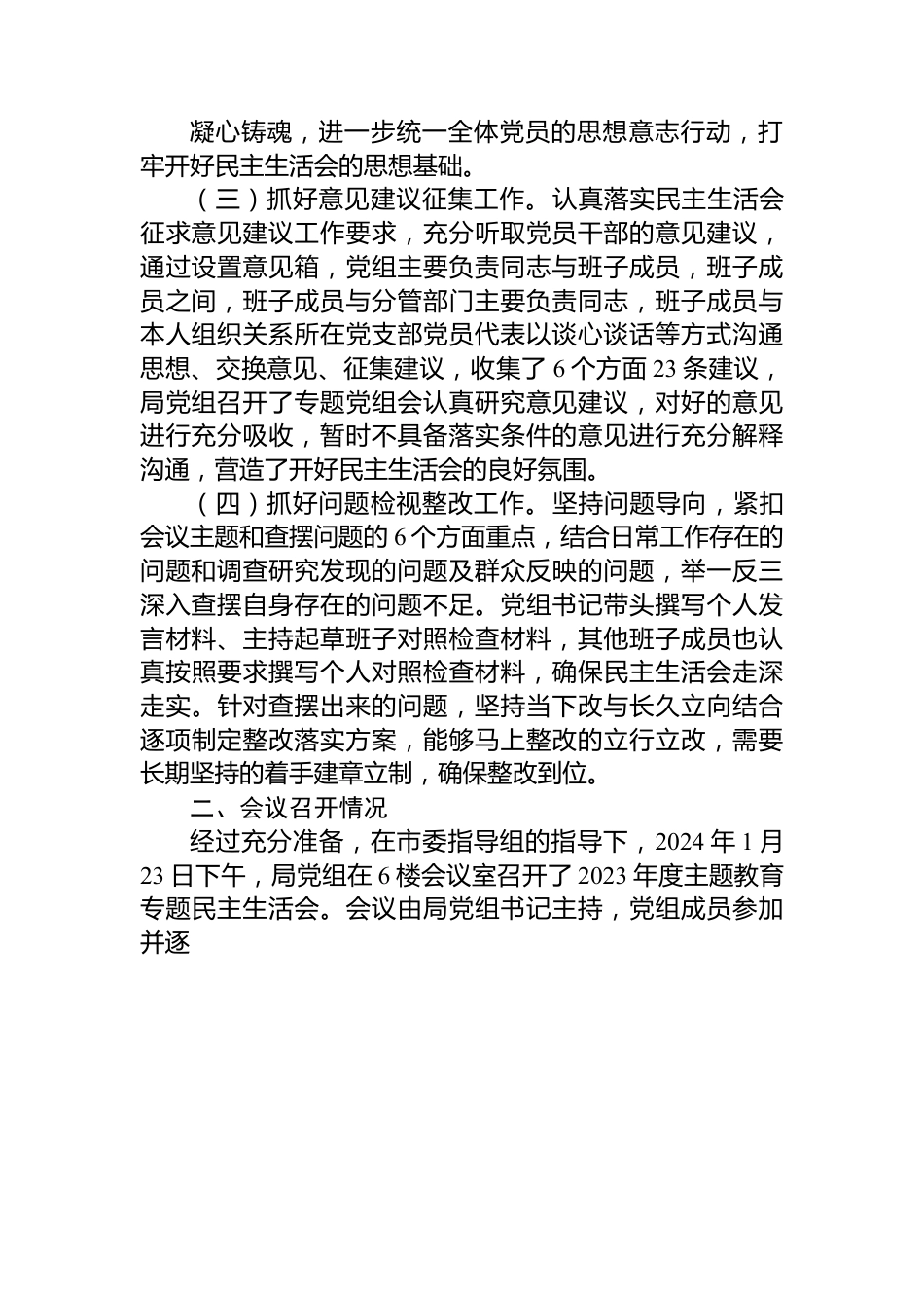 市发改委党组关于主题教育专题民主生活会召开情况的报告根据市委主题教育领导小组《关于开好主题教育专题民主生活会的通知》要求,2024年1月23日,市发改委党组召开了主题教育专题民主生活会。现将有关情况报告如下:一、会前准备情况(一)抓好组织部署工作。局党组高度重视主题教育民主生活会,将其作为检视问题、推动发展的重要抓手,召开专题党组会议认真研究市委主题教育领导小组通知要求,部署贯彻落实措施,要求政工科牵头制定专题民主生活会工作方案,党组班子和班子成员认真撰写对照检查材料,并呈报市委督导组审查。督导组反馈意见后,局党组再次召开党组会议认真研究,对照反馈意见逐一明确落实措施,要求班子成员对照反馈意见,对对照检查材料进行了修改,确保市委督导组有关意见要求得到有效落实。(二)抓好学习研讨工作。始终将学习贯彻习近平新时代中国特色社会主义思想作为首要政治任务,认真落实“第一议题”制度,利用党组会议前置学习、党组读书班集中学习、理论学习中心组专题学习等学习平台,及时跟进学习习近平总书记重要讲话精神和重要指示批示精神,党组书记带头围绕学习要求作重点发言,党组班子成员进行深入研讨,带动全体党员自觉用习近平新时代中国特色社会主义思想凝心铸魂,进一步统一全体党员的思想意志行动,打牢开好民主生活会的思想基础。(三)抓好意见建议征集工作。认真落实民主生活会征求意见建议工作要求,充分听取党员干部的意见建议,通过设置意见箱,党组主要负责同志与班子成员,班子成员之间,班子成员与分管部门主要负责同志,班子成员与本人组织关系所在党支部党员代表以谈心谈话等方式沟通思想、交换意见、征集建议,收集了6个方面23条建议,局党组召开了专题党组会认真研究意见建议,对好的意见进行充分吸收,暂时不具备落实条件的意见进行充分解释沟通,营造了开好民主生活会的良好氛围。(四)抓好问题检视整改工作。坚持问题导向,紧扣会议主题和查摆问题的6个方面重点,结合日常工作存在的问题和调查研究发现的问题及群众反映的问题,举一反三深入查摆自身存在的问题不足。党组书记带头撰写个人发言材料、主持起草班子对照检查材料,其他班子成员也认真按照要求撰写个人对照检查材料,确保民主生活会走深走实。针对查摆出来的问题,坚持当下改与长久立向结合逐项制定整改落实方案,能够马上整改的立行立改,需要长期坚持的着手建章立制,确保整改到位。二、会议召开情况经过充分准备,在市委指导组的指导下,2024年1月23日下午,局党组在6楼会议室召开了2023年度主题教育专题民主生活会。会议由局党组书记主持,党组成员参加并逐一在会上进行了深刻剖析,班子成员之间进行了坦诚相待的批评与自我批评。市委指导组相关同志到会指导,并对会议召开情况进行点评,提出下一步工作要求。最后局党组书记对会议情况进行总结发言,并对整改落实工作进行表态发言。三、批评与自我批评情况(一)班子方面。一是在学习贯彻习近平新时代中国特色社会主义思想方面。主要表现为理论学习的主动性还需进一步增强,融会贯通的能力还不够高,对习近平总书记提出的一系列新思想、新理论、新战略,尤其是对贯彻新发展理念、构建新发展格局的重大理论实践问题理解得不够透彻、不够深入,如何将这一重要思想的世界观方法论转化为指导构建现代产业体系的具体实践的方法还不多一定程度上仍然存在学用脱节的现象。二是在维护党中央权威和集中统一领导方面。主要表现为政治三力还需进一步提高,班子成员虽然能坚定拥护“两个确立”、做到“两个维护”,严守政治纪律和政治规矩,但工作落实还不同程度地存在“本位主义”思想,大局意识还不够强,不善于全市工作大去推动工作,开展工作时更多考虑的是本单位本部门的实际利益,与其他部门的协调配合不够。三是在践行宗旨、服务人民方面。为民造福的政绩观树得还不够牢固,工作中仍存在唯上不唯下的现象,考虑更多上级的要求,班子成员不同程度地存在把干事和个人名利捆绑在一起,“为民干事”想得少、“为己做官”谋得多的情况,一些班子成员联系群众不主动,群众工作本领不高,不善于用群众语言与群众打...