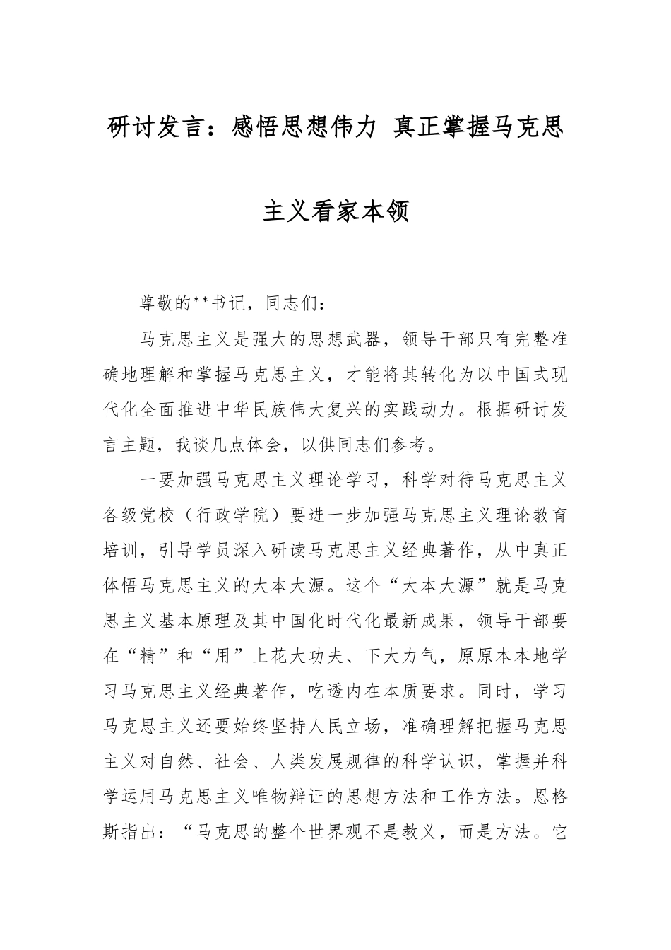 研讨发言:感悟思想伟力真正掌握马克思主义看家本领尊敬的**书记,同志们:马克思主义是强大的思想武器,领导干部只有完整准确地理解和掌握马克思主义,才能将其转化为以中国式现代化全面推进中华民族伟大复兴的实践动力。根据研讨发言主题,我谈几点体会,以供同志们参考。一要加强马克思主义理论学习,科学对待马克思主义各级党校(行政学院)要进一步加强马克思主义理论教育培训,引导学员深入研读马克思主义经典著作,从中真正体悟马克思主义的大本大源。这个“大本大源”就是马克思主义基本原理及其中国化时代化最新成果,领导干部要在“精”和“用”上花大功夫、下大力气,原原本本地学习马克思主义经典著作,吃透内在本质要求。同时,学习马克思主义还要始终坚持人民立场,准确理解把握马克思主义对自然、社会、人类发展规律的科学认识,掌握并科学运用马克思主义唯物辩证的思想方法和工作方法。恩格斯指出:“马克思的整个世界观不是教义,而是方法。它提供的不是现成的教条,而是进一步研究的出发点和供这种研究使用的方法。”马克思主义的性质、特点及辉煌的实践成就决定了它对中国特色社会主义事业的指导作用。历史一再证明,马克思主义不仅是科学的世界观,同时也是科学认识、分析、解决人类社会发展问题的方法论。党员领导干部要一以贯之地坚持学习和运用好辩证唯物主义和历史唯物主义,读经典著作的目的不是为了死记硬背其中的词句,不是为了从中寻找关于当代问题的现成答案,更不是将马克思主义作为“装潢门面”的手段,而是要“悟”其中的基本原理,掌握贯穿其中的方法。新时代掌握马克思主义看家本领需要科学对待马克思主义。自20世纪80年代末90年代初苏联解体、东欧剧变以来,一些西方学者认为社会主义将走到“终点”,历史的发展只有资本主义一条道路。受此影响,一时间马克思主义“过时论”“无用论”甚嚣尘上。有的人认为,马克思主义诞生于19世纪,随着人类社会的飞速发展,其理论已无法解释或不适用于当代社会问题。例如,他们认为资本主义生产社会化与生产资料私有制之间的矛盾已经通过改良和调节的方式得以缓和。社会主义国家的具体实践与马克思、恩格斯设想的共产主义社会差距较大反而是一些发达资本主义国家更接近人类社会的理想状态等等。当然,如果用马克思主义经典著作中的个别语句对号入座地认识当代社会,肯定不能令人信服,我们应认识到马克思主义所指明的是人类社会的发展方向,是历史发展的必然趋势,秉持“过时论”“无用论”观点的学者和政客们根本不理解马克思主义唯物史观,更不理解历史发展的辩证法。对此,A总书记指出,“尽管我们所处的时代同马克思所处的时代相比发生了巨大而深刻的变化,但从世界社会主义500年的大视野来看,我们依然处在马克思主义所指明的历史时代”。这是对其最有力的批驳。教条式对待马克思主义也是当前存在的一种错误态度。马克思主义认为,原理的实质是正确的,但在不同时期对原理的理解与应用是不同的,要实事求是地作出不同的选择。中国共产党的历史充分证明,教条式地对待马克思主义会给中国带来严重危害。20世纪30年代,以王明为代表的“左”倾教条主义,对革命道路问题和斗争的方向问题提出了错误的政策,对革命性质、形势、阶级关系作出了错误的分析,使中国革命一度陷入绝境,给党的事业造成了极大危害。毛泽东在《反对本本主义》一文中对教条主义进行了深刻地批判,提出要一切从实际出发,理论联系实际,根据中国的具体国情研究和解决问题。邓小平指出:“一个党,一个国家,一个民族,如果一切从本本出发,思想僵化,迷信盛行,那它就不能前进,它的生机就停止了,就要亡党亡国。”面对新时代新发展,A总书记多次强调:“对待马克思主义,不能采取教条主义的态度也不能采取实用主义的态度。”领导干部要坚持用马克思主义观察时代、把握时代、引领时代,用鲜活丰富的当代中国实践推动马克思主义发展,坚持在改革中守正创新、不断超越自己,在开放中博采众长、不断完善自己。二要深入社会实践,开展调查研究。发现问题是解决问题的前提,发现问题的有效方法就是深入社会实践,进行调查研究,这也是马克...