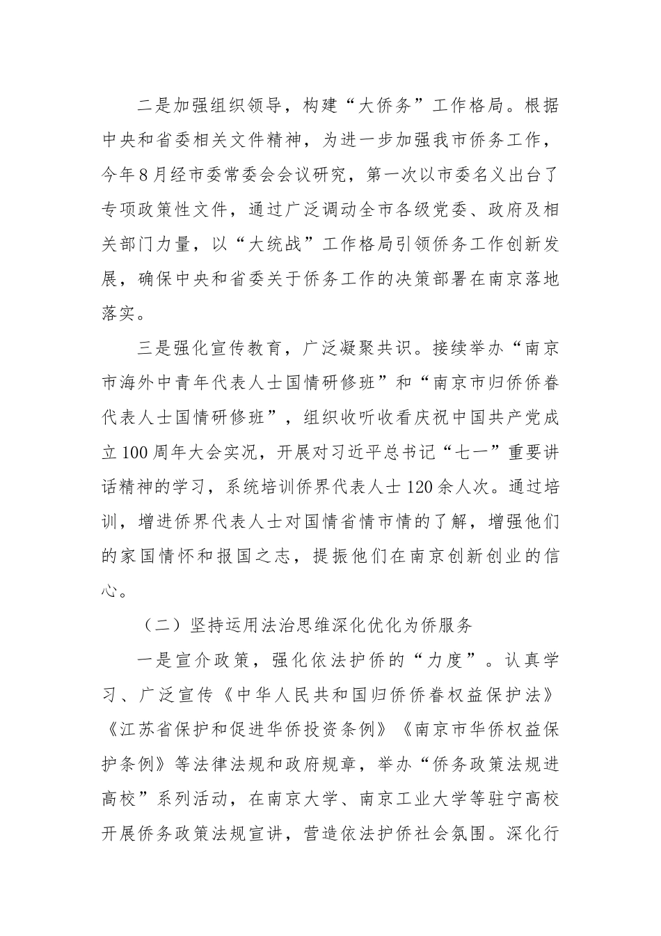 关于我市侨务工作情况的报告主任、各位副主任、秘书长、各位委员:受市政府委托,向市人大常委会报告近年来全市侨务工作情况,请予审议。近年来,在市委的正确领导下,在市人大常委会的监督、指导下,我市深入学习贯彻习近平总书记关于加强和改进统一战线工作的重要思想,将习近平总书记关于侨务工作的重要论述和重要指示批示,作为新形势下做好侨务工作的科学指南和根本遵循,不断开拓思路创新举措,凝聚侨心、汇聚侨力、集聚侨智,在服务创新名城建设、收关“十三五”、布局“十四五”等工作方面,发挥了侨务优势,展现了侨务担当。截至目前,全市共获得国家级侨务荣誉24项、省级侨务荣誉36项。一、近年来侨务工作开展情况(一)坚持党对侨务工作的集中统一领导一是提高政治站位,压实工作责任。遵照新修订的《中国共产党统一战线工作条例》(以下简称《条例》)规定,认真履行“统一领导海外统一战线工作,统一管理侨务工作,统筹协调有关部门和社会团体涉侨工作”的职责。组织力量积极参与我市《关于贯彻〈条例〉的实施方案(草案)》的制定,将《条例》规定和要求转化为指导开展侨务工作的具体举措。二是加强组织领导,构建“大侨务”工作格局。根据中央和省委相关文件精神,为进一步加强我市侨务工作,今年8月经市委常委会会议研究,第一次以市委名义出台了专项政策性文件,通过广泛调动全市各级党委、政府及相关部门力量,以“大统战”工作格局引领侨务工作创新发展,确保中央和省委关于侨务工作的决策部署在南京落地落实。三是强化宣传教育,广泛凝聚共识。接续举办“南京市海外中青年代表人士国情研修班”和“南京市归侨侨眷代表人士国情研修班”,组织收听收看庆祝中国共产党成立100周年大会实况,开展对习近平总书记“七一”重要讲话精神的学习,系统培训侨界代表人士120余人次。通过培训,增进侨界代表人士对国情省情市情的了解,增强他们的家国情怀和报国之志,提振他们在南京创新创业的信心。(二)坚持运用法治思维深化优化为侨服务一是宣介政策,强化依法护侨的“力度”。认真学习、广泛宣传《中华人民共和国归侨侨眷权益保护法》《江苏省保护和促进华侨投资条例》《南京市华侨权益保护条例》等法律法规和政府规章,举办“侨务政策法规进高校”系列活动,在南京大学、南京工业大学等驻宁高校开展侨务政策法规宣讲,营造依法护侨社会氛围。深化行政审批制度改革,指导各区做好涉侨行政权力清单标准化工作,优化流程,一窗受理、一网通办,规范权力运行,提升政务效能。2018年以来,共依法办理各类涉侨行政事项58件。简化华侨恢复户口登记流程,通过市侨办办理回国定居的华侨人数由峰值的31人下降到去年的1人,极大便利了华侨来我市发展。二是畅通渠道,拓展发挥侨力的“维度”。充分发挥侨界代表人士在依法参与国家和社会事务中的独特作用,近5年共提交议案、提案、社情民意和调研报告1250余件。对全市侨界代表人士进行调查摸底,初步建立260名涵盖全市各领域的侨界代表人士数据库,选树推荐多批优秀侨界代表人士多次获评国家和省、市荣誉,激发他们爱国爱乡热情,不断扩大侨务工作的联系面和影响力。推荐海外华裔新生代代表人士参加省级以上研修考察,定期举办“海外代表人士南京行”系列活动,为海外代表人士在宁创新创业搭建平台。三是深化服务,显现为侨服务的“温度”。制定《南京市困难归侨补助专项资金使用相关规定》,明确补助范围与标准,规范资金的申报、审核和发放程序,细致做好对贫困、孤寡等特殊困难侨界群体的救助、帮扶工作。2018年以来累计向低保、重病等困难归侨和1978年前回国的企业退休归侨发放生活补助1078人次,计276.72万元。稳妥做好涉侨信访工作,畅通侨界群众表达渠道,及时回应诉求,化解矛盾和不稳定因素,促进侨界和谐稳定。(三)坚持在服务中心大局中凝侨心聚侨力一是聚焦创新创业,引导侨务资源融入创新名城建设。全市各级侨务部门发挥侨务资源优势,邀请欧美国家、“一带一路”沿线国家政商学界代表人士、外企及海外客商、重点侨商参加“留交会”“金洽会”“软博会”“南京创新周”等各类重大招商引资活动。促成意大利拉斯佩齐亚...