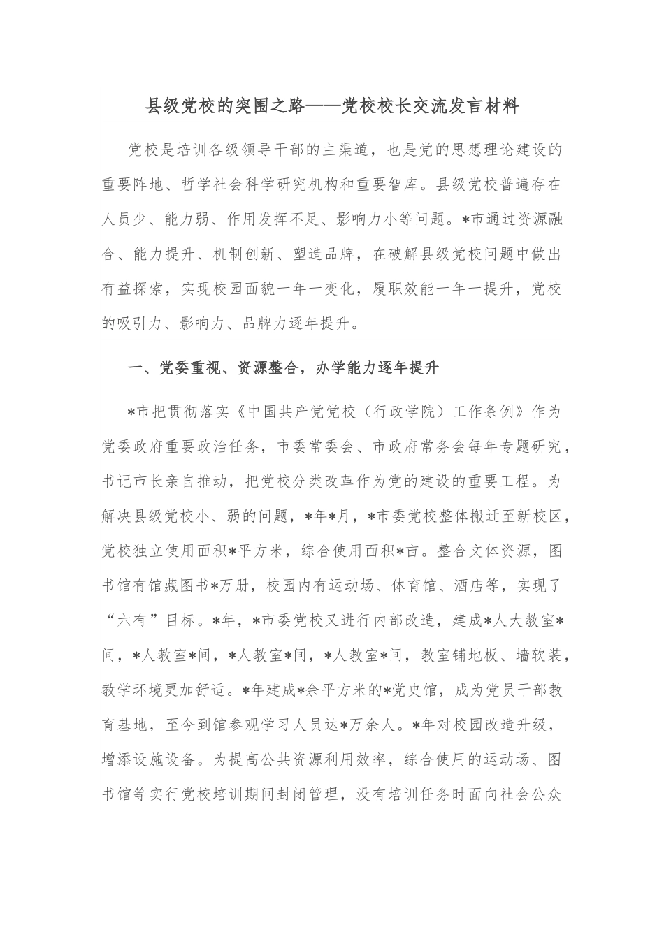 县级党校的突围之路——党校校长交流发言材料党校是培训各级领导干部的主渠道,也是党的思想理论建设的重要阵地、哲学社会科学研究机构和重要智库。县级党校普遍存在人员少、能力弱、作用发挥不足、影响力小等问题。*市通过资源融合、能力提升、机制创新、塑造品牌,在破解县级党校问题中做出有益探索,实现校园面貌一年一变化,履职效能一年一提升,党校的吸引力、影响力、品牌力逐年提升。一、党委重视、资源整合,办学能力逐年提升*市把贯彻落实《中国共产党党校(行政学院)工作条例》作为党委政府重要政治任务,市委常委会、市政府常务会每年专题研究,书记市长亲自推动,把党校分类改革作为党的建设的重要工程。为解决县级党校小、弱的问题,*年*月,*市委党校整体搬迁至新校区,党校独立使用面积*平方米,综合使用面积*亩。整合文体资源,图书馆有馆藏图书*万册,校园内有运动场、体育馆、酒店等,实现了“六有”目标。*年,*市委党校又进行内部改造,建成*人大教室*间,*人教室*间,*人教室*间,*人教室*间,教室铺地板、墙软装,教学环境更加舒适。*年建成*余平方米的*党史馆,成为党员干部教育基地,至今到馆参观学习人员达*万余人。*年对校园改造升级,增添设施设备。为提高公共资源利用效率,综合使用的运动场、图书馆等实行党校培训期间封闭管理,没有培训任务时面向社会公众开放。为减少经营管理成本,校内酒店委托管理,有培训任务时封闭管理,没有任务时对外营业,让党校轻装上阵,专注于主责主业。通过提档升级,不仅让党校具备教学功能,还要让党校形象提升,校园环境美丽、舒适,给学员较好的学习环境。二、聚焦主业、发挥作用,党校地位逐年提升突出党校政治属性,把党校办成培养党员干部的主阵地、主渠道,聚焦教育培训、理论建设、科研咨政主责主业,着力解决师资不足、课程不优、调研不深等问题,通过加强队伍建设、提高管理水平、建立激励机制等,发挥作用、有为有位,提升地位。1.加强自身建设,解决能力不足问题强化党的建设,改建支部,落实制度,加强政治工作,促思想作风转变。制定《党校工作手册》,完善《教师授课》《财务管理》等*项制度,规范人财物管理,建立奖优罚劣机制,激励创先争优。秉持公平公正,坚持严管厚爱,凝聚共识,解决各自为政、推诿扯皮等问题。强化能力提升,每两周集中学习、每季度讲课评比、送老师外出培训,建立组织部、党校党建联建,党校老师列席市委中心组学习会制度等。为教师提供舞台,自主培训教师全员上课;建立党校老师联系基层制度,安排教师到抗疫一线、乡村振兴、基层治理一线,让教师在一线锻炼,一线有党校身影。近两年,补充*名教师,去年提拔*名副科级干部。2.整合多方资源,解决师资和阵地不足问题党校编制少、优秀教师少、教育阵地少问题突出。*建立师资库,市委市政府所有县级领导干部、部门镇(街)一把手和组织部所有同志纳入师资库;行业精英、知名人士等纳入师资库;合作学院及各方面专家纳入师资库,库内现有*余名兼职教师队伍。建设教育培训基地,拓展培训课堂。打造命名三星堆博物馆、向阳镇改革发展陈列馆、高新区产业孵化园等*个党员干部教育培训基地;建成连山镇沙田村、汉州街道马牧社区等*个现场教学点。3.聚焦三项职能,解决没有地位的问题我们加强组织部与党校深度融合、一体管理,党校、组织部作为一个考核整体,干部统筹使用、综合锻炼。教育培训方面。提升教学规范化、制度化水平,注重培训实效。精心设置课程、精心选择师资,每个培训班都主题鲜明,有主题讨论、有成果展示、有学员评分、有课程反馈。*年举办*个主体班,培训*人次。开展外训班*期*余人次。每季度开展村(社区)干部培训,利用腾讯“为村”平台在网上建立微党校、云课堂。制定《*党校*年主体班次教学计划》,拟办主体班*期,培训*余人。现已举办*期*人,其中主体班*期*人。持续开展“送课到基层”,去年送课近*场次,现正组织到基层宣讲省第十二次党代会精神。理论研究方面。校领导带头调查研究,每年至少发表一篇调研报告或理论文章。*年,党校向上级党校报送理论征文*篇、公开发表*篇。党校老师是党的思想政治工作的...
