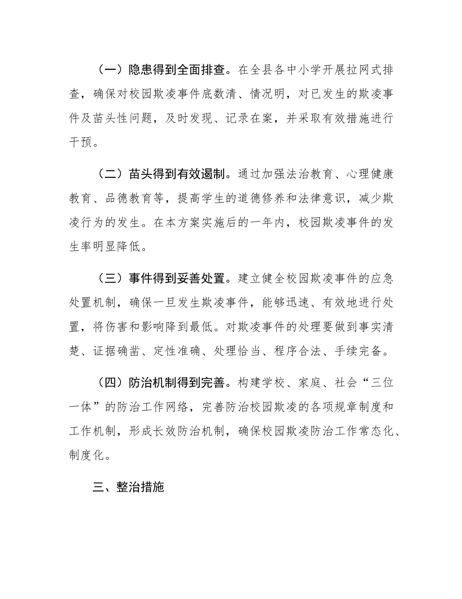 校园欺凌整治工作方案加强中小学生欺凌整治是学校安全工作的重中之重,事关学生的身心健康和全面发展,事关千家万户的幸福和社会和谐稳定。为深入贯彻党的二十大精神,有效防治中小学生欺凌,根据教育部等十一部门《加强中小学生欺凌综合治理方案》,制定本方案。一、指导思想以新时代中国特色社会主义思想为指导,全面贯彻党的教育方针,落实立德树人根本任务,坚持“教育为先、预防为主、保护为要、法治为基”的原则,健全预防、处置学生欺凌的工作体制和规章制度,以形成防治中小学生欺凌长效机制为目标,以促进部门协作、上下联动为保障,确保中小学生欺凌防治工作落到实处,把校园建设成最安全、最阳光的地方,办好人民满意的教育,为培养德智体美劳全面发展的社会主义建设者和接班人创造良好条件。二、整治目标(一)隐患得到全面排查。在全县各中小学开展拉网式排查,确保对校园欺凌事件底数清、情况明,对已发生的欺凌事件及苗头性问题,及时发现、记录在案,并采取有效措施进行干预。(二)苗头得到有效遏制。通过加强法治教育、心理健康教育、品德教育等,提高学生的道德修养和法律意识,减少欺凌行为的发生。在本方案实施后的一年内,校园欺凌事件的发生率明显降低。(三)事件得到妥善处置。建立健全校园欺凌事件的应急处置机制,确保一旦发生欺凌事件,能够迅速、有效地进行处置,将伤害和影响降到最低。对欺凌事件的处理要做到事实清楚、证据确凿、定性准确、处理恰当、程序合法、手续完备。(四)防治机制得到完善。构建学校、家庭、社会“三位一体”的防治工作网络,完善防治校园欺凌的各项规章制度和工作机制,形成长效防治机制,确保校园欺凌防治工作常态化、制度化。三、整治措施(一)加强教育,提升防范意识。一是开展专题教育。各学校要将防治学生欺凌专题教育纳入学校德育工作的重要内容,通过课堂教学、班团队会、专题讲座、国旗下讲话、案例分析等形式,定期对学生进行防治欺凌教育。每学期至少开展*次专题教育,确保教育内容覆盖全体学生。二是强化法治教育。充分发挥法治副校长的作用,每学期至少开展*次法治进校园活动,向学生普及《中华人民共和国未成年人保护法》《中华人民共和国预防未成年人犯罪法》等法律法规,增强学生的法律意识和法治观念,使学生自觉遵守法律法规,不实施欺凌行为。三是加强心理健康教育。各学校要配齐专兼职心理健康教育教师,开好心理健康教育课程,完善心理咨询室建设,为学生提供心理咨询和辅导服务;加强心理健康测评,精准掌握师生心理健康状况,及时科学有效干预,引导学生树立正确的人生观、价值观和世界观,培养学生健全的人格和良好的心理品质,引导学生正确对待挫折和压力,学会合理调节情绪,防止因心理问题引发欺凌事件。(二)明确流程,依法规范处置。一是建立应急处置机制。各学校要制定校园欺凌事件应急处置预案,明确应急处置流程和各部门职责。一旦发生欺凌事件,学校要立即启动应急预案,迅速组织人员进行处置,确保受欺凌学生得到及时救治和心理安抚,同时保护好现场,收集相关证据。二要规范处置程序。学校在接到欺凌事件报告后,要立即组成调查小组,对事件进行全面调查,了解事件的起因、经过和结果,确定欺凌行为的性质和责任。根据调查结果,依据学校规章制度和相关法律法规,对欺凌者进行严肃处理,同时对受欺凌学生进行心理疏导,妥善处置家长诉求。处理结果要及时告知家长,并向县教育局报告。三要做好跟踪回访。学校要对欺凌事件的处理情况进行跟踪回访,了解受欺凌学生的身心恢复情况和欺凌者的思想转变情况,及时发现和解决问题。对屡教不改或情节严重的欺凌者,要会同有关部门进行重点教育和矫治。(三)加强管理,形成整治合力。一是建立排查制度。各学校要定期开展校园欺凌隐患排查,通过问卷调查、学生访谈、教师走访等方式,全面了解学生之间的关系状况,及时发现可能导致欺凌事件发生的苗头性问题。每周至少进行*次班级排查,每月至少进行*次学校全面排查,并将排查结果及时上报县教育局。二是加强日常管理。学校要建立健全校园安全管理制度,加强对校园的日常巡查,特别是对课间、午...