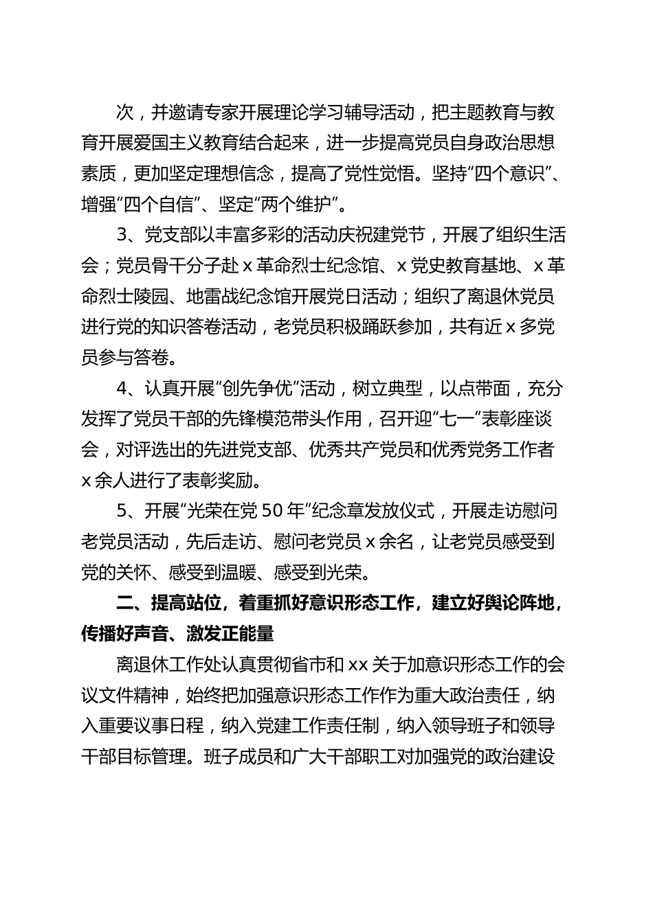 离退休党支部上半年党建工作总结离退休党支部党建工作的基本指导思想:提高政治站位,强化组织功能,落实精准服务,发挥老同志作用,助推xx事业发展。在这个基础上,提出了五项基本目标:把离退休老党员的政治优势保持好、把老同志的待遇落实好、把老同志的生活服务好、把老同志的精神提振好、把老同志的作用发挥好。以这个目标为基础,把党建工作与离退休服务管理工作的中心工作紧密结合起来,坚持“四个着力”——着力加强政治引领,强化党组织凝聚力;着力加强精准化服务理念,把真诚和爱奉送给尊敬的老同志;着力强化服务功能,让老同志有安全感、安定感、安逸感;着力加强老同志作用发挥,为社会贡献正能量。围绕着这个指导思想,带领各党支部支和广大离退休党员,积极落实,较好地发挥党支部的战斗堡垒作用和党员的先锋模范作用,取得了圆满的工作成效。目前离退休老同志x人,其中离休干部x人,党员x人。一、积极开展主题教育,牢固把握政治站位离退休支部坚持以习习近平新时代中国特色社会主义思想为指导,深入学习贯彻党的二十大精神,扎实开展学习贯彻习近平新时代中国特色社会主义思想主题教育。1、坚持理论学习的常态化、制度化,基本按照每两周一次集中学习活动,上半年开展中心组(扩大)学习9次。2、抓好支部建设,开展离退休党支部书记、委员培训班3次,并邀请专家开展理论学习辅导活动,把主题教育与教育开展爱国主义教育结合起来,进一步提高党员自身政治思想素质,更加坚定理想信念,提高了党性觉悟。坚持“四个意识”、增强“四个自信”、坚定“两个维护”。3、党支部以丰富多彩的活动庆祝建党节,开展了组织生活会;党员骨干分子赴x革命烈士纪念馆、x党史教育基地、x革命烈士陵园、地雷战纪念馆开展党日活动;组织了离退休党员进行党的知识答卷活动,老党员积极踊跃参加,共有近x多党员参与答卷。4、认真开展“创先争优”活动,树立典型,以点带面,充分发挥了党员干部的先锋模范带头作用,召开迎“七一”表彰座谈会,对评选出的先进党支部、优秀共产党员和优秀党务工作者x余人进行了表彰奖励。5、开展“光荣在党50年”纪念章发放仪式,开展走访慰问老党员活动,先后走访、慰问老党员x余名,让老党员感受到党的关怀、感受到温暖、感受到光荣。二、提高站位,着重抓好意识形态工作,建立好舆论阵地,传播好声音、激发正能量离退休工作处认真贯彻省市和xx关于加意识形态工作的会议文件精神,始终把加强意识形态工作作为重大政治责任,纳入重要议事日程,纳入党建工作责任制,纳入领导班子和领导干部目标管理。班子成员和广大干部职工对加强党的政治建设和意识形态工作的认识更加深刻,进一步强化了“四个意识”,坚定了“四个自信”,抓好宣传工作,把党的方针、政策及时传递给老同志;把党史学习中重要的内容、先模人物、英雄故事及时地推送给老同志;把身边优秀的事迹挖掘出来,形成良好的舆论氛围。三、打造党支部工作的新特色,积极促进xx和社区共建,丰富和提高老同志的生活质量积极推动xx离退休党支部、离退休基层党组织和社区党组织“三位一体”共建模式。xx离退休党支部指导离退休基层党组织,从强化共建意识入手,以为社区居民服务为抓手,不断密切与社区党组织的联系,并通过社区党组织加强与街道党组织的沟通,形成相互依存、相互服务的整体合力,营造了“小社区大党建、凝聚众人心”的共建氛围。离退休党支部与x街道党委开展了xx的共建项目,共建的目标:整治大院的居住和治安环境,共同建设文明小区,创造幸福生活。在共建过程中,离退休党支部积极协调和发动,居住在小区的离退休党支部成员身先士卒,他们打前锋,自费清理小区内陈年垃圾、清除小区杂草,带动小区内x名党员,成立了治安巡逻队、组建了义务服务队,小区面貌有了重大改观,社区居民受到了鼓舞,街道领导看到了希望,给予重点支持。四、创新党建模式,加强党建融合发展,发挥老同志作用老同志志愿者协会成立x年来,他们不计名利,几年来围绕着关心下一代、扶贫助困、文化科技服务、环境保护、爱老助老等方面,发挥人才、知识、科技、教育优势,开展了山区支教、家长学校、农民工子弟...