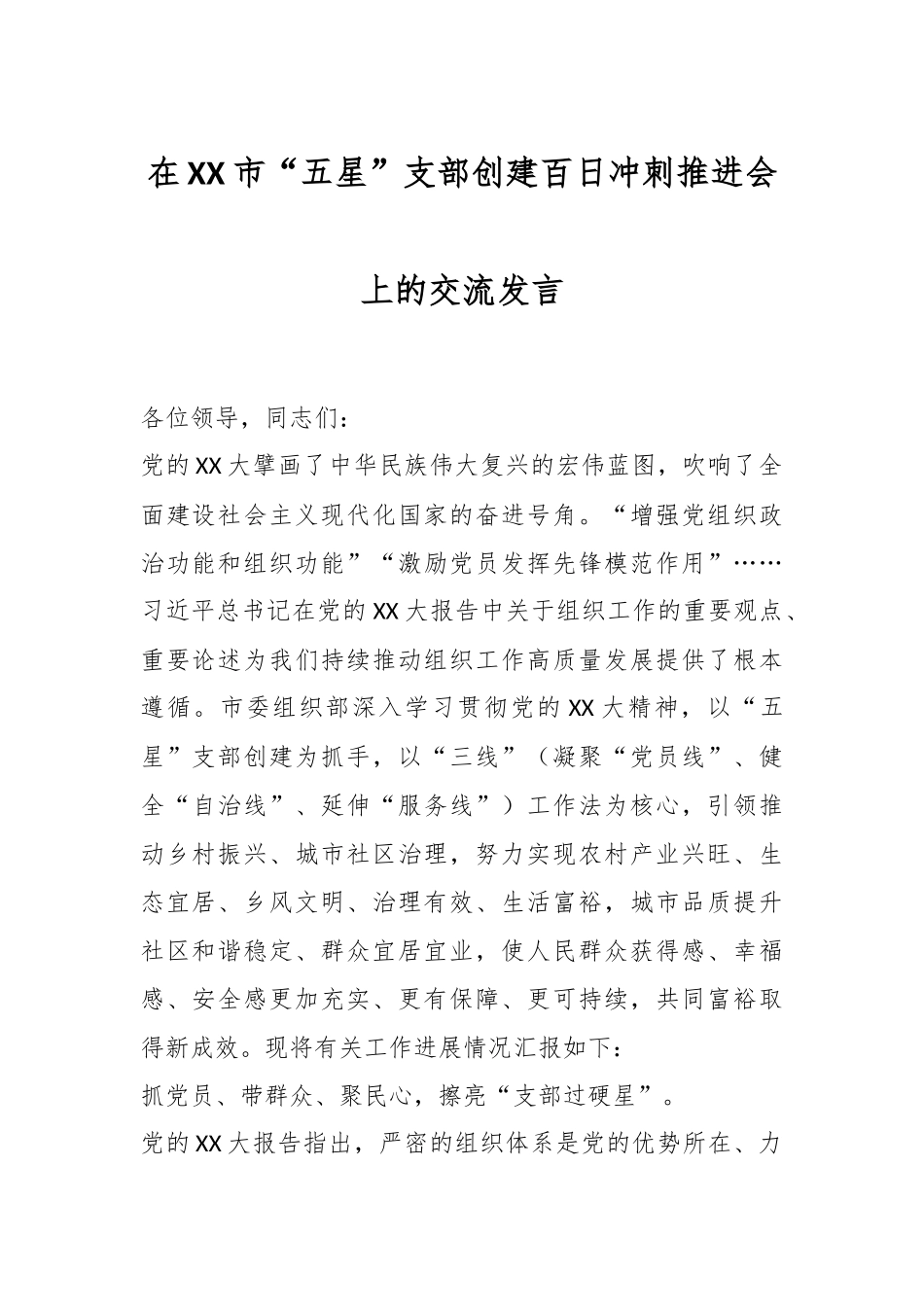在XX市“五星”支部创建百日冲刺推进会上的交流发言各位领导,同志们:党的XX大擘画了中华民族伟大复兴的宏伟蓝图,吹响了全面建设社会主义现代化国家的奋进号角。“增强党组织政治功能和组织功能”“激励党员发挥先锋模范作用”……习近平总书记在党的XX大报告中关于组织工作的重要观点、重要论述为我们持续推动组织工作高质量发展提供了根本遵循。市委组织部深入学习贯彻党的XX大精神,以“五星”支部创建为抓手,以“三线”(凝聚“党员线”、健全“自治线”、延伸“服务线”)工作法为核心,引领推动乡村振兴、城市社区治理,努力实现农村产业兴旺、生态宜居、乡风文明、治理有效、生活富裕,城市品质提升社区和谐稳定、群众宜居宜业,使人民群众获得感、幸福感、安全感更加充实、更有保障、更可持续,共同富裕取得新成效。现将有关工作进展情况汇报如下:抓党员、带群众、聚民心,擦亮“支部过硬星”。党的XX大报告指出,严密的组织体系是党的优势所在、力量所在。只有党的各级组织都健全、都过硬,形成上下贯通、执行有力的严密组织体系,党的各项事业才能有效推行。一是探索建立“积分银行、五星超市”,激励党员担当作为。以党支部为单位成立“积分银行”,围绕党员履行义务等方面进行量化积分,所得积分可在“五星超市”里兑换物品。通过“一月一登记、一季一兑换、一年一评比”,激励党员在环境整治、纠纷调解等基层治理中担当作为。二是强化数字赋能党建引领基层治理,带动群众参与治理。在“党建三单”APP的基础上,围绕融合、矩阵、为民、科技等理念,升级打造智慧党建平台,强化“民呼必应、党员联户”治理功能,全面开创“一网统管、一键通办、一呼百应、一览无余”的数字赋能基层治理新格局,助力“平安法治星”“文明幸福星”创建落实。三是探索建立“‘五星’党员、‘十星’农户”评选机制,引导党群共同创星。开展“五星”党员、“十星”农户评选工作,围绕党员联户情况、党员(农户)参与公益活动和志愿活动等,对表现积极、作用突出的党员(农户)宣传报道并给予物质奖励,形成党群同心共创“五星”的浓厚氛围。抓双绑、聚资源、促流转,擦亮“产业兴旺星”。党的XX大报告指出,发展乡村特色产业,拓宽农民增收致富渠道产业兴旺是解决农村一切问题的前提,要推动乡村产业振兴,必须紧紧围绕发展现代农业,围绕农村一二三产业融合发展,构建乡村产业体系。一是精准对接“绑得牢”。针对有特色产业的村,通过农户“绑定”合作社、合作社“绑定”龙头企业,使农户、合作社、龙头企业之间建立长期稳定的利益链接机制,实现“龙头企业+集体经济组织+合作社+农户”抱团发展、互利共赢。二是整合资源“引得好”。针对有集体经济收入但缺乏特色产业的村,充分整合村里资源禀赋,科学选择适合自身发展、符合市场需求的特色优势产业,大力扶持村级集体经济上档升级确保集体经济持续稳定增收。三是土地入股“盘得活”。针对无资源、无产业、无区位优势的传统农业乡村,探索成立“土地银行”,采取土地经营权入股、集体资产入股等方式,引导村民将土地经营权入股村集体经济股份合作社并作为分红依据,集中流转的土地由合作社统一经营,通过规模化经营,推动土地收益完成三次分配。抓治理、巧分类、强整治,擦亮“生态宜居星”。党的XX大报告指出,要统筹乡村基础设施和公共服务布局,建设宜居宜业和美乡村。这一重大部署,一以贯之地体现了我们党对乡村建设规律的深刻把握,是对乡村生态价值的重新认识和灵活运用,指明了新时代我国乡村现代化的方向。一是稳抓空宅治理,让乡村“美起来”。成立市、乡两级领导小组,制定“拆、定、转、变、管、租”工作机制,全市440余处农村空闲宅基地变为游园、花园、果园、菜园,作为村集体建设用地用于村庄建设或产业发展。二是巧抓垃圾分类,让乡村“绿起来”。建设湿垃圾发酵区将湿垃圾粉碎后堆肥发酵成有机肥,无偿提供给村民使用推进垃圾能源化;村内统一发放分类垃圾桶,引导农户进行垃圾分类推进垃圾减量化。通过干部包片、党员联户、网格量化考核等形式,目前已实现垃圾分类。三是狠抓环境整治,让乡村“靓起来”。强力开展...
