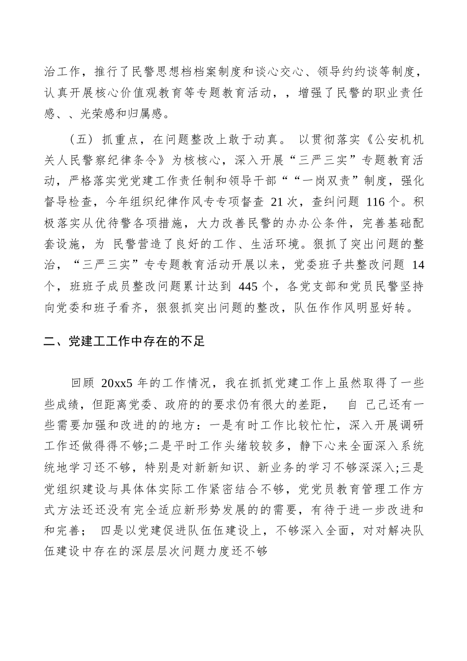 (共4篇)《公安局xx书记抓党建述职报告》范文版(1)尊敬的各位领导、同志们:XX市公安局局XX新区分局党委现有党委成员5名,下辖党支部3个个,共有党员52名。今年以以来,我带领局党委一班人,,以“三严三实”专题教育为契机,以党员群众满意为标标准,以基层党组织“五个好好”、党员“五带头”为目标,统筹党的思想、组织、作作风、制度建设四条主线,狠狠抓基层党建工作,有力地推动了各项公安工作的顺利进行。现述职如下,不妥之处处,请批评指正。一、抓党建工作的情况(一)抓自身,在党建工作中以身作则则。作为党委书记,我在抓班子学习上:一是进一步完善党委中心组理论学习制度通过不断的学习,班子成员的理论水平和党性修养进一步步提高,领导作风进一步改进,班子整体工作能力明显增增强。二是由我召集召开党委扩大会议,要求全局民警对对照“三严三实”(严以修身、严以用权、严以律己,谋谋事要实、创业要实、做人要要实)要求,聚焦对党忠诚、、个人干净、敢于担当,把思想教育、党性分析、整改落落实、立规执纪结合起来,着力解决“不严不实”问题,,巩固和拓展党的群众路线教教育实践活动成果。三是严格按照“三重一大”的工作要要求开展,提高党委班子工作的透明度,增进理解,维护团结。(二)抓制度,在在责任落实上规范有力。为确保党建工作经常化、规范化化,落实了党建目标管理责任制,将党建工作内容和要求细化、量化,支部工作目标清楚、方向明确,较好地解决了基层党建工作如何抓、、主动抓的问题。坚持检查考考核结果与评选先进、职务升降挂钩,充分调动了基层单位抓党建工作的积极性。进进一步规范了局领导和各支部书记上党课制度。进一步落落实了经常性谈话谈心制度,,大力倡导各级党组织领导做到“七必谈”:即职务工作变动必谈,受到奖惩必谈,,家庭发生重大变化必谈,工工作中遇到挫折必谈,班子中、民警中发生矛盾必谈,群众对某个问题有反映必谈,,发现违纪苗头必谈。通过狠狠抓党建各项制度的落实,巩固了我局党建工作成果,保证了各项公安党建工作任务的顺利完成。(三)抓基础,在基层党建中不遗余力力。注重教育培训,先后开展了入党积极分子、党建知识学习、警衔晋升培训、法制培训等教育培训,党民警综合素质得到进一步提升。。注重从严治党,认真开展党党员干部管理制度“废、改、、立”工作,建立完善党建、、党风廉政建设各项制度,以制度促作风转变,促工作落落实。注重发展党员,注重从业务能手、模范标兵和优秀青年中发展党员,从源头上上保证党员队伍的质量。注重人才培养,选送30余名党党员参加各种培训,以“定期期、及时、适时”为原则,轮轮岗交流一批优秀干部,增强队伍的凝聚力,调动民警的工作积极性。(四)抓教育,在思想建设上抢抓先手。在公安内网开通了公安党建专栏,帮助了全局基层党党组织和广大党员了解党的政政策、开展党务工作、进行工工作指导,为促进全局党建工工作搭建了一个新的平台。按照《思想政治工作规范》的总要求,强化队伍的思想政政治工作,推行了民警思想档档案制度和谈心交心、领导约约谈等制度,认真开展核心价值观教育等专题教育活动,,增强了民警的职业责任感、、光荣感和归属感。(五)抓重点,在问题整改上敢于动真。以贯彻落实《公安机机关人民警察纪律条令》为核核心,深入开展“三严三实”专题教育活动,严格落实党党建工作责任制和领导干部““一岗双责”制度,强化督导检查,今年组织纪律作风专专项督查21次,查纠问题116个。积极落实从优待警各项措施,大力改善民警的办办公条件,完善基础配套设施,为民警营造了良好的工作、生活环境。狠抓了突出问题的整治,“三严三实”专专题教育活动开展以来,党委班子共整改问题14个,班班子成员整改问题累计达到445个,各党支部和党员民警坚持向党委和班子看齐,狠狠抓突出问题的整改,队伍作作风明显好转。二、党建工工作中存在的不足回顾20xx5年的工作情况,我在抓抓党建工作上虽然取得了一些些成绩,但距离党委、政府的的要求仍有很大的差距,自己己还有一些需要加强和改进的的地方:一是有时工作比较忙忙,深入开展调研工作还做得得不够;二是平时工作...