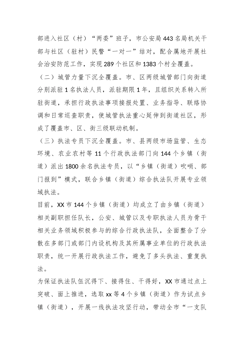 关于某市强化执法力度提升治理效能工作报告XX市深入贯彻落实党中央和省委部署要求,以“基层建设年”为抓手,着力解决乡镇(街道)综合行政执法力量不足、不会执法、不敢执法、“多头”执法等问题,创新开展行政执法力量下沉乡镇(街道),加强基层执法力量,提升乡镇(街道)行政执法能力,以高质量的行政执法成效解锁基层治理的“法治密码”。一、创新机制整合执法力量乡镇、街道是基层治理的主阵地,综合行政执法是打通基层治理“最后一公里”的重要抓手,推进下沉执法力量全覆盖是提升乡镇、街道综合执法能力的有效手段。为了让乡镇(街道)有职有权有能力管理好辖域内的事,有效提升乡镇(街道)统筹协调和综合管理权,XX市委组织部研究制定了《关于推进全市行政执法力量下沉,提升基层行政执法效能的实施意见》及4个配套办法,推动市县两级公安、城管等执法队伍有力有序有效下沉乡镇(街道),实现市、县两级行政执法力量下沉“三个覆盖”。(一)公安力量下沉全覆盖。全市141名公安派出所所长全部进入乡镇(街道)领导班子,926名社区(驻村)民警全部进入社区(村)“两委”班子,市公安局443名局机关干部与社区(驻村)民警“一对一”结对,配合属地开展社会治安防范工作,实现289个社区和1383个村全覆盖。(二)城管力量下沉全覆盖。市、区两级城管部门向街道分别派驻1名执法人员,派驻期限1年,且组织关系转入所驻街道,承担行政执法事项接报处置、业务指导、联络协调和日常巡查职责,使城管执法重心延伸到街道社区,形成了覆盖市、区、街三级联动机制。(三)执法专员下沉全覆盖。市、县两级市场监管、生态环境、农业农村等11个行政执法部门向144个乡镇(街道)派出1800余名执法专员,以“乡镇(街道)吹哨、部门报到”模式,联合乡镇(街道)综合执法队开展专业领域执法。目前,XX市144个乡镇(街道)均成立了由乡镇(街道)相关副职担任队长,公安、城管以及专职执法人员为骨干相关业务领域积极参与的综合行政执法队,全面整合了分散在多部门或部门内设机构及其所属事业单位的行政执法职责,统一开展行政执法工作,避免了多头执法、重复执法。为保证执法队伍沉得下、接得住、干得好,XX市通过点上突破、面上推进,选取xx等4个乡镇(街道)作为试点乡镇(街道),开展一线执法攻坚行动,带动全市“一支队伍管执法”走深走实。XX县XX镇创新管理方式,打造“125”队伍建设模式,即1支综合行政执法队下设2支分队,按照区域细化5个执法小队,将全镇基层治理网格体系优势与综合行政执法有机融合,确保执法区域全覆盖XX区先行先试,成立街道综合执法队并将城管执法中队整建制下沉至7个街道,与街道综合执法队合署办公,共同开展综合执法。XX街道严格按照市委、区委要求,聚焦街情实际,深入分析研判,摸索出了“12345”工作法,即建立一支综合行政执法队;坚持综合执法流程明确、权责清单明确;建立联合执法机制、规范协调联动机制、行风效能机制;做到阵地建设规范化、法制审核规范化、工作督导规范化、考核标准规范化;努力打造“权责清晰、功能集成、扁平一体、运行有效、执行有力”的执法新模式,为执法力量下沉积累了宝贵经验。二、联合执法提高行政效能XX市XX区XX街道综合行政执法队成立伊始,便深入到街道市容环境整治工作中去。由于违法行为人在规定期满后仍未整改,XX街道综合行政执法队联合区城市管理执法大队对XX佳苑一违法建筑进行了拆除。联动执法,强化部门与乡镇(街道)多跨协同,是XX市执法力量下沉强化基层治理的重要手段。遇到行政执法事项清单以内的问题,综合执法队直接进行处理。遇到事项清单以外的执法事项,乡镇(街道)及时“吹哨”,有关行政执法队伍或执法专员在接哨后马上报到,实现“乡街吹哨、部门报到、接诉即办”。市、县两级开展的跨层级、跨部门、跨领域的联合检查、联合执法,在快速办结案件的同时,也让基层各类营业场所被检查次数同比减少了60%,真正做到一次检查、全面诊断和集中治理、一次到位。XX市积极建设推广基层治理数字化平台,乡镇(街道)平安(民生服务)负责人、网格员等可以运用手机APP上报日常巡查中发现的安全隐患及...