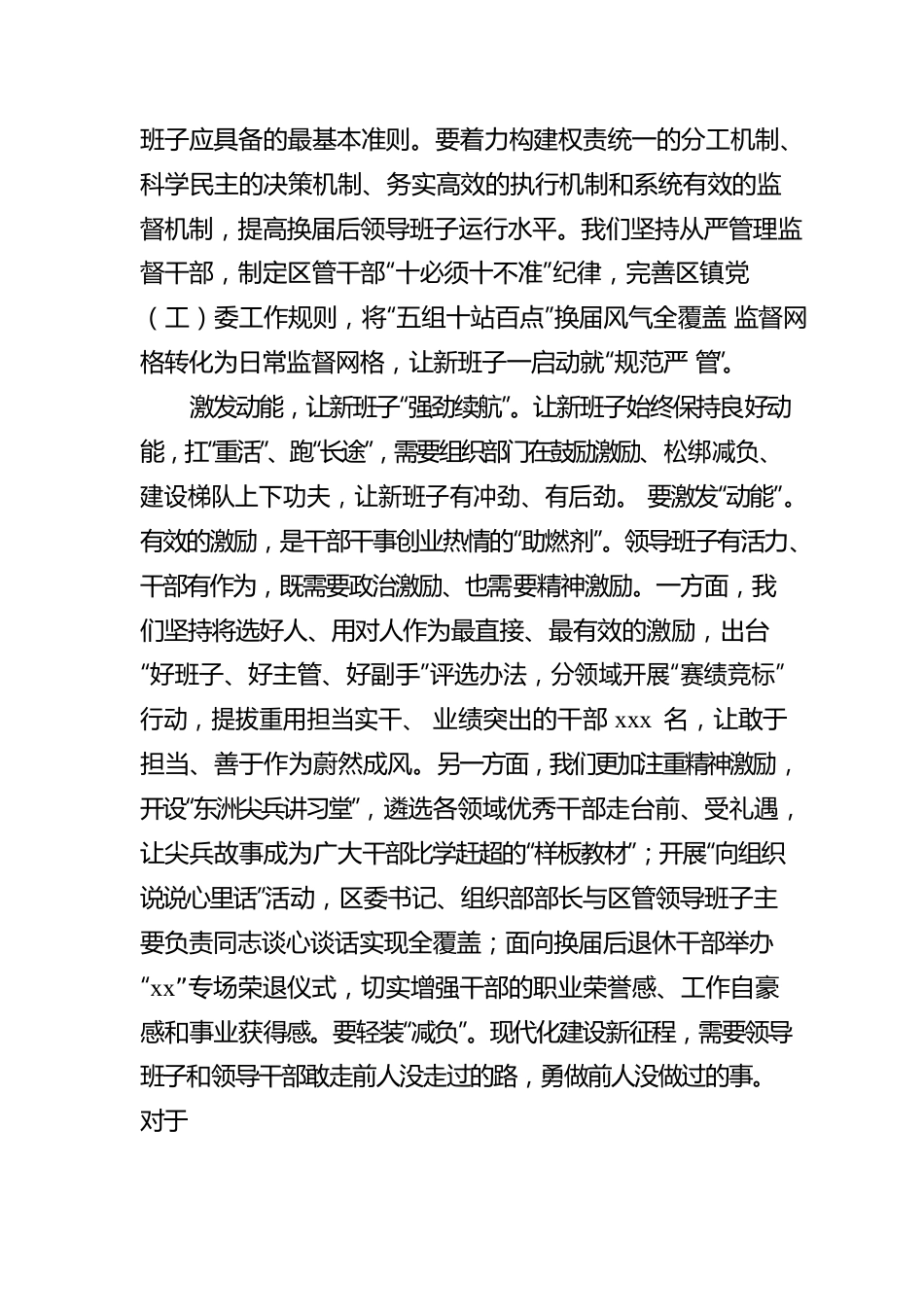 今年是地方领导班子集中换届后全新启航之年。xx市xx区早在镇党委换届前,就同步谋划加强换届后领导班子建设,于镇党委换届结束后第一时间部署开展以“树示范标准、争创‘五好班子’,树示范标杆、争当‘五强主官’,树示范标兵、争做‘五优副手’”为主要内容的“三树三争”活动,全面激发干部活力、增强班子整体功能。铸魂赋能,让新班子“扎稳根基”。换届后的新班子要适应高质量发展和现代化建设需要,既要政治过硬,也要本领高强。要把准政治方向。政治建设是党的根本建设,是领导班子能力建设的灵魂。要把习近平新时代中国特色社会主义思想作为领导班子建设头等大事,切实增强“四个意识”、坚定“四个自信”、做到“两个维护”、捍卫“两个确立”。我们依托中央党校、焦裕禄干部学院等院校,举办x期“旗帜鲜明讲政治·强心铸魂炼忠诚”专题轮训班,开设“东洲思享”专栏,开展“领导干部学思践悟月月谈”活动,教育引导领导干部在真学真信中坚定理想信念,在学思践悟中牢记初心使命。要提升专业能力。社会主义现代化建设,对领导干部的专业能力提出了更高要求。要坚持干什么学什么、缺什么补什么,大力加强专业化能力培训,帮助新班子打造又博又专、推陈出新的素养结构。换届后,我们及时启动实施“蓄力东洲”能力提升计划,分为“培根铸魂、赋能提质、固本强基、促行致用”x个系列,先后举办xx期培训班,培训干部xxxx余人次。要强化实践锻炼,注重在乡村振兴、项目建设等一线历练干部,在复杂局面、突发事件中考验干部,在打硬仗、扛重活、攻难关中练出真功夫。我们启动实施“六线蓄能·百干增智”实践锻炼工程,集中选派xxx名换届后新任科级干部和优秀年轻干部,分赴国家部委、中心工作等x个方向、xx个专线挂职锻炼,推动xx名干部在部门、镇街♘区、国企之间交流任职,着力培养专业素养、实践能力“双过硬”的复合型干部。调强功能,让新班子“高效运转”。换届后的新班子好比一辆新车,需要一个磨合的过程,在这一过程中,组织部门要跟踪管理、调强功能,帮助磨合、顺利开局。要定目标、明路径。我们推行任期目标公开承诺制,xx个镇党委新班子均向区委递交履职承诺书,并公开向群众承诺,强化目标意识,凝聚发展合力。要补短板、强功能。对领导干部个体,要开展适岗评价,用考察结果印证选拔初衷,对一时打不开局面的干部,延长试用期;对长期没有改进提高的,个别调整。对领导班子整体,要进行换届“后评估”,客观全面分析换届后新班子运行情况,及时发现问题,精准整改提高。我们建设了“干部云”大数据分析研判系统,多维度甄别验证,准确研判新班子和领导干部的优势不足、调优方向等,为精准识别干部、增强班子整体功能提供真实全面的基本信息和科学依据。要立规矩、治未病。依制而行,是高效规范领导班子应具备的最基本准则。要着力构建权责统一的分工机制、科学民主的决策机制、务实高效的执行机制和系统有效的监督机制,提高换届后领导班子运行水平。我们坚持从严管理监督干部,制定区管干部“十必须十不准”纪律,完善区镇党(工)委工作规则,将“五组十站百点”换届风气全覆盖监督网格转化为日常监督网格,让新班子一启动就“规范严管”。激发动能,让新班子“强劲续航”。让新班子始终保持良好动能,扛“重活”、跑“长途”,需要组织部门在鼓励激励、松绑减负、建设梯队上下功夫,让新班子有冲劲、有后劲。要激发“动能”。有效的激励,是干部干事创业热情的“助燃剂”。领导班子有活力、干部有作为,既需要政治激励、也需要精神激励。一方面,我们坚持将选好人、用对人作为最直接、最有效的激励,出台“好班子、好主管、好副手”评选办法,分领域开展“赛绩竞标”行动,提拔重用担当实干、业绩突出的干部xxx名,让敢于担当、善于作为蔚然成风。另一方面,我们更加注重精神激励,开设“东洲尖兵讲习堂”,遴选各领域优秀干部走台前、受礼遇,让尖兵故事成为广大干部比学赶超的“样板教材”;开展“向组织说说心里话”活动,区委书记、组织部部长与区管领导班子主要负责同志谈心谈话实现全覆盖;面向换届后退休干部举办“xx”专场荣退仪式,切实增强干部的职...