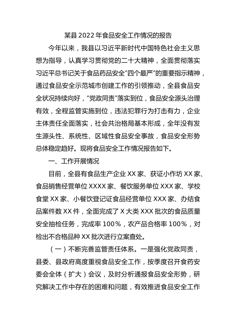 某县2022年食品安全工作情况的报告今年以来,我县以习近平新时代中国特色社会主义思想为指导,认真学习贯彻党的二十大精神,全面贯彻落实习近平总书记关于食品药品安全“四个最严”的重要指示精神,通过食品安全示范城市创建工作的引领推动,全县食品安全状况持续向好,“党政同责”落实到位,食品安全源头治理有效,全程监管实施到位,违法犯罪行为打击有力,企业主体责任全面落实,社会共治格局基本形成,全年没有发生源头性、系统性、区域性食品安全事故,食品安全形势总体稳定趋好。现将食品安全工作情况报告如下。一、工作开展情况目前,全县有食品生产企业XX家、获证小作坊XX家、食品销售经营单位XXXX家、餐饮服务单位XXX家、学校食堂XX家、小餐饮登记证食品经营单位XXX家、办结食品案件数XX件,全面完成了X大类XXX批次的食品质量安全抽检任务,完成率100%,农产品合格率100%,对检出不合格品种XX批次进行立案查处。(一)不断完善监管责任体系。一是强化党政同责,县委、县政府高度重视食品安全工作,按季度召开食药安委会全体(扩大)会议,及时分析通报食品安全形势,研究解决工作中存在的困难和问题,有效推进食品安全工作二是强化责任落实,进一步完善“党政同责、源头治理、齐抓共管、社会共治”的食品安全工作格局,建立一系列工作机制,强化县乡两级“横向到边,纵向到底”的综合治理格局。将食品安全工作全面纳入地方政府绩效考核范围,结合省级食品安全示范城市创建工作,进一步明确各乡镇党委、政府和相关部门的工作任务、具体职责,织密了从农田到餐桌的食品安全监管“防护网”。三是强化经费保障,县财政累计拨付经费XX万元用于食品抽检监测,拨付经费XX万元用于省级食品安全示范城市创建活动,强化农村集体聚餐监管,有效落实村级食品协管员报酬,食品安全专项经费得到有效保障。(二)持续强化食品综合治理。一是深入开展食品安全“守底线、查隐患、保安全”专项行动,聚焦食品生产企业、餐饮服务单位、网络订餐、校园食品安全及婴幼儿配方乳品等重点领域,全面排查食品安全风险和隐患,取得了阶段性成效。二是结合市场监管“铁拳行动”和“春雷行动”,加大各类食品违法违规行为打击力度,共办结食品案件XX件、罚没款XX万元,食品违法违规行为得到有效遏制。三是积极开展食品小作坊风险隐患大排查行动,组织实施蜂产品蔬菜制品、白酒等X类重点食品生产企业及小作坊专项整治,化解食品小作坊安全风险,逐步形成食品小作坊行业长效监管机制。四是开展农村假冒伪劣食品专项整治行动收缴假冒伪劣食品XXXX多公斤,查处假冒伪劣食品XX件、罚款X万元。五是全面落实地方党政领导干部食品安全包保责任制,完成食品企业主体分级XXXX户,落实XXX名包保干部与XXXX户食品企业的层级对应工作,完成率达100%。(三)有序推进食品智慧监管。一是开展“食品生产监管能力建设年”活动,督促企业严格落实食品安全主体责任,全县食品生产企业监督抽考企业覆盖率100%,合格率100%,有效提升了企业食品安全管理能力。二是全面推进“互联网+智慧监管”建设,共接入“透明车间”XX家、“阳光仓储”XX家、“明厨亮灶”XXX家。三是深入推进重点食品生产企业产品电子追溯体系建设,全县食品生产企业追溯平台应用率稳定在XX%以上,基本实现了“顺向可追踪、逆向可溯源、风险可管控、公众可查询”。四是对XXXX户餐饮企业开展了网上巡查和风险等级评定,其中A级XXX家、B级XXX家、C级XX家、D级X家。(四)提升食品安全监管能力。一是加强食品生产经营企业疫情常态化监管,严格落实食品生产经营单位疫情防控主体责任。二是扎实开展省级食品安全示范城市创建活动,逐条逐项按标准落实创建任务,确保创建工作深入推进。三是完成中考、高考等重大活动期间食品安全保障工作,确保全县重大活动、重大会议期间的食品安全。四是开展农村集体聚餐备案管理,报告登记XX家、流动厨师登记XX个、聚餐人数XXXX人,全年农村集体聚餐没有发生食品安全事件。五是推进文明用餐和反食品浪费监管,开展“杜绝餐饮浪费、厉行勤俭节约”宣传教育活动X场次,发放张贴倡议书XXXX份。六是强化餐饮业油烟污染问...
