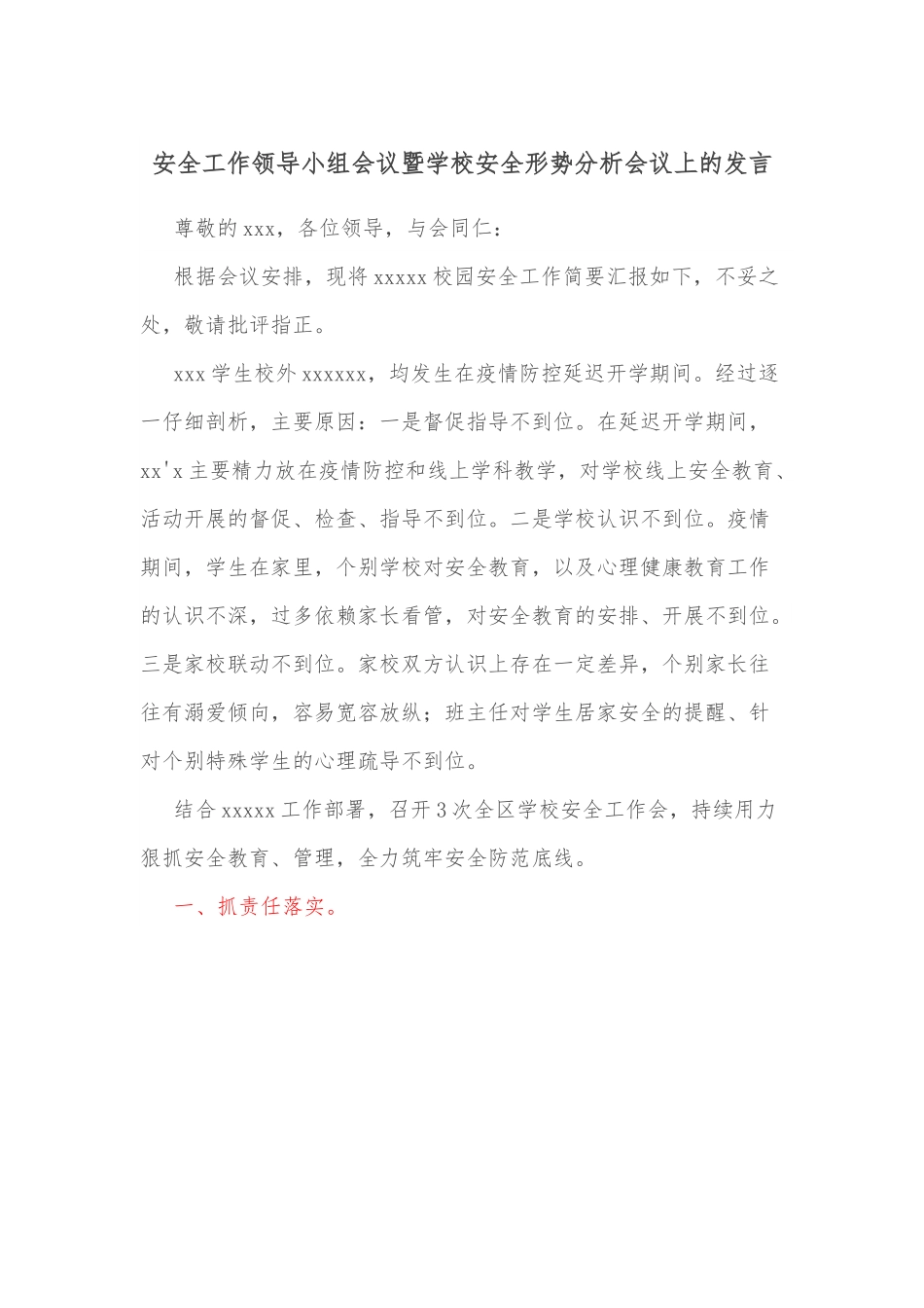 安全工作领导小组会议暨学校安全形势分析会议上的发言尊敬的xxx,各位领导,与会同仁:根据会议安排,现将xxxxx校园安全工作简要汇报如下,不妥之处,敬请批评指正。xxx学生校外xxxxxx,均发生在疫情防控延迟开学期间。经过逐一仔细剖析,主要原因:一是督促指导不到位。在延迟开学期间,xx'x主要精力放在疫情防控和线上学科教学,对学校线上安全教育、活动开展的督促、检查、指导不到位。二是学校认识不到位。疫情期间,学生在家里,个别学校对安全教育,以及心理健康教育工作的认识不深,过多依赖家长看管,对安全教育的安排、开展不到位。三是家校联动不到位。家校双方认识上存在一定差异,个别家长往往有溺爱倾向,容易宽容放纵;班主任对学生居家安全的提醒、针对个别特殊学生的心理疏导不到位。结合xxxxx工作部署,召开3次全区学校安全工作会,持续用力狠抓安全教育、管理,全力筑牢安全防范底线。一、抓责任落实。落实《xxxxxxxx》,印发《xxxxxxxxx》《xxxxxxxx》,严格落实学校安全工作“三级挂联”制度,切实加强校园安全防范。压紧压实校长第一责任人责任,分管副校长、安保主任的直接责任,教师的岗位责任,针对入校及放学、晨练及晨读、三餐及课前、上课及课间、晚辅及夜间等10个时段和“十项”重点防范内容,对学校39类管理人员定点定时、定岗定人,实行校园安全网格管理。二、抓教育引导。抓牢课堂主阵地,上好“生命、生态、安全”课程。推广交通安全手语操,“小手拉大手”活动,普及交通安全知识,教育学生不乘坐非运营车辆和三轮车。扎实深入开展防溺水“五个一”的宣传教育活动,全区各中小学举办专题讲座60余次;开展“一盆水闭气”防溺水体验活动,参与学生达5万余人次。利用每天上午和下午最后一节课的最后5分钟,“4.15”国家安全教育日、“5.12”防灾减灾日等重要时间节点,通过“国旗下的讲话”、班会、团队会,在校门口设立固定“七不两会”标牌,创办预防溺水知识黑板报,充分利用电子显示屏、橱窗等,进行预防溺水提醒。印发告家长书5万余份,与学生家长签订《XXXXXXXXXXX》,把防溺水要求落实到学生家长身上。三、抓心理疏导。校校配备专兼职心理健康教师、建成心理辅导室,开展心理问题防范专项培训3期,培训教师、德育主任等127人次。建立特殊群体学生专档,密织“心理健康辅导教师+班主任+学科教师”全链条,广泛开展线上线下心理健康教育,邀请检察院等部门专家开展专题讲座,抓实个别心理辅导。四、抓多方联动。对校内在建工地用水、人工开挖的积水深坑等进行排查整治,设立醒目的警示标志、加装防护设施。对校园周边、学生上下学途经的河道、水库、池塘、水坑等危险水域,进行全面排查,并及时增设防溺水警示标识95个,排查整治安全隐患11处。同时,积极配合有关部门在事故多发地和上放学关键时段,组织学校教师加强巡查与监管。强化家校联动,学校提前将放学时间、安全注意事项告知家长,学生到家第一时间报告班主任,重点做好双休日、节假日等重要时段安全防范;学生从家里出发,家长第一时间告知班主任,班主任及时清点学生到校情况并反馈。强化部门联动,出台全区学校疫情防控及校园周边环境综合治理实施方案,推进镇(街道)将校园周边综合治理工作纳入公共安全治理体系,城区学校在路口显眼位置设置固定交警执勤点,更新电子警示灯装置及限速标牌;上学与放学时段对部分路段实行临时交通管制,采取“避让出入、错时出入、禁止出入”等措施,开展校园交通安全及周边环境专项整治10余次。各位领导、与会同志,在今后工作中,我们将认真贯彻今天的会议精神,学习借鉴各兄弟县区的好经验好做法,切实抓好校园安全工作,为XXX教育发展贡献更多XXXXX力量。
