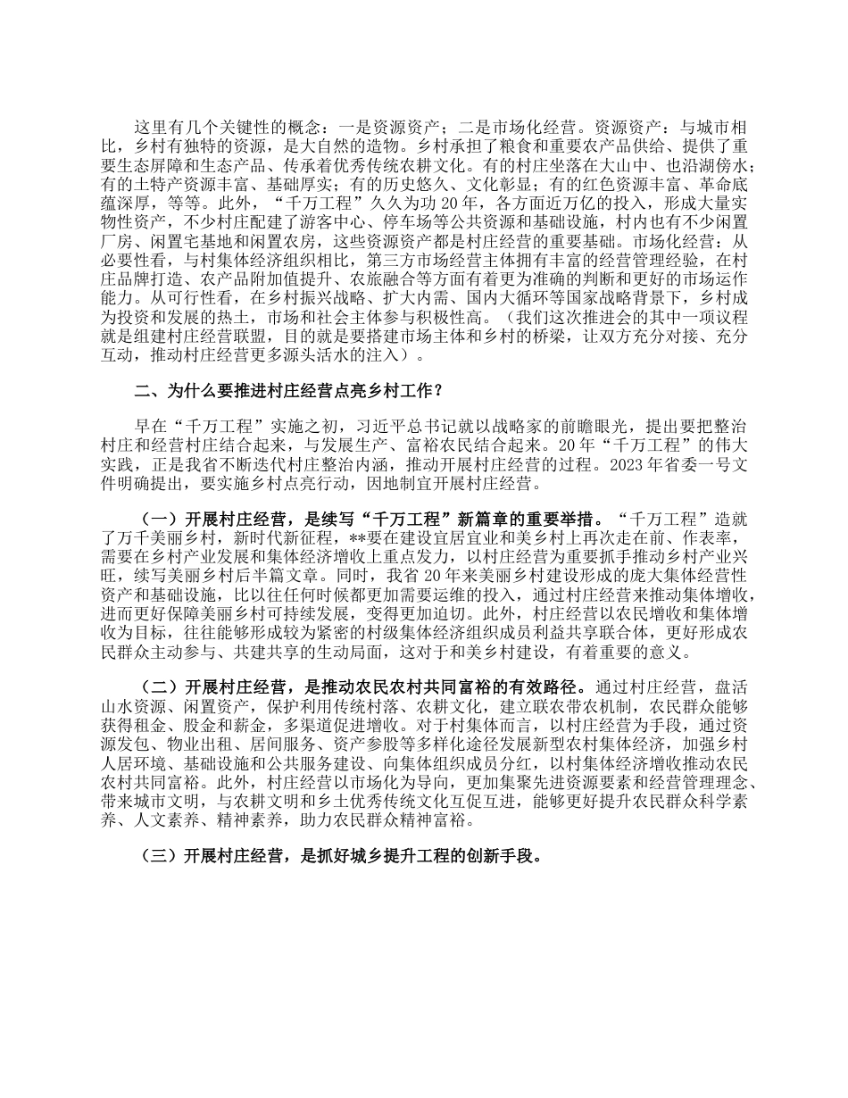 在2023年全省村庄经营点亮乡村工作推进会上的讲话同志们:近日,习近平总书记对“千万工程”作出重要批示,充分肯定20年来持之以恒、锲而不舍推进的工作成效,为**持续深化“千万工程”、推进乡村全面振兴指明了前进方向、注入了强大动力。今天,我们在**市**区召开全省村庄经营点亮乡村工作推进会,主要目的是深入学习贯彻习近平总书记关于“千万工程”重要批示精神,以主题教育活动为契机,以村庄经营为工作突破口来“点亮”乡村,加速拓宽“绿水青山就是金山银山”转化通道,推动**万千美丽乡村加快发展美丽经济,更好造福农民群众。(我们这个推进会也是“千万工程”20周年系列活动的其中一项)刚才,*主任和***老师作了主旨演讲,对我们村庄经营工作提供了很好的思路,请大家认真吸收;**市、**市、**市**区、**县、**市**镇**村、**立尚传播公司等6个地方和单位分别围绕村庄经营点亮乡村工作作了交流发言,明天上午大家还将考察**区**村、**村和**村典型做法,请各地认真学习借鉴。村庄经营总的来说还是一个新生事物,全省面上也还处在谋划和初步推进阶段,下面我结合一些地方的经验和探索,和大家交流探讨下面几个方面的内容。一、什么是村庄经营点亮乡村?“点亮乡村”是前段时间省领导在调研美丽乡村工作时提出来的一个很形象的说法。这个乡村依山傍水、环境秀美、基础设施和公共服务也较为完备,但人气不足,特别是到了晚上,异常寂静,与其他偏远乡村没什么差别。因此,点亮乡村这个提法,从字面意思上看是把乡村的夜色点亮,但领导实际上想表达的是怎么样才能把乡村的产业点亮、人气点亮,把农民群众的美好生活点亮。最近,省委农办正在起草制订《乡村点亮行动实施方案》,准备打出一套组合拳,通过一系列抓手实施点亮乡村行动,包括农创客点亮乡村、艺术点亮乡村、数字经济点亮乡村等等,我们的村庄经营点亮乡村,也是其中的一项抓手举措,在今天这个会上作重点部署。以村庄经营为抓手点亮乡村,那么村庄经营到底是什么?我的理解,村庄经营就是基于村庄独特自然条件和既有资源禀赋,以盘活利用村庄资源和资产为抓手,以市场化经营为手段,推动村集体经济、农民“双增收”和宜居宜业和美乡村建设。这里有几个关键性的概念:一是资源资产;二是市场化经营。资源资产:与城市相比,乡村有独特的资源,是大自然的造物。乡村承担了粮食和重要农产品供给、提供了重要生态屏障和生态产品、传承着优秀传统农耕文化。有的村庄坐落在大山中、也沿湖傍水;有的土特产资源丰富、基础厚实;有的历史悠久、文化彰显;有的红色资源丰富、革命底蕴深厚,等等。此外,“千万工程”久久为功20年,各方面近万亿的投入,形成大量实物性资产,不少村庄配建了游客中心、停车场等公共资源和基础设施,村内也有不少闲置厂房、闲置宅基地和闲置农房,这些资源资产都是村庄经营的重要基础。市场化经营:从必要性看,与村集体经济组织相比,第三方市场经营主体拥有丰富的经营管理经验,在村庄品牌打造、农产品附加值提升、农旅融合等方面有着更为准确的判断和更好的市场运作能力。从可行性看,在乡村振兴战略、扩大内需、国内大循环等国家战略背景下,乡村成为投资和发展的热土,市场和社会主体参与积极性高。(我们这次推进会的其中一项议程就是组建村庄经营联盟,目的就是要搭建市场主体和乡村的桥梁,让双方充分对接、充分互动,推动村庄经营更多源头活水的注入)。二、为什么要推进村庄经营点亮乡村工作?早在“千万工程”实施之初,习近平总书记就以战略家的前瞻眼光,提出要把整治村庄和经营村庄结合起来,与发展生产、富裕农民结合起来。20年“千万工程”的伟大实践,正是我省不断迭代村庄整治内涵,推动开展村庄经营的过程。2023年省委一号文件明确提出,要实施乡村点亮行动,因地制宜开展村庄经营。(一)开展村庄经营,是续写“千万工程”新篇章的重要举措。“千万工程”造就了万千美丽乡村,新时代新征程,**要在建设宜居宜业和美乡村上再次走在前、作表率,需要在乡村产业发展和集体经济增收上重点发力,以村庄经营为重要抓手推动乡村产业兴旺,续写美丽乡村后半篇文章。同时,我省2...