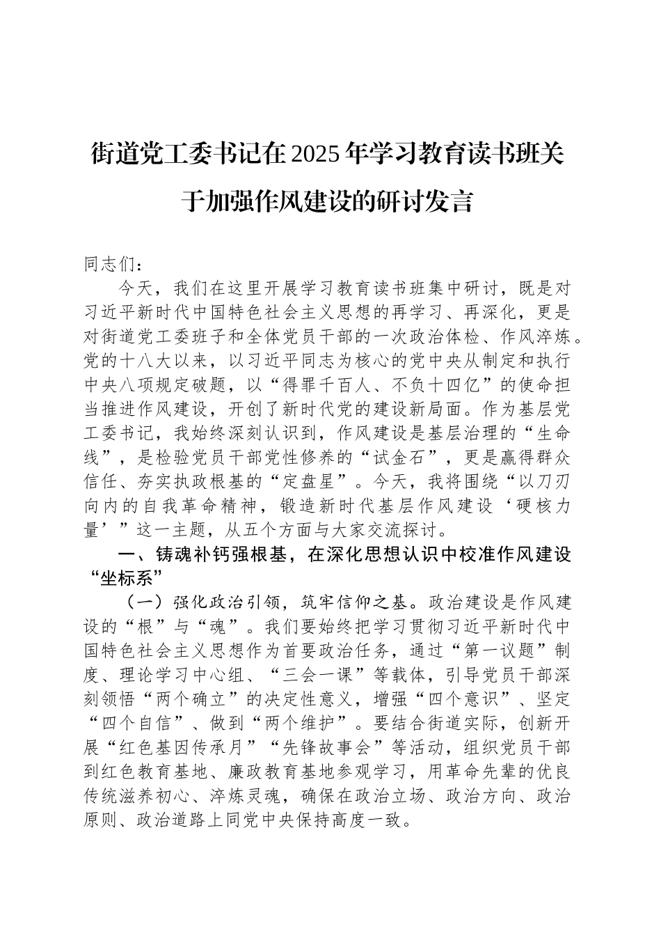 街道党工委书记在2025年学习教育读书班关于加强作风建设的研讨发言同志们:今天,我们在这里开展学习教育读书班集中研讨,既是对习近平新时代中国特色社会主义思想的再学习、再深化,更是对街道党工委班子和全体党员干部的一次政治体检、作风淬炼。党的十八大以来,以习近平同志为核心的党中央从制定和执行中央八项规定破题,以“得罪千百人、不负十四亿”的使命担当推进作风建设,开创了新时代党的建设新局面。作为基层党工委书记,我始终深刻认识到,作风建设是基层治理的“生命线”,是检验党员干部党性修养的“试金石”,更是赢得群众信任、夯实执政根基的“定盘星”。今天,我将围绕“以刀刃向内的自我革命精神,锻造新时代基层作风建设‘硬核力量’”这一主题,从五个方面与大家交流探讨。一、铸魂补钙强根基,在深化思想认识中校准作风建设“坐标系”(一)强化政治引领,筑牢信仰之基。政治建设是作风建设的“根”与“魂”。我们要始终把学习贯彻习近平新时代中国特色社会主义思想作为首要政治任务,通过“第一议题”制度、理论学习中心组、“三会一课”等载体,引导党员干部深刻领悟“两个确立”的决定性意义,增强“四个意识”、坚定“四个自信”、做到“两个维护”。要结合街道实际,创新开展“红色基因传承月”“先锋故事会”等活动,组织党员干部到红色教育基地、廉政教育基地参观学习,用革命先辈的优良传统滋养初心、淬炼灵魂,确保在政治立场、政治方向、政治原则、政治道路上同党中央保持高度一致。(二)深化理论学习,补足精神之钙。理论上的清醒是行动上自觉的前提。我们要坚持把学习习近平总书记关于作风建设的重要论述作为必修课,通过举办专题读书班、开展研讨交流、撰写心得体会等方式,深刻把握作风建设的时代内涵和实践要求。要紧密结合街道中心工作,聚焦群众反映强烈的痛点难点问题,开展“带着问题学、联系实际学”活动,将理论学习成果转化为破解基层治理难题的实际行动。例如,针对老旧小区改造、物业管理等民生问题,组织党员干部深入学习相关政策法规,研究制定切实可行的解决方案,以理论指导实践,以实践深化理论。(三)树牢宗旨意识,厚植为民情怀。作风建设的核心是保持党同人民群众的血肉联系。我们要始终坚持以人民为中心的发展思想,将群众满意度作为检验作风建设成效的“晴雨表”。通过开展“民情大走访”“群众接待日”等活动,面对面倾听群众意见,实打实解决群众困难。要建立“群众诉求清单”和“整改落实台账”,实行“销号管理”,确保群众反映的问题件件有落实、事事有回音。同时,要创新服务方式,推广“互联网+政务服务”模式,让数据多跑路、群众少跑腿,切实提升群众的获得感、幸福感、安全感。二、建章立制强保障,在完善制度体系中织密作风建设“防护网”(一)完善责任落实机制,拧紧“责任链条”。作风建设是一项系统工程,必须强化责任担当。街道党工委要严格落实全面从严治党主体责任,制定《作风建设责任清单》,明确党工委书记第一责任人责任、班子成员“一岗双责”,形成一级抓一级、层层抓落实的工作格局。要建立“党工委统筹部署、纪工委监督检查、部门协同推进”的工作机制,定期召开作风建设专题会议,研究解决突出问题,确保作风建设各项任务落地见效。(二)健全制度规范体系,扎紧“制度笼子”。制度建设是作风建设的根本保障。我们要结合街道实际,修订完善《街道机关工作制度》《社区干部管理办法》《财务管理规定》等规章制度,重点围绕中央八项规定精神的贯彻落实,细化公务接待、会议管理、文件审批等具体要求,堵塞制度漏洞。要建立“负面清单”制度,明确党员干部行为禁区,划出纪律红线,做到用制度管人、管事、管权。(三)创新考核评价机制,激活“一池春水”。考核评价是推动作风建设的“指挥棒”。我们要建立“日常考核+专项考核+年度考核”的立体化考核体系,将作风建设纳入党员干部绩效考核、述职述廉、民主生活会等重要内容,实行“一票否决”制。要创新考核方式,引入群众评价、第三方评估等机制,增强考核的科学性和公正性。同时,要强化考核结果运用,将考核结果与干部选拔任用、评优评先...