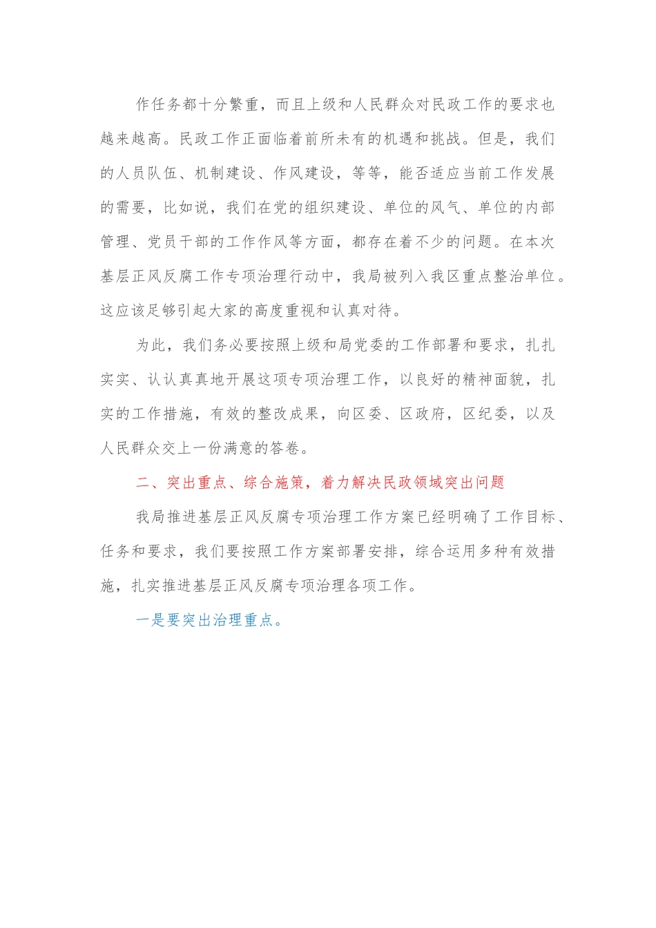 在局推进基层正风反腐工作会议上的讲话同志们:今天召开这次会议主要是贯彻落实3月24日我区基层正风反腐专项治理工作会议精神,部署开展我局这项工作。刚才,XXX同志传达了我区推进基层正风反腐专项治理工作会议精神,XXX同志部署了这项工作任务,派驻纪检组XXX组长对基层正风反腐专项治理工作作了重要指示。大家要结合实际,认真抓好贯彻落实。下面,我强调三点意见:一、统一思想、提高认识,充分认识开展推进基层正风反腐专项治理工作的重要意义首先,我们要充分认识到开展基层正风反腐工作,是旗帜鲜明讲政治的具体体现,是推动全面从严治党向纵深发展的应有之义,是厚植党执政基础的重要举措。基层是党的执政之基、力量之源。基层单位同人民群众的联系密切,其不良作风和腐败问题直接损害群众利益。习近平总书记经常强调,”推进全面从严治党,必须做好抓基层、打基础的工作,使每个基层党组织都成为坚强战斗堡垒”。尤其是我们民政部门,与人民群众的联系更密切,是党和政府联系人民群众,尤其是困难群众的桥梁和纽带。民政部门的不良作风和腐败问题,社会危害性极大。其次,我们要充分认识到开展基层正风反腐工作,是当前更好地推进民政工作的必然要求。大家知道,当前我们民政工作的各项工作任务都十分繁重,而且上级和人民群众对民政工作的要求也越来越高。民政工作正面临着前所未有的机遇和挑战。但是,我们的人员队伍、机制建设、作风建设,等等,能否适应当前工作发展的需要,比如说,我们在党的组织建设、单位的风气、单位的内部管理、党员干部的工作作风等方面,都存在着不少的问题。在本次基层正风反腐工作专项治理行动中,我局被列入我区重点整治单位。这应该足够引起大家的高度重视和认真对待。为此,我们务必要按照上级和局党委的工作部署和要求,扎扎实实、认认真真地开展这项专项治理工作,以良好的精神面貌,扎实的工作措施,有效的整改成果,向区委、区政府,区纪委,以及人民群众交上一份满意的答卷。二、突出重点、综合施策,着力解决民政领域突出问题我局推进基层正风反腐专项治理工作方案已经明确了工作目标、任务和要求,我们要按照工作方案部署安排,综合运用多种有效措施,扎实推进基层正风反腐专项治理各项工作。一是要突出治理重点。要着力解决基层单位落实”两个责任”不力的问题,进一步加大问责力度,运用好谈话提醒、组织处理、党纪处分等方式方法,切实解决在落实”两个责任”方面存在的突出问题。要认真吸取练溪事件的深刻教训,举一反三,深入查找在工作中存在的问题,切实加以整改。要结合当前正在开展的民政领域风险排查工作,查找当前工作领域中存在的安全隐患,要着力解决违反中央八项规定精神和”四风”问题,深入开展基层作风建设,加大对党员干部违反八项规定精神和”四风”问题线索的排查、督办,对群众有反映但”零报告”的单位进行重点抽查,对”四风”问题查”否”的信访件进行重点督办。要着力解决损害群众利益的突出问题,对救灾救济、优抚安置、福彩公益金、”三公”经费、工程建设等重点领域”雁过拔毛”、截留挪用等”微腐”行为,加大打击力度。要着力解决”为官不为”问题,进一步加强监督执纪力度,特别是在办理群众事务中的滥用职权、乱收乱罚、吃拿卡要、欺压群众等”乱作为”问题;在职权范围内可以解决的问题能办不办,以及在开展民政服务机构普查和安全隐患排查专项行动中工作不力等”不作为”问题。要着力解决基层单位内部管理和工作人员作风方面的突出问题,特别是当前有的单位,单位内部不团结,单位员工风气不正,经常造谣、诬陷、捏造事件恶意进行投诉;有的单位,工作人员责任心不强,对上级决策部署落实不力,对区委、区政府中心工作任务、督办事项跟进不到位,对保密、信息等工作抓得不紧;有的单位,大局意识、集体意识不强,习惯于各家自扫门前雪,工作斤斤计较、不肯吃亏,缺乏全局一盘棋思想;有的单位,服务意识淡薄,经常被群众投诉;一些工作人员,工作不认真负责,自由散漫,得过且过,等等。二是要突出抓好整改。查找问题只是手段,抓好整改才是目的。各科室、单位要针对存在的问题,结合自身实际...