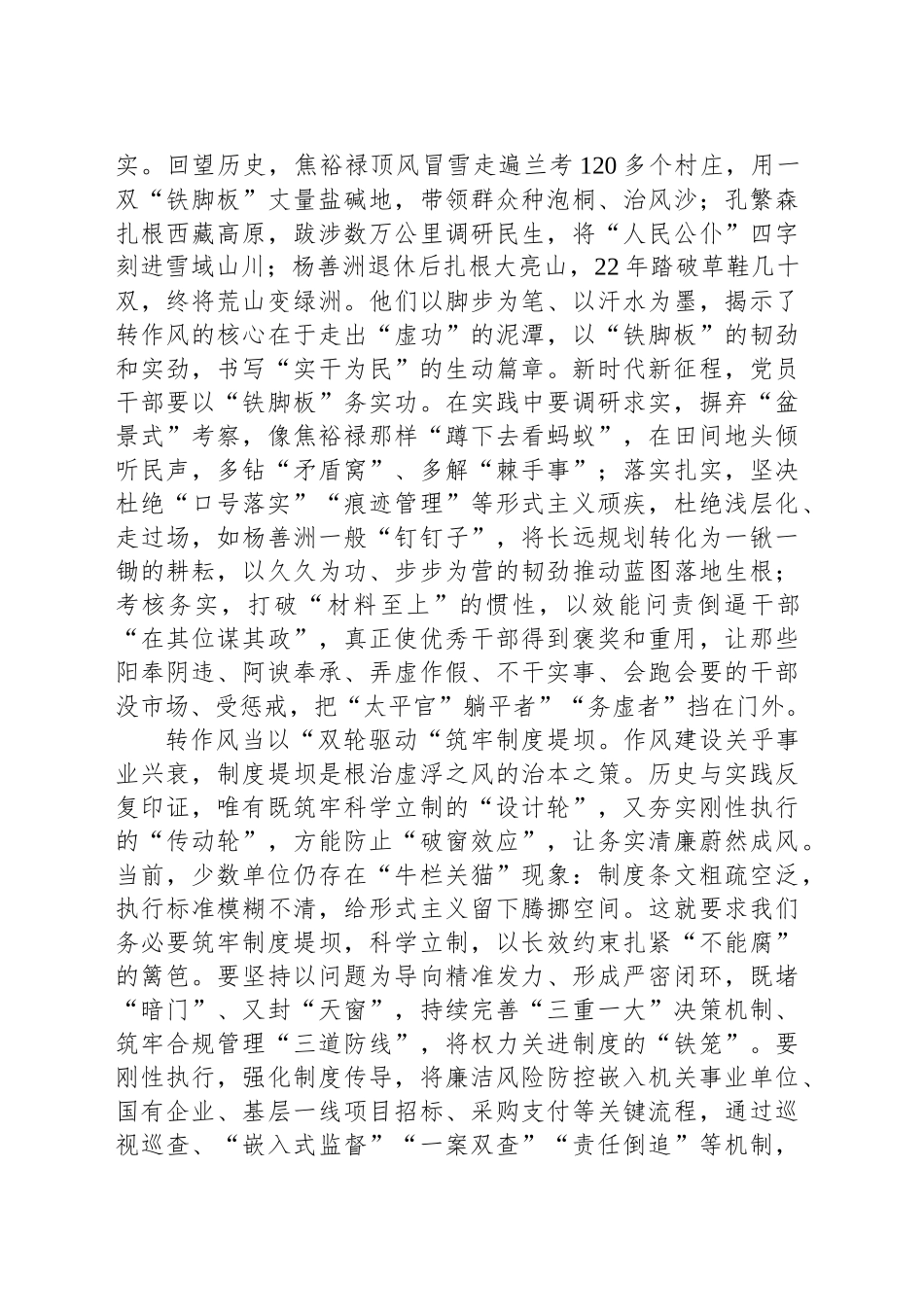 基层干部学习中央八项规定精神研讨发言:以古鉴今扬正气固本浚源树新风大禹治水“三过家门而不入”,李冰父子以竹笼卵石筑都江堰惠泽千年,张謇“实业为民”拓荒南通……中华五千年文明史,无不镌刻着“为官一任,造福一方”的治世基因。从《尚书》“民惟邦本”的治国箴言,到今日中央八项规定精神的落地生根,作风建设始终是贯通古今的政治命题。党员干部应砥砺“永远在路上”的思想自觉,勤勉务实转作风、尽心履职解民忧,扣正每一粒扣子、晒透每一张清单、做实每一次走访,以实绩实效为“中国之治”夯基垒土、积厚成势。转作风当以“绣花功夫”厚植为民情怀。北宋吕本中《官箴》有言:“当官之法,惟有三事:曰清、曰慎、曰勤。此言如镜,照见古今为官者的得失。然观当下,少数党员干部热衷于热衷于数据造假,将孤寡老人的求助信息淹没在大量的虚假民情档案中;有的在“美丽乡村”建设中搞“形象工程”“面子工程”,耗资百万“画壁千寻”却“不遮风雨”;有的将“台账厚度”等同于“服务温度”,“民情台账”几十卷,真正解决的民生问题却不足十分之一......说到底,还是政绩观错位,把“为民”当口号,视“留痕”为政绩,面对复杂矛盾时“不会绣花只会刷漆”。作风建设永远在路上,深入贯彻中央八项规定精神,要以“绣花功夫”校准价值坐标,真正把群众的急难愁盼扛在肩上、放在心上,多当“跑堂员”记录民情,多解决“鸡毛蒜皮”回应民声,“解剖麻雀“解民忧”、“精准滴灌”办实事、“以文化人“聚民心,把惠民生、暖民心、顺民意的工作做到群众心坎上。转作风当以“铁脚板”破除虚功之弊。作风之变,重在务实。回望历史,焦裕禄顶风冒雪走遍兰考120多个村庄,用一双“铁脚板”丈量盐碱地,带领群众种泡桐、治风沙;孔繁森扎根西藏高原,跋涉数万公里调研民生,将“人民公仆”四字刻进雪域山川;杨善洲退休后扎根大亮山,22年踏破草鞋几十双,终将荒山变绿洲。他们以脚步为笔、以汗水为墨,揭示了转作风的核心在于走出“虚功”的泥潭,以“铁脚板”的韧劲和实劲,书写“实干为民”的生动篇章。新时代新征程,党员干部要以“铁脚板”务实功。在实践中要调研求实,摒弃“盆景式”考察,像焦裕禄那样“蹲下去看蚂蚁”,在田间地头倾听民声,多钻“矛盾窝”、多解“棘手事”;落实扎实,坚决杜绝“口号落实”“痕迹管理”等形式主义顽疾,杜绝浅层化、走过场,如杨善洲一般“钉钉子”,将长远规划转化为一锹一锄的耕耘,以久久为功、步步为营的韧劲推动蓝图落地生根;考核务实,打破“材料至上”的惯性,以效能问责倒逼干部“在其位谋其政”,真正使优秀干部得到褒奖和重用,让那些阳奉阴违、阿谀奉承、弄虚作假、不干实事、会跑会要的干部没市场、受惩戒,把“太平官”躺平者”“务虚者”挡在门外。转作风当以“双轮驱动“筑牢制度堤坝。作风建设关乎事业兴衰,制度堤坝是根治虚浮之风的治本之策。历史与实践反复印证,唯有既筑牢科学立制的“设计轮”,又夯实刚性执行的“传动轮”,方能防止“破窗效应”,让务实清廉蔚然成风。当前,少数单位仍存在“牛栏关猫”现象:制度条文粗疏空泛,执行标准模糊不清,给形式主义留下腾挪空间。这就要求我们务必要筑牢制度堤坝,科学立制,以长效约束扎紧“不能腐”的篱笆。要坚持以问题为导向精准发力、形成严密闭环,既堵“暗门”、又封“天窗”,持续完善“三重一大”决策机制、筑牢合规管理“三道防线”,将权力关进制度的“铁笼”。要刚性执行,强化制度传导,将廉洁风险防控嵌入机关事业单位、国有企业、基层一线项目招标、采购支付等关键流程,通过巡视巡查、“嵌入式监督”“一案双查”“责任倒追”等机制,倒逼干部敬畏制度,以“火眼金睛”的智慧监管、“刀刃向内”的问责勇气、“带电长牙”的刚性执行激活“不敢怠”的效能。公文范文文库网站①【公文堂】:www.gongwentang.com公文范文文库网站②【公文堂】:www.gongwentang.com请各位用户务必收藏好以上两个网站,收藏好网址,终身可访问或下载全站公文范文客服微信:gongwentangkf微信公众号:【公文堂】
