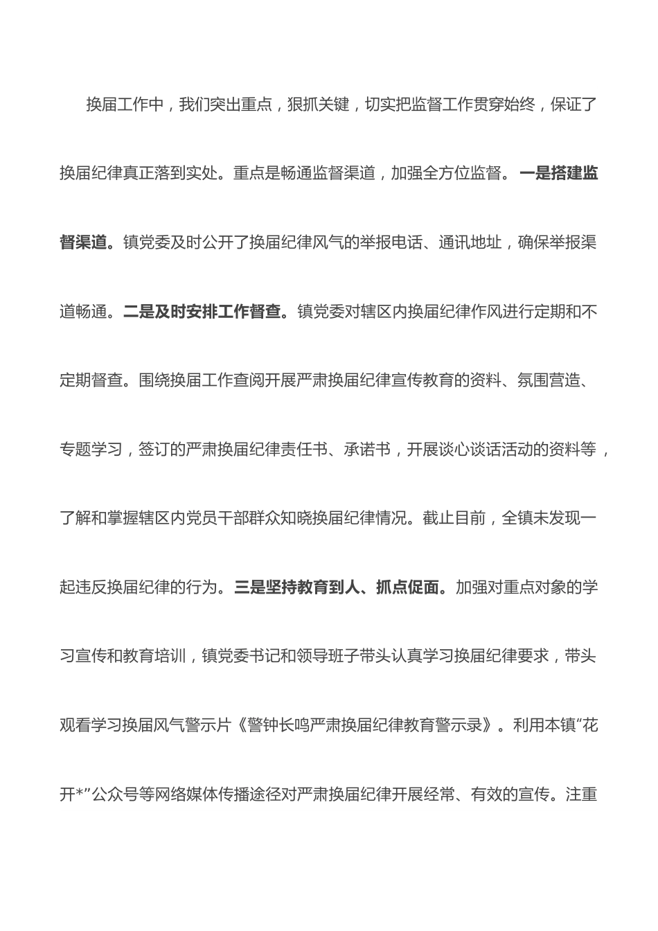 镇换届风气的工作汇报为严肃换届工作纪律,营造风清气正的换届环境,根据中央及省、市、县对换届工作的相关要求,*镇高度重视对换届工作纪律作风的监督。现将有关工作总结如下:一、强化组织领导镇党委坚持把严肃纪律作为保证换届工作质量的关键,强化领导,整合力量,周密部署,加大监督力度,切实将严肃换届纪律的要求落到实处。一是配强工作力量。由于换届选举工作的政治性、政策性强,时间紧、任务重,为确保我镇换届工作风清气正,镇党委对此高度重视,切实把镇换届纪律督查工作摆上重要的议事日程,由镇纪委对辖区内换届工作进行定期和不定期督查。二是加强业务培训。镇党委召开了换届纪律监督工作培训会,对具体负责换届监督工作的相关人员开展全员培训,就换届基本程序、关键环节、注意事项、监督内容、监督方式等进行业务辅导,确保每一名相关负责人员职责明确、政策熟悉、程序清楚。在此基础上,将中央及省、市、县提出的换届纪律要求作为业务培训的重要内容,让每一名工作组成员提高思想认识,明确工作要求,确保各项监督措施落到实处。三是制定周密方案。在认真贯彻上级有关要求的基础上,研究制定了《*镇换届风气舆情监控机制与应急处置预案》,明确了严肃换届纪律的工作部署、教育、监督、宣传、考核等方面项主要措施,为换届工作顺利进行提供有力保证。二、狠抓工作落实换届工作中,我们突出重点,狠抓关键,切实把监督工作贯穿始终,保证了换届纪律真正落到实处。重点是畅通监督渠道,加强全方位监督。一是搭建监督渠道。镇党委及时公开了换届纪律风气的举报电话、通讯地址,确保举报渠道畅通。二是及时安排工作督查。镇党委对辖区内换届纪律作风进行定期和不定期督查。围绕换届工作查阅开展严肃换届纪律宣传教育的资料、氛围营造、专题学习,签订的严肃换届纪律责任书、承诺书,开展谈心谈话活动的资料等,了解和掌握辖区内党员干部群众知晓换届纪律情况。截止目前,全镇未发现一起违反换届纪律的行为。三是坚持教育到人、抓点促面。加强对重点对象的学习宣传和教育培训,镇党委书记和领导班子带头认真学习换届纪律要求,带头观看学习换届风气警示片《警钟长鸣严肃换届纪律教育警示录》。利用本镇“花开*”公众号等网络媒体传播途径对严肃换届纪律开展经常、有效的宣传。注重扩大教育覆盖面,切实做到换届工作纪律领导干部熟悉、工作人员精通、党员群众了解。三、下步工作打算结合全镇换届工作推进实际情况,镇党委本着教育在先、警示在先、预防在先的工作原则,下一步,将采取以下工作举措:一是进一步强化教育管理。进一步加大对党员干部的教育和管理,尤其是对换届工作纪律宣传教育,进一步统一思想,深化认识,为换届工作顺利进行夯实思想基础和组织基础。二是进一步强化宣传引导。要继续加强对换届纪律的宣传,多管齐下,通过网络媒体平台、党务公开栏、标语、资料发放等方式,加大宣传力度,确保不留宣传死角,进一步营造风清气正的换届氛围。三是进一步强化舆情掌控。在镇村干部对群众的深入走访中加强对换届工作推进过程中的民情监控,确保换届工作中的舆情掌握及时到位,提升换届工作效率。四是进一步强化监督和督查力度。充分发挥镇纪委的作用,通过定期和不定期督查,保持对违反换届纪律行为的高压态势,以零容忍态度,狠抓严肃换届纪律风气监督工作,确保全镇换届纪律风清气正。