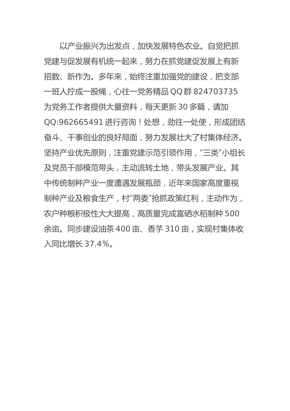 村党支部先进事迹事迹材料××村有7个村民小组,总户数355户1549人。村“两委”定补干部4人,党员47人,荣获2017年、2021年全县先进基层党组织;县第十五届、十六届文明村镇。此次乡村振兴示范村建设的主题为“清水墅田”,在建设过程中注重党建+乡村治理,利用村民理事会、老党员、优秀乡贤等力量,在矛盾纠纷调处、危旧土坯房拆除等方面积极作为,为统筹推进“五个振兴”发挥重要作用。以组织振兴为总抓手,不断夯实基层基础。严格按照基层党建“三化”建设提质增效和质量过硬各项要求,不断夯实基层战斗堡垒。投资50万元新建村部大楼,建筑面积530平方米,合理规范内设布局,规范悬挂各类标识牌,定期及时公开“三务”内容,实现村级组织活动场所“改头换面”,便民为民功能明显改善。在做好“三会一课”等常规性学习交流活动的基础上,经常性组织党员教育培训,发挥党员“十带头”作用,发扬了苏区干部好作风精神,打造一支有信仰、有梦想、有底线的农村党员干部队伍。坚持“四议两公开”制度,“三会一课”、主题党日、党员积分制管理等各项制度规范化运行。聚焦疫情防控、乡村振兴两大“主战场”,引导党员积极投身志愿服务、公益事业、乡村治理,汇聚最强工作合力,确保乡村振兴战略蓝图变成现实。以产业振兴为出发点,加快发展特色农业。自觉把抓党建与促发展有机统一起来,努力在抓党建促发展上有新招数、新作为。多年来,始终注重加强党的建设,把支部一班人拧成一股绳,心往一党务精品QQ群824703735为党务工作者提供大量资料,每天更新30多篇,请加QQ:962665491进行咨询!处想,劲往一处使,形成团结奋斗、干事创业的良好局面,努力发展壮大了村集体经济。坚持产业优先原则,注重党建示范引领作用,“三类”小组长及党员干部模范带头,主动流转土地,带头发展产业。其中传统制种产业一度遭遇发展瓶颈,近年来国家高度重视制种产业及粮食生产,村“两委”抢抓政策红利,主动作为,农户种粮积极性大大提高,高质量完成富硒水稻制种500余亩。同步建设油茶400亩、香芋310亩,实现村集体收入同比增长37.4%。以人才振兴为着力点,全力培育优势企业。高质量完成村“两委”换届选举工作,共选出4名新一届村“两委”班子,充实信息员、党建宣传员队伍,顺利实现了“两升一降”目标。坚持在产业发展中发现人才、培养人才、启用人才,积极物色高学历知识青年、致富带头人等进行重点培养,逐步建立了一支高素质的后备干部队伍。鼓励大学生反哺家乡,吸引在外优秀乡贤4人回乡创业,形成能力带动、共谋发展的良好局面,打造出兴田种养专业合作社、铭鑫农业合作社、友晴制衣厂、乐团高新农业技术发展有限公司等一大批优势企业,涌现出了等行业致富带头人。以文化振兴为落脚点,推动精神文明建设再提升。村内文化(富民)广场、农家书屋等文化阵地配备齐全。现今在每年秋收后,各大戏班争相开台演戏庆祝家中嫁娶或是子女升学等喜事。村“两委”借此契机合理规范戏曲文化,以村内富民广场为核心,借娱乐舞台变政策宣讲平台,弘扬了与社会主义核心价值观相契合,与文明公约、村规民约相融合的健康文明新风尚,实行民主议事,组织党员、村民代表以及村小组长代表集中讨论制定了《××村人居环境整治村规民约》,以制度管人,引导村民自觉抵制陈规陋习,树立优良家风、文明乡风。以生态振兴为突破口,扎实推进美丽乡村建设。突出“两轴”,以串联各产业基地为主轴线,以村民出行道路为辅助线,大力提升轴线村组道路周边人居环境,改善出行道路条件,打造乡村旅游观光路线。建设“三点”,古韵篱乡点挖掘当地古村文化,传承优良家规家训,体现古村古色历史文化;墅美庭香点传承好擂茶、坑生酒、肉丸、年糕等地方特色小吃,实现“家家有产业,户户有小吃”。村域集散点形成制种、香芋、茶油产业片区,修复古道茶亭等,形成综合性农旅体验区,吸引人气,带动村民致富。逐步实现从“村容整洁”到“生态宜居”的转变。