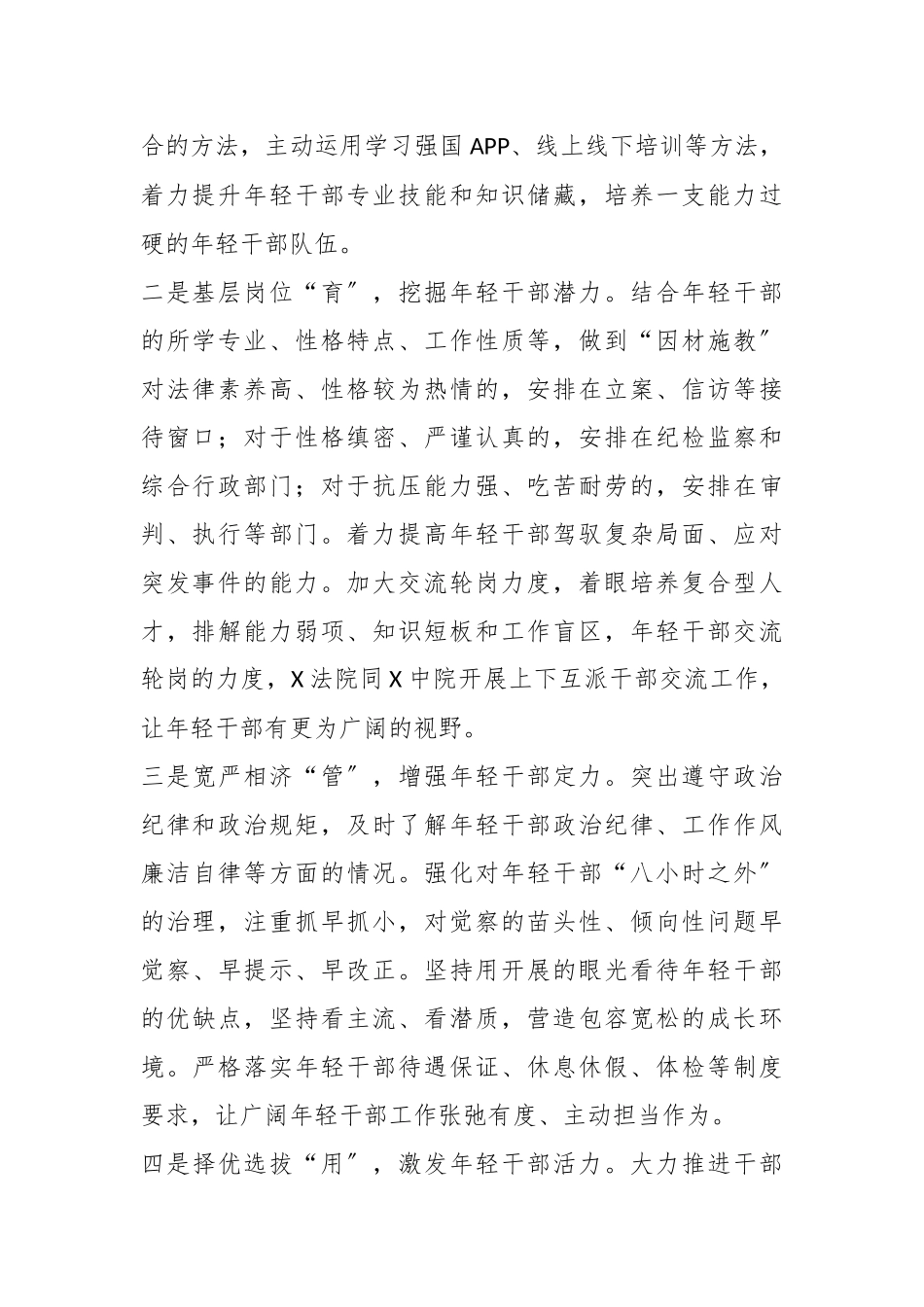 法院青年干部队伍建设调研汇报按照省高院、市中院的要求,我院对年轻干部情况进行深刻细致的调研汇报,现将我院年轻干部调研情况汇报如下:一、X法院年轻干部根本情况我院现有年轻干部X人,其中员额法官X人,审判辅助人员X人,司法行政人员和司法警察X人。按照省高院、市中院关于培养选拔优秀年轻干部的工作要求,我院推举优秀年轻干部建议人选X人,其中特别优秀的X人。年轻干部及选调生按照招录岗位特点和党组统一安排,工作在立案、审判、执行及政工、党建、宣传等各个岗位,是我院各项工作的中流砥柱。近年来,我院十分重视对年轻干部和选调生的培养,积极组织年轻干部参加上级法院的各类培训和讲座,提升他们的业务能力和水平。同时,我们积极开展政治理论学习,举办丰富多彩的文体活动,提升年轻干部的党性修养,为他们搭建展示才华的平台。一是突出重点“学〞,提升年轻干部能力。坚持把提升年轻干部队伍综合素养摆在重要位置,引导年轻干部主动学习学习党章党规和法律知识,着力打造一支政治素养过硬法律素养优良的年轻干部队伍。坚持把年轻干部教育培训工作X法院教育培训工作总体规划,采取集中培训与个人自学相结合的方法,主动运用学习强国APP、线上线下培训等方法,着力提升年轻干部专业技能和知识储藏,培养一支能力过硬的年轻干部队伍。二是基层岗位“育〞,挖掘年轻干部潜力。结合年轻干部的所学专业、性格特点、工作性质等,做到“因材施教〞对法律素养高、性格较为热情的,安排在立案、信访等接待窗口;对于性格缜密、严谨认真的,安排在纪检监察和综合行政部门;对于抗压能力强、吃苦耐劳的,安排在审判、执行等部门。着力提高年轻干部驾驭复杂局面、应对突发事件的能力。加大交流轮岗力度,着眼培养复合型人才,排解能力弱项、知识短板和工作盲区,年轻干部交流轮岗的力度,X法院同X中院开展上下互派干部交流工作,让年轻干部有更为广阔的视野。三是宽严相济“管〞,增强年轻干部定力。突出遵守政治纪律和政治规矩,及时了解年轻干部政治纪律、工作作风廉洁自律等方面的情况。强化对年轻干部“八小时之外〞的治理,注重抓早抓小,对觉察的苗头性、倾向性问题早觉察、早提示、早改正。坚持用开展的眼光看待年轻干部的优缺点,坚持看主流、看潜质,营造包容宽松的成长环境。严格落实年轻干部待遇保证、休息休假、体检等制度要求,让广阔年轻干部工作张弛有度、主动担当作为。四是择优选拔“用〞,激发年轻干部活力。大力推进干部能上能下,适时选拔优秀年轻干部担任部门负责人,坚持正确选人用人导向,先后选拔X名优秀年轻干部担任中层正、副职,为X法院各部门注入新生力量。二、培养年轻干部工作中存在的问题和困难:一是年轻干部和选调生人员数量不能满足法院各项工作需要。现如今业务部门案多人少矛盾凸显,综合部门工作量也日趋加大,年轻干部的工作压力与日俱增,为了完成工作任务经常加班加点,“5+2〞“白加黑〞已成常态。二是对于年轻干部和选调生的鼓舞措施不够。员额法官已经单独职务序列,但是法官助理、书记员和司法行政人员的各类待遇与法官差距过大,加之身处基层,晋升渠道狭窄,职业天花板过低,导致一些年轻干部干劲缺少,长此以往必将影响年轻干部的工作积极性。三是上下级互派干部工作成效不够明显。我院严格按照上级法院关于互派干部的工作要求,定期选派优秀年轻干部到上级法院进行锻炼,做好干部交流工作。但从效果来看上下级互派干部交流时间仅为一年,工作时间短,人员变动较大,不利于开展工作,没有达成干部交流的理想效果。四是优秀干部培养和培训工作需要落实做细。据统计,我院参加上级法院线上线下各类培训已达X余次,平均培训时长X小时,且绝大多是线上培训在工作时间开展,且要求全员参加。如正常进行培训,则会导致审判执行工作不能按时开展,影响质效指标,反之则没有到达参训要求。三、对年轻干部队伍建设的意见建议一是抓储藏,拓宽年轻干部X渠道。在编制同意的范围内对干部队伍进行更新补充,为领导班子储藏各方面优秀人才坚持重品行、重基层、重实绩、重公论,注重在急难险重工作中识别年轻干部,严格履行干部提拔程序,采...