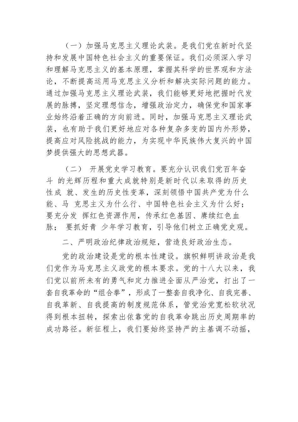 纪检监察干部在全面从严治党主题研讨会上的发言提纲同志们:党的二十届三中全会指出,全面建设社会主义现代化国家、全面推进中华民族伟大复兴,关键在党。作为纪检监察干部,要深入学习贯彻党的二十届三中全会精神和二十届中央纪委二次全会精神,深刻领会“两个确立”的决定性意义,坚定不移推进全面从严治党向纵深发展,为全面建设社会主义现代化国家、全面推进中华民族伟大复兴提供坚强保障。下面,围绕中心组研讨交流主题,我谈几点体会,以供同志们参考。一、坚定理想信念,夯实党的思想根基。思想建党是党的优良传统和政治优势。我们党之所以能够在百年奋斗历程中始终保持蓬勃生机和旺盛活力,根本就在于坚持思想建党、理论强党,始终把马克思主义这一科学理论作为自己的行动指南,坚持在实践中不断丰富和发展马克思主义中国化时代化。新征程上,面对错综复杂的国际国内形势、艰巨繁重的改革发展稳定任务、各种不确定难预料的风险挑战,要实现党的二十届三中全会确定的战略目标,就必须用新时代中国特色社会主义思想凝心铸魂,从思想上正本清源、固本培元,筑牢信仰之基、补足精神之钙、把稳思想之舵。(一)加强马克思主义理论武装。是我们党在新时代坚持和发展中国特色社会主义的重要保证。我们必须深入学习和理解马克思主义的基本原理,掌握其科学的世界观和方法论,不断提高运用马克思主义分析和解决实际问题的能力。通过加强马克思主义理论武装,我们能够更好地把握时代发展的脉搏,坚定理想信念,增强政治定力,确保党和国家事业始终沿着正确的方向前进。同时,加强马克思主义理论武装,也有助于我们更好地应对各种复杂多变的国内外形势,提高应对风险挑战的能力,为实现中华民族伟大复兴的中国梦提供强大的思想武器。(二)开展党史学习教育。要充分认识我们党百年奋斗的光辉历程和重大成就特别是新时代以来取得的历史性成就、发生的历史性变革,深刻领悟中国共产党为什么能、马克思主义为什么行、中国特色社会主义为什么好;要充分发挥红色资源作用,传承红色基因、赓续红色血脉;要抓好青少年学习教育,引导他们树立正确党史观。二、严明政治纪律政治规矩,营造良好政治生态。党的政治建设是党的根本性建设。旗帜鲜明讲政治是我们党作为马克思主义政党的根本要求。党的十八大以来,我们党以前所未有的勇气和定力推进全面从严治党,打出了一套自我革命的“组合拳”,形成了一整套自我净化、自我完善、自我革新、自我提高的制度规范体系,管党治党宽松软状况得到根本扭转,探索出依靠党的自我革命跳出历史周期率的成功路径。新征程上,我们要始终坚持严的主基调不动摇,把严的要求贯彻到管党治党全过程各方面。(一)加强对党忠诚教育。要深刻领悟“两个确立”的决定性意义,坚决做到“两个维护”,不断提高政治判断力、政治领悟力、政治执行力;要强化党的领导核心作用发挥的政治自觉,对“国之大者”心中有数、躬身力行;要发扬斗争精神增强斗争本领,敢于善于同危害党中央权威和集中统一领导的言行作斗争。(二)落实全面从严治党责任。要切实履行全面从严治党主体责任、“一岗双责”,督促党委(党组)运用好监督执纪“第一种形态”,推动各级党组织自觉担负起全面从严治党政治责任;要持续纠治教育医疗、生态环保、安全生产等重点领域腐败和作风问题,严肃查处贪污侵占、吃拿卡要等行为;要把一体推进“三不腐”的理念思路、方式方法融入主体班培训内容之中,推动形成系统集成、协同高效的综合效应。三、着力加强作风建设,确保党风政风清明。党的作风就是党的形象,关系人心向背,关系党的生死存亡。作风建设永远在路上。必须时刻保持解决大党独有难题的清醒和坚定,不畏浮云遮望眼、乱云飞渡仍从容,任何时候任何情况下都要做到知敬畏、存戒惧、守底线。(一)落实中央八项规定精神。要从政治高度认识贯彻落实中央八项规定精神的重要性必要性紧迫性,准确把握实质要求与具体实践的结合点契合点;要在思想上纠治四风突出问题,自觉抵制歪风邪气侵蚀;要在行动上把握贯彻落实中央八项规定及其实施细则精神的细节点具体点。(二)整治形式主义官僚主义。要持续为基...
