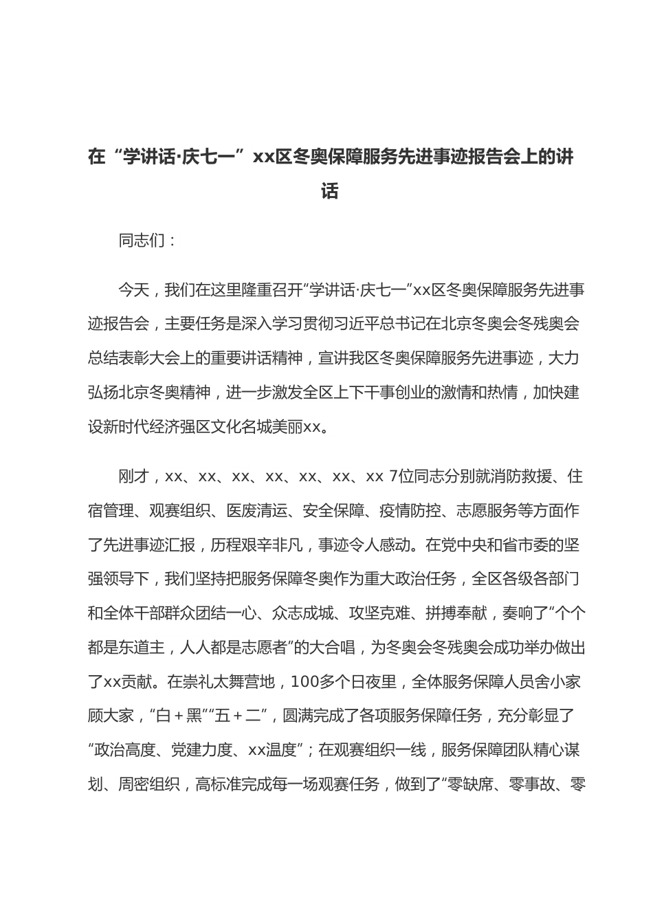 在“学讲话·庆七一”xx区冬奥保障服务先进事迹报告会上的讲话同志们:今天,我们在这里隆重召开“学讲话·庆七一”xx区冬奥保障服务先进事迹报告会,主要任务是深入学习贯彻习近平总书记在北京冬奥会冬残奥会总结表彰大会上的重要讲话精神,宣讲我区冬奥保障服务先进事迹,大力弘扬北京冬奥精神,进一步激发全区上下干事创业的激情和热情,加快建设新时代经济强区文化名城美丽xx。刚才,xx、xx、xx、xx、xx、xx、xx7位同志分别就消防救援、住宿管理、观赛组织、医废清运、安全保障、疫情防控、志愿服务等方面作了先进事迹汇报,历程艰辛非凡,事迹令人感动。在党中央和省市委的坚强领导下,我们坚持把服务保障冬奥作为重大政治任务,全区各级各部门和全体干部群众团结一心、众志成城、攻坚克难、拼搏奉献,奏响了“个个都是东道主,人人都是志愿者”的大合唱,为冬奥会冬残奥会成功举办做出了xx贡献。在崇礼太舞营地,100多个日夜里,全体服务保障人员舍小家顾大家,“白+黑”“五+二”,圆满完成了各项服务保障任务,充分彰显了“政治高度、党建力度、xx温度”;在观赛组织一线,服务保障团队精心谋划、周密组织,高标准完成每一场观赛任务,做到了“零缺席、零事故、零感染”;在疫情防控战场,医护人员白衣执甲、无畏坚守,防疫人员严守第一入口、周密细致排查,筑起了阻击疫情的坚固防线;在服务保障点位,公安、交通、电力、住宿、餐饮、消防、通信等各条战线的干部职工恪尽职守、倾情奉献,为赛会顺利进行保驾护航;在各个站点窗口,广大志愿者用心用情、热忱服务,传递出xx的友爱和温暖;在新闻宣传战线,媒体工作者和宣传工作人员精心策划、精彩呈现,讲出了娓娓动人的冬奥故事、展示了悠久厚重的古城文化;在城乡大街小巷,基层党员干部、社区工作者等群体默默无闻、无私奉献,打造出清洁靓丽的城乡面貌。回首过往,一个个奔忙而坚定的身影、一张张疲惫却坚毅的面孔、一次次平凡而伟大的举动,都值得我们镌刻于心、永远铭记,每一位坚守岗位的劳动者都是了不起的英雄。在此,我谨代表区委、区人大、区政府、区政协,向所有亲历这场大战大考的参与者、奋斗者、奉献者,表示衷心地感谢和崇高的敬意!今天作报告的7位同志,是全区广大党员干部爱岗敬业、拼搏奉献的缩影。胜利源于奋斗,实干开创未来。今年是党的二十大召开之年,在七一建党节来临之际,我们隆重举行冬奥保障服务先进事迹报告会,就是要大力弘扬北京冬奥精神,传承保障服务冬奥宝贵经验,热烈庆祝建党101周年。深刻缅怀党的光辉历程和丰功伟绩,深入学习习近平总书记系列重要讲话精神,特别是视察张家口时的重要指示精神,扎实开展“学总书记讲话,谋张家口发展”活动和“解放思想、真抓实干,交好本地发展优异答卷”大讨论,时刻牢记党员干部的职责和使命,在推进全区经济社会高质量发展的实践中履职尽责、建功立业,以实际行动为党旗增辉添彩。一要坚定理想信念,始终对党忠诚。对党忠诚,是政治合格的底线,是对每一名共产党员的根本要求。各级党员干部要坚持以习近平新时代中国特色社会主义思想为指导,深入学习习近平总书记系列重要讲话精神,真正做到融入日常、抓在经常,真正实现学思践悟、知行合一,不断提高政治判断力、政治领悟力、政治执行力,忠诚捍卫“两个确立”、坚决做到“两个维护”,永葆共产党人的政治本色。要把理想信念转化为履职尽责的实际行动,积极投身到产业转型、城市建设、疫情防控、维护稳定等主战场,充分发挥先锋模范作用,争做创先争优的表率,努力在平凡的岗位上做出不平凡的业绩。二要深入解放思想,激发内生动力。当前国际国内环境发生着深刻变化,面对统筹疫情防控与经济社会发展双重压力,党中央提出“疫情要防住经济要稳住、发展要安全”总要求。对于正处于转型关键期的xx来讲,今年是xx滚石上山、爬坡过坎的转型年、困难年,也是解放思想、奋发进取的机遇年、赶超年。实现省市委提出的交出高质量发展优异答卷,实现xx高质量转型发展,前提和基础就是解放思想、打开一切工作的“总阀门”,让思维活跃起来,精神振奋起来,切实查找不足,主动对标先进,努力实现坡道加...