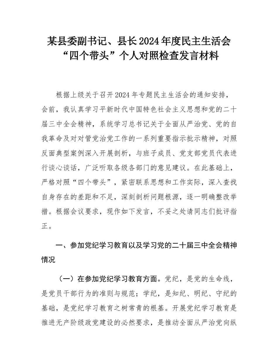 某县委副书记、县长2024年度民主生活会“四个带头”个人对照检查发言材料根据上级关于召开2024年专题民主生活会的通知安排,会前,我认真学习平新时代中国特色社会主义思想和党的二十届三中全会精神,系统学习总书记关于全面从严治党、党的自我革命及对对管党治党工作的一系列重要指示批示精神,对照反面典型案例深入开展剖析,与班子成员、党支部党员代表进行谈心谈话,广泛听取各级各部门的意见建议。在此基础上,严格对照“四个带头”,紧密联系思想和工作实际,深入查找自身存在的差距和不足,深刻剖析问题根源,逐一明确整改举措。根据会议要求,现作如下发言,不妥之处请同志们批评指正。一、参加党纪学习教育以及学习党的二十届三中全会精神情况(一)在参加党纪学习教育方面。党纪,是党的生命线,是党员干部行为的准则与规范;学纪,是知纪、明纪、守纪的基础,是党纪学习教育之树常青的根基。开展党纪学习教育是推进无产阶级政党建设的必然要求,是推动全面从严治党向纵深发展的现实需要。党纪学习教育开展以来,我围绕“学纪、知纪、明纪、守纪”,坚持以学铸魂、以学增智、以学正风、以学促干,通过个人自学、中心组集中学、专题研讨交流、带头讲纪律党课等形式,深入、系统学习新修订的《中国共产党纪律处分条例》,准确、全面把握深刻内涵和主旨要义,切实让遵规守纪刻印在心,内化为言行准则,推动思想淬炼融入日常、党性锤炼抓在经常。通过参加此次党纪学习教育,我的政治思想觉悟有了新的提高,政治定力、纪律定力、道德定力、抵腐定力得到全面增强,更加深刻地认识到党纪是党的生命,是确保党的先进性、纯洁性的重要保障,纪律规矩意识进一步牢固树立。(二)在学习党的二十届三中全会精神方面。党的二十届三中全会是在以中国式现代化全面推进强国建设、民族复兴伟业的关键时期举行的一次具有划时代、里程碑意义的重要会议,总书记在全会上所作的工作报告和发表的重要讲话,高屋建瓴、思想深邃、内涵丰富、催人奋进,具有很强的政治性、理论性、战略性和指导性,为我们进一步全面深化改革、推进中国式现代化指明了前进方向、提供了根本遵循。全会召开后,我及时跟进学习全会新思想、新论述、新精神,对标贯彻党中央决策部署,逐项细化推进我县全面深化改革重点事项,建立完善工作台账,科学制定推进举措,不仅做政治上的“明白人”,还要做落实上的“行动派”,以时不我待、只争朝夕的精神,抢抓机遇、应对挑战、破解难题,推动全会精神在全县落地生根、开花结果。二、存在的突出问题(一)带头严守政治纪律和政治规矩,维护党的团结统一方面。我坚持把政治理论学习摆在自身建设首要位置,积极参加党纪学习教育,带头严守政治纪律和政治规矩,牢固树立“四个意识”、坚定“四个自信”、做到“两个维护”,自觉在思想上政治上行动上同以同志为核心的党中央保持高度一致。但通过认真查摆,仍发现一些问题不足:一是学习的深度不够。虽然坚持集中学习和个人自学相结合,并严格落实县委常委会“第一议题”、县委理论中心组学习、县政府常务会集中学习等制度,但在学习中存在“浅尝辄止”现象,横向拓展延伸学、纵向跟进研讨学不够到位,对党的二十届三中全会新思想蕴藏的丰富内涵和精髓要义领悟不够透彻,理论学习的高度、广度、深度还不够。二是贯彻的力度不够。个别时候存在实用主义思想,自己擅长的、与工作结合较紧的招商引资、项目建设、城乡发展等领域内容学的多一些、深一些,在整体性、主动性、系统性上还有提升空间。针对X干部抓招商、抓项目、抓经济能力不足问题,主导推进了干部教育与素质提升行动,并探索选派优秀年轻干部南向学习、深入企业项目一线跟班学习的路子,但仍处于谋划推进阶段,成效还未体现出来。三是成果转化的实效不好。没有真正做到学用结合、知行合一,把学习成果转化为谋划工作的科学思路、领导工作的扎实本领和落实工作的有力举措。比如,在创新发展方面,底子薄、基础差是现实情况,社会整体创新氛围不够浓厚,企业创新主体作用发挥不够充分,成为制约我县经济高质量发展的突出短板。(二)带头增强党性、严守纪律、砥砺作风方面。...