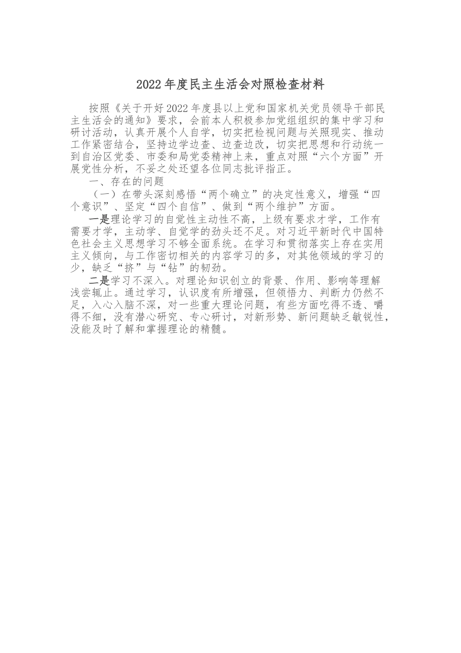 2022年度民主生活会对照检查材料按照《关于开好2022年度县以上党和国家机关党员领导干部民主生活会的通知》要求,会前本人积极参加党组组织的集中学习和研讨活动,认真开展个人自学,切实把检视问题与关照现实、推动工作紧密结合,坚持边学边查、边查边改,切实把思想和行动统一到自治区党委、市委和局党委精神上来,重点对照“六个方面”开展党性分析,不妥之处还望各位同志批评指正。一、存在的问题(一)在带头深刻感悟“两个确立”的决定性意义,增强“四个意识”、坚定“四个自信”、做到“两个维护”方面。一是理论学习的自觉性主动性不高,上级有要求才学,工作有需要才学,主动学、自觉学的劲头还不足。对习近平新时代中国特色社会主义思想学习不够全面系统。在学习和贯彻落实上存在实用主义倾向,与工作密切相关的内容学习的多,对其他领域的学习的少,缺乏“挤”与“钻”的韧劲。二是学习不深入。对理论知识创立的背景、作用、影响等理解浅尝辄止。通过学习,认识度有所增强,但领悟力、判断力仍然不足,入心入脑不深,对一些重大理论问题,有些方面吃得不透、嚼得不细,没有潜心研究、专心研讨,对新形势、新问题缺乏敏锐性,没能及时了解和掌握理论的精髓。三是没有充分运用理论指导实际。在学懂弄通做实习近平新时代中国特色社会主义思想、“四个意识”、“四个自信”、“两个维护”方面,执行力不强。自己没能充分运用创新理论指导工作完成任务,实践经验缺乏,实践经历不丰富,实践积累不全面。在践行为人民服务的宗旨意识上有差距,没能完全以群众的根本利益作为工作的出发点和落脚点。(二)在带头用习近平新时代中国特色社会主义思想凝心铸魂方面。一是在以上率下、推动工作上用心用力不足。用习近平新时代中国特色社会主义思想来认识问题、分析问题、解决问题的能力还不足。比如在协调推进乡村振兴建设上,与县委要求的还有差距,村内脏、乱、差的农户家庭依然存在,给群众宣传教育的多,亲自盯住落实到位的少,给村两委干部要求做的多,实地检验工作成果少。二是落实还不够迅速深入。在具体工作推进中,有时考虑的客观因素过多,反复研究考量,抓落实的时效性还不够。对群众接受程度高、推行阻力小的工作就执行得快一些,反之对一些难度较大的工作就执行得相对慢一些。虽然能对标贯彻执行自治区党委、市委的决策部署,但有时更多是为完成上级交办任务,创新性开展工作不够。三是落实还不够均衡。对习总书记讲话的精神内涵理解不透,对原理方法举一反三不足,理论指导实践不到位,工作的精力分配上有所失衡。本人工作精力过多倾向于***,一定程度上忽视了其他工作,工作重心失衡、不全面、不到位的表现一定程度存在。(三)在带头坚持和加强党的全面领导方面。一是带头抓党建作用没有发挥到位。有时受事务性工作影响,对党建应付抓、被动抓的时候多,没能将年度工作计划、贯彻上级重大决策、阶段性重大工作同党建工作齐抓共管,造成党建工作与业务工作分离脱节。二是在落实全面从严治党责任履行“一岗双责”方面做得不够。对有些工作多注重于留存资料,形式和内容缺乏实效性和针对性。工作纪律要求不够严格,对个别干部中存在的工作作风不实、工作热情不旺、工作劲头不足、工作要求不高、对群众态度蛮横方式简单等现象,加强监督管理方面不到位。(四)在带头学习坚持以人民为中心的发展思想,推动改革发展稳定方面。一是在立足岗位、履职尽责方面存在的差距和不足。对自己的要求还不够严、标准还不够高,锲而不舍、一抓到底、盯住不放的干劲还不足。对实施乡村振兴战略“二十字”方针理解把握还不到位,对深入贯彻落实中央农村工作会议精神特别是习近平总书记重要讲话精神,真抓实干做好新发展阶段“三农”工作,促进农业高质高效,乡村宜居宜业,农民富裕富足工作任务落地见效方面思考领悟不深不透。用学习指导实践、检验工作的效果不高。二是信念基石有待加固。没有常态化坚持用党的理论成果武装头脑,在学思践悟中不断提高思想政治理论水平方面有所欠缺。党员的先锋模范带头作用没有充分发挥,在履行党员的责任和义务,坚定理想信念,尽职尽责为民方面做的...