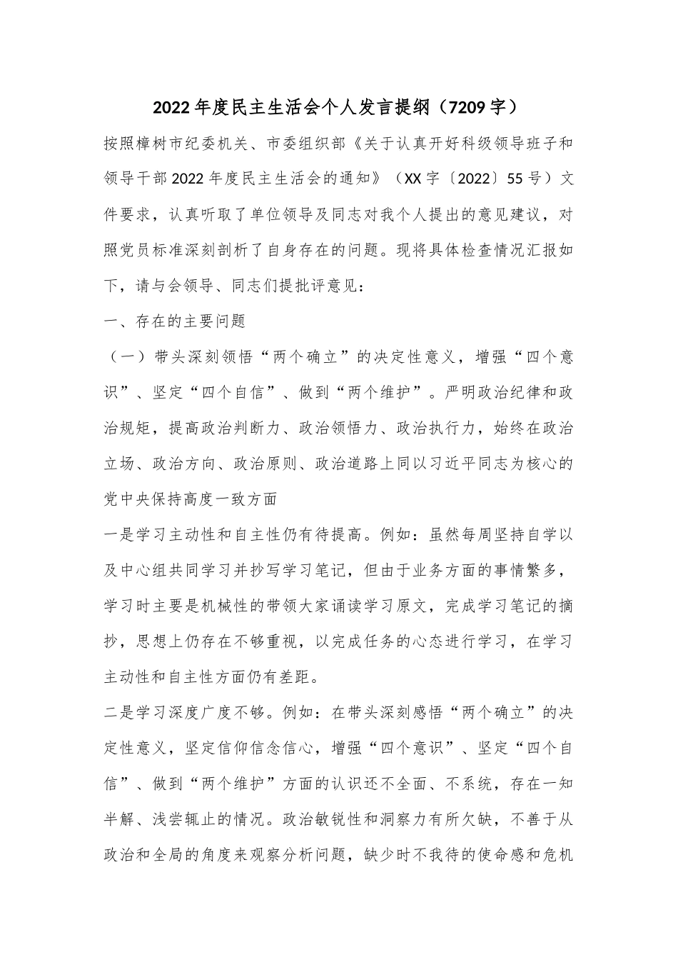 2022年度民主生活会个人发言提纲(7209字)按照樟树市纪委机关、市委组织部《关于认真开好科级领导班子和领导干部2022年度民主生活会的通知》(XX字〔2022〕55号)文件要求,认真听取了单位领导及同志对我个人提出的意见建议,对照党员标准深刻剖析了自身存在的问题。现将具体检查情况汇报如下,请与会领导、同志们提批评意见:一、存在的主要问题(一)带头深刻领悟“两个确立”的决定性意义,增强“四个意识”、坚定“四个自信”、做到“两个维护”。严明政治纪律和政治规矩,提高政治判断力、政治领悟力、政治执行力,始终在政治立场、政治方向、政治原则、政治道路上同以习近平同志为核心的党中央保持高度一致方面一是学习主动性和自主性仍有待提高。例如:虽然每周坚持自学以及中心组共同学习并抄写学习笔记,但由于业务方面的事情繁多,学习时主要是机械性的带领大家诵读学习原文,完成学习笔记的摘抄,思想上仍存在不够重视,以完成任务的心态进行学习,在学习主动性和自主性方面仍有差距。二是学习深度广度不够。例如:在带头深刻感悟“两个确立”的决定性意义,坚定信仰信念信心,增强“四个意识”、坚定“四个自信”、做到“两个维护”方面的认识还不全面、不系统,存在一知半解、浅尝辄止的情况。政治敏锐性和洞察力有所欠缺,不善于从政治和全局的角度来观察分析问题,缺少时不我待的使命感和危机感。(二)带头用习近平新时代中国特色社会主义思想凝心铸魂。坚持用习近平新时代中国特色社会主义思想统一思想、统一意志、统一行动,做到学思用贯通、知信行统一,坚持好、运用好贯穿其中的立场观点方法,自觉把习近平新时代中国特色社会主义思想转化为坚定理想、锤炼党性和指导实践、推动工作的强大力量方面一是抓学习有差距。在个人自学中还存在实用主义倾向,理论学习缺乏连续性、系统性、全面性,没能与时俱进提升政治理论素养。例如:由于平时业务工作繁忙,对习近平新时代中国特色社会主义思想精神理论学习抓得还不够,在学习中有时存在实用主义的思想,用得着的就学,急用急学,学习理论缺乏深度。二是理论与实践的关系处理得不够融治。学习“习近平新时代中国特色社会主义思想”有时仍存在“蜻蜓点水”的情况。例如:往往对于自己分管工作关联多的内容投入的时间多,对于管理工作不涉及的内容只是简单通读,没有深入细致地研究。在工作中,对涉及管理部门的文件能够认真研读,对于自己工作不涉及的文件,分析得少。(三)带头坚持和加强党的全面领导。认真贯彻民主集中制,创新和改进领导方式,增强党组织政治功能和组织功能,不折不扣把党中央决策部署和习近平总书记关于本地区本部门本单位的重要指示批示精神贯彻落实好,把各领域广大群众组织凝聚好,夯实党执政的根基方面一是抓工作力度不够。抓工作有时走过场,认为安排了既是落实了,存在追求形式、忽略实效,缺乏一竿子到底精神。例如:在医疗质量督导巡查中,有时间会亲自带队到发热门诊、血透、新生儿、ICU等重点科室、重点部门进行督查,但在工作忙时就直接安排下面的人员去进行督查,导致督查的效果差别较大。二是贯彻上级决策部署抓落实还不够。有时对上级的决策部署,站位还不够高,对其深远意义思考不深,一般部署多、具体指导少、跟踪问效少。例如:对安排的工作、提出的要求,常常满足于会上讲了、要求提了、记录做了、文件发了,在赣政通工作群里通知了,有时候发出去的通知自己也没有去仔细审阅就安排发下去,后续工作跟进不够全面,没能很好地做到全时掌控、一线问效,致使有些决策部署没有彻底落实到位。(四)带头坚持以人民为中心的发展思想,推动改革发展稳定。完整准确全面贯彻新发展理念,统筹推进“五位一体”总体布局、协调推进“四个全面”战略布局,紧紧抓住解决不平衡不充分的发展问题,补短板、强弱项、固底板、扬优势,推动经济社会持续健康发展。在发展中保障和改善民生,聚焦解决人民群众急难愁盼问题,让人民群众看到学习贯彻党的XX大精神的实际成效方面一是主动服务人民群众意识不强。作为单位的领导,要管的事情相对较多,有时候为求办事效率只是坐在办公室电话指示,往往...