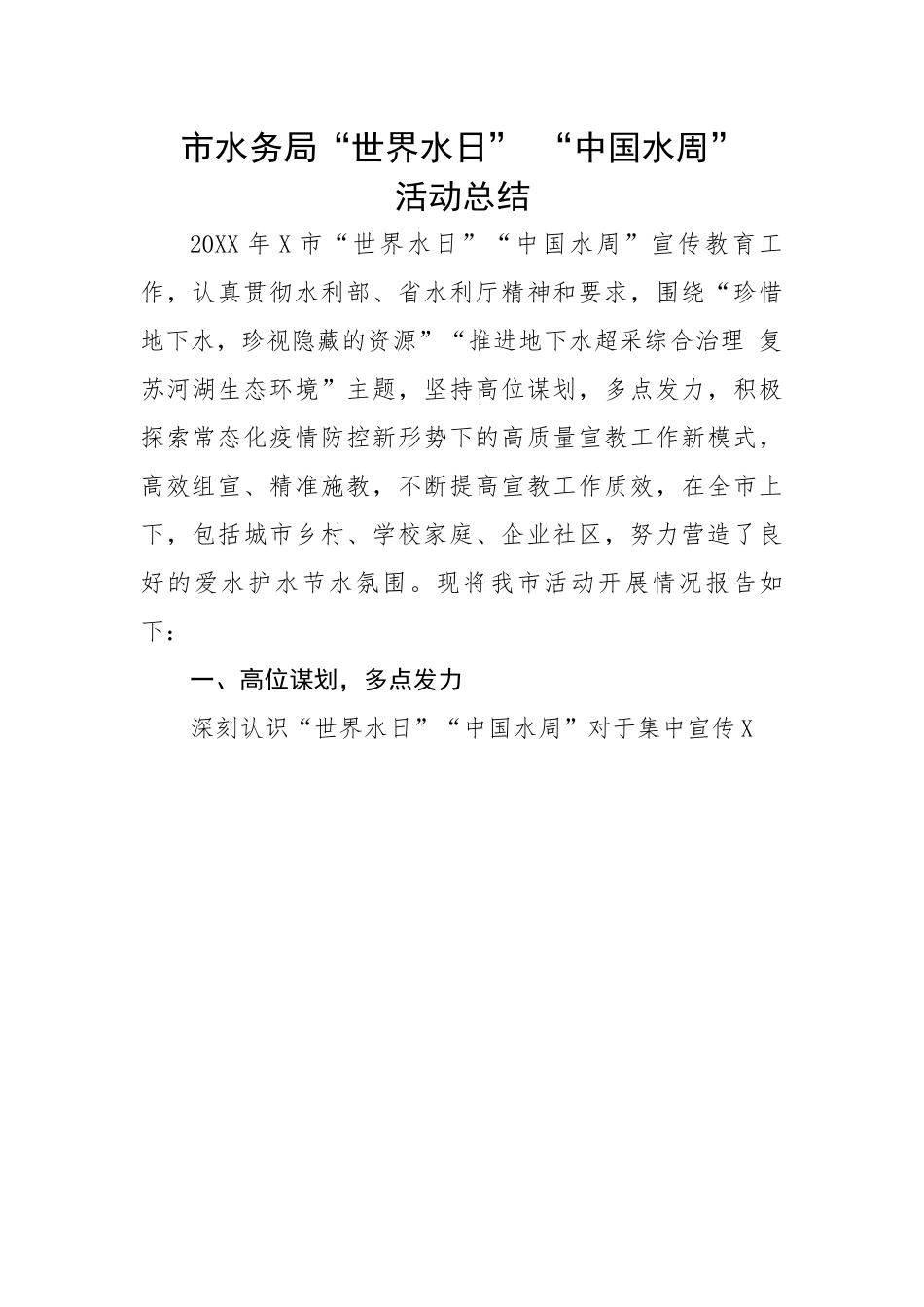 市水务局“世界水日”“中国水周”活动总结20XX年X市“世界水日”“中国水周”宣传教育工作,认真贯彻水利部、省水利厅精神和要求,围绕“珍惜地下水,珍视隐藏的资源”“推进地下水超采综合治理复苏河湖生态环境”主题,坚持高位谋划,多点发力,积极探索常态化疫情防控新形势下的高质量宣教工作新模式,高效组宣、精准施教,不断提高宣教工作质效,在全市上下,包括城市乡村、学校家庭、企业社区,努力营造了良好的爱水护水节水氛围。现将我市活动开展情况报告如下:一、高位谋划,多点发力深刻认识“世界水日”“中国水周”对于集中宣传X这座与水相生相依的超大城市、英雄城市的重大意义,克服疫情防控带来的不利影响,投入足够的时间和精力,高位谋划、系统推进。一是主要领导亲自抓。相关领导、有关处室、局属单位精心策划活动方案,方案落地过程中,坚持难点环节亲自协调,重点环节亲自研究,重要工作亲自督办,做到小活动大精彩、大活动倍精彩,努力让水日水周活动覆盖全域、影响全城。二是相关单位、处室积极领办、承办。市节水办、市江滩办、市执法总队等局属单位充分运用宣传阵地、宣教资源和历年经验,积极主动领办、承办活动任务,按照更高标准、更严要求,创新活动方式,优化活动组织,抓紧时间、有条不紊推进系列活动落地落实。河湖长办、水利水保处等机关处室从专业角度,积极主动发挥作用,进一步细化实化活动内容,加大组织协调力度,齐心协力、群策群力、不遗余力,努力将活动质量再提高、活动效果再增强。三是相关社会组织主动发力。X爱我百湖志愿者协会等公益组织自觉积极参与,将爱水护水见诸行动,江滩志愿者百子歌团队等民间组织围绕主题进行创作、编排、汇演。四是注重加强统筹协调。局办公室加大统筹协调力度,积极对接协调有关部门,用好用足市媒、省媒、央媒等宣传力量、宣传资源、宣传载体,让水周水日活动上升为全市共同关注、支持、参与的大活动,让水周水日宣教成为全市共同投入、共同发力、共同受益的大宣教。二、内外结合,办好办精(一)内抓干部职工宣传教育。一是将《习近平法治思想学习纲要》学习宣传纳入局党组中心组、局机关党支部以及局属单位党支部主题党日学习内容。二是组织全市水务系统参加水利部《地下水管理条例》以及学习习近平总书记“3.14”重要讲话知识网络竞赛,局机关及局属单位全体职工积极参与答题,合格率100%。三是举办“水务大讲堂”(一期)水务规划专题视频培训,深入贯彻落实习近平总书记关于治水系列重要讲话指示批示精神、新时期治水新任务新要求以及《X市水务发展“十四五”规划》,市区两级水务工作人员共200余人参加培训。四是举办泵站水系及节水型泵站主题讲座,探讨泵站爱水护水、节水排水发展新模式。(二)外抓社会公众宣传引导。一是通过局门户网站、微信公众号“X水务”“X节水”、官方微博“江城水声”及水务头条号广泛开展宣传。开辟“世界水日·中国水周”专题,对《长江保护法》《水土保持法》《地下水管理条例》等水法规、中央指示精神、我局贯彻落实措施活动等内容进行集中展示。二是开展有奖答题活动。通过“X水务”公众号推出“世界水日·中国水周”有奖知识问答,水务系统干部职工以及社会公众广泛参与,充分调动大家积极性,营造了良好的爱水护水节水氛围。三是摆摊设点进行集中宣传。3月23日,在汉口江滩举办“面对面听期盼”大走访活动,向往来市民解读《地下水管理条例》《公民节约用水行为规范》等法律法规、科普节水常识、发放纪念品,并让市民朋友填写问卷,工作人员耐心解答提问,收获了市民们的好评。四是利用江滩大屏、广播进行“世界水日”“中国水周”日常宣传。在江滩法治广场、科普长廊摆放宣传展板,电子屏播放《地下水管理条例》以及节水宣传视频,提高了往来游客对水法律法规的深入了解,加强了市民对地下水保护认识。五是发挥新媒体平台优势进行线上宣传。联合百子歌团队创作并拍摄《守护地下水》百子歌群口快板表演,以群众喜闻乐见的形式大力宣传《地下水管理》,宣扬共护地下水人人有责的观念。录制《暴雨风险共防范》三人快板宣传短视频,在抖音、微博视频等平台传播,收...