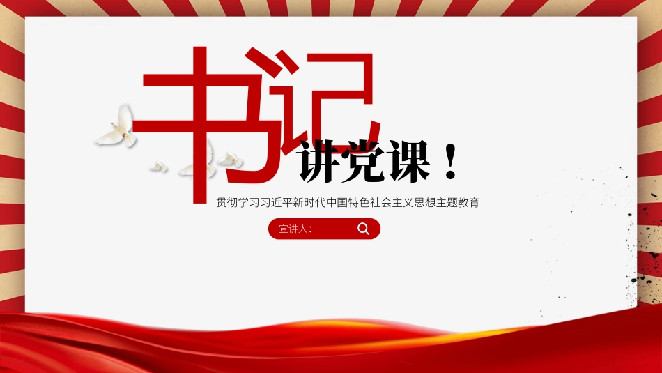 书记讲党课!贯彻学习习近平新时代中国特色社会主义思想主题教育宣讲人:目录O1贯彻学习习近平新时代中国特色社会主义思想主题教育O2习近平:在学习贯彻习近平新时代中国特色社会主义思想主题教育工作会议上的讲话O3下足功夫推进主题教育走深走实—O1—贯彻学习习近平新时代中国特色社会主义思想主题教育贯彻学习习近平新时代中国特色社会主义思想主题教育新时代·新征程O12023年4月3日,学习贯彻习近平新时代中国特色社会主义思想主题教育工作会议在北京召开。习近平总书记在这次会议上强调,强国建设、民族复兴的宏伟目标令人鼓舞、催人奋进,我们这一代共产党人使命光荣、责任重大。我们要以这次主题教育为契机,加强党的创新理论武装,不断提高全党马克思主义水平,不断提高党的执政能力和领导水平,为奋进新征程凝心聚力,踔厉奋发、勇毅前行,为全面建设社会主义现代化国家、全面推进中华民族伟大复兴而团结奋斗。—O2—习近平:在学习贯彻习近平新时代中国特色社会主义思想主题教育工作会议上的讲话一、深刻认识开展这次主题教育的重大意义二、全面准确把握主题教育的目标要求三、切实加强对主题教育的领导习近平:在学习贯彻习近平新时代中国特色社会主义思想主题教育工作会议上的讲话以县处级以上领导干部为重点在全党深入开展学习贯彻新时代中国特色社会主义思想主题教育,是贯彻落实党的二十大精神的重大举措,对于统一全党思想、解决党内存在的突出问题、始终保持党同人民群众血肉联系、推动党和国家事业发展,具有重要意义。这是推动全党积极担当作为、不断开创事业发展新局面的必然要求。这是统一全党思想意志行动、始终保持党的强大凝聚力、战斗力的必然要求。这是深入推进全面从严治党、以党的自我革命引领社会革命的必然要求。一、深刻认识开展这次主题教育的重大意义一、深刻认识开展这次主题教育的重大意义这是统一全党思想意志行动、始终保持党的强大凝聚力、战斗力的必然要求。团结统一是党的生命,是党的力量所在。思想上的统一是党的团结统一最深厚最持久最可靠的保证。我们这么大一个党,领导着这么大一个国家,肩负着带领全国各族人民实现国家强盛、民族复兴这个艰巨任务,全党必须统一思想、统一意志、统一行动。怎么实现全党思想、意志、行动的统一?最根本的就是用党的基本理论武装全党。我们党始终高度重视理论武装,每逢重大历史关头,都要用党的创新理论统一全党思想,每次党内集中教育也都坚持把理论学习作为首要任务并贯穿始终,为全党团结统一奠定坚实思想基础。今天,我们党带领全国各族人民迈上了全面建设社会主义现代化国家、全面推进中华民族伟大复兴的新征程,要更好肩负起新时代新征程党的使命任务,迫切需要用新时代中国特色社会主义思想武装头脑、指导实践、推动工作。党的十八大以来,伴随着新时代中国特色社会主义思想在实践中形成发展的历程,我们持续推动用党的创新理论武装全党,取得了明显成效。但是,理论武装的任务仍然艰巨。一方面,在真学真信真用、学懂弄通做实方面,还存在一些需要引起重视的问题。有的党员、干部理论学习兴趣不浓,学不进去,学习走形式装样子;有的学习不系统不深入,一知半解、浅尝辄止,知其然不知其所以然;有的学用脱节,学归学做归做,不善于把学习成果转化为干事创业的实际本领,等等。这些问题表明,党的理论武装工作不能搞形式,必须持续往深里走、往实里走。另一方面,党的创新理论在不断发展,党的二十大提出了一系列重大思想、重大观点,党的二十大以来在阐述党的二十大精神过程中又提出了一些新观点,特别是提出并系统阐述了中国式现代化这个重大理论和实践问题,进一步丰富了新时代中国特色社会主义思想。这方面的学习贯彻才刚刚开始。因此,在新征程开局起步之际,必须继续推动全党深入学习贯彻新时代中国特色社会主义思想。历史和现实表明,理论学习不深入不彻底,思想统一就没有基础,党的团结统一就会受到严重影响。132这次主题教育,要在推动学习贯彻新时代中国特色社会主义思想走深走实上下功夫,教育引导党员、干部从思想上正本清源、固本培元,不断提高政治判断力、政治领悟力、政治...